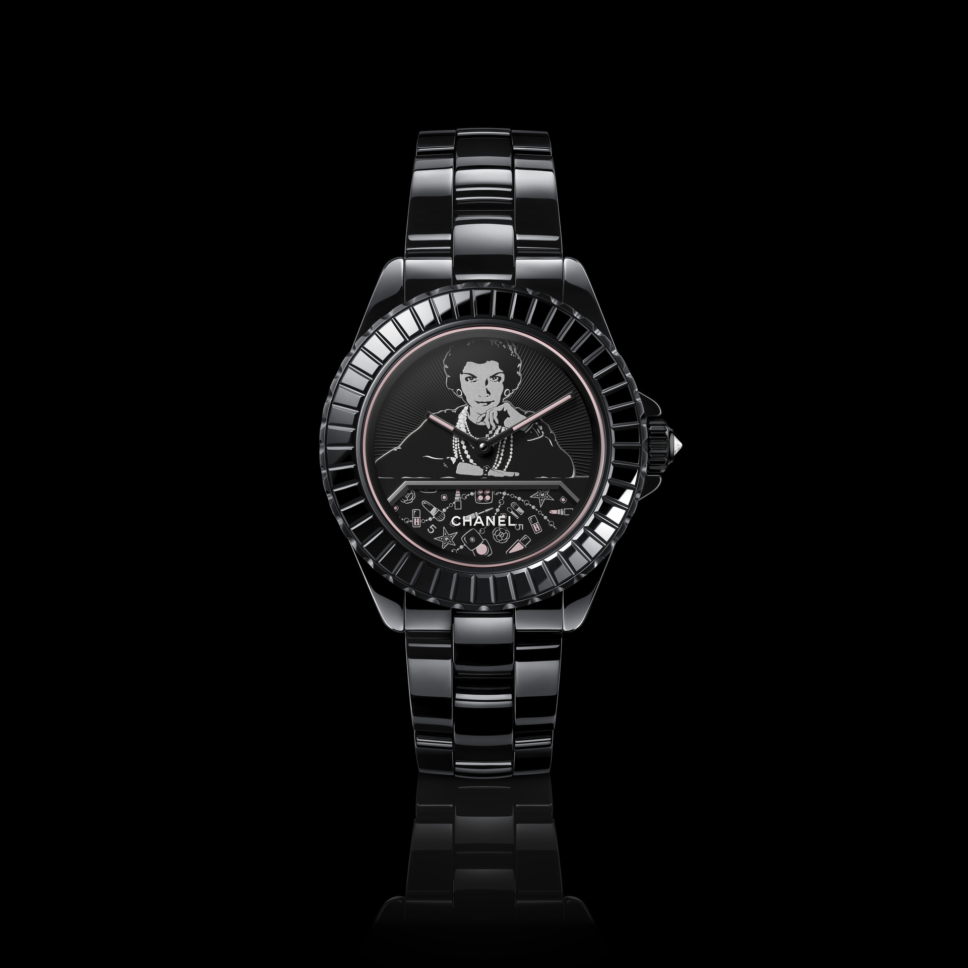 J12 表款与美妆灵感的又一结合,香奈儿女士的形象跃入这款 MADEMOISELLE J12 BLUSH WATCH CALIBER 12.1 的表盘上,以黑白两色描绘,表盘上的化妆台散布着她的美妆单品,由银色与粉色调的转印图案演绎,口红、粉饼随转盘每5分钟旋转一圈颇为有趣。这回,香奈儿女士更成为了时间的讲述者。