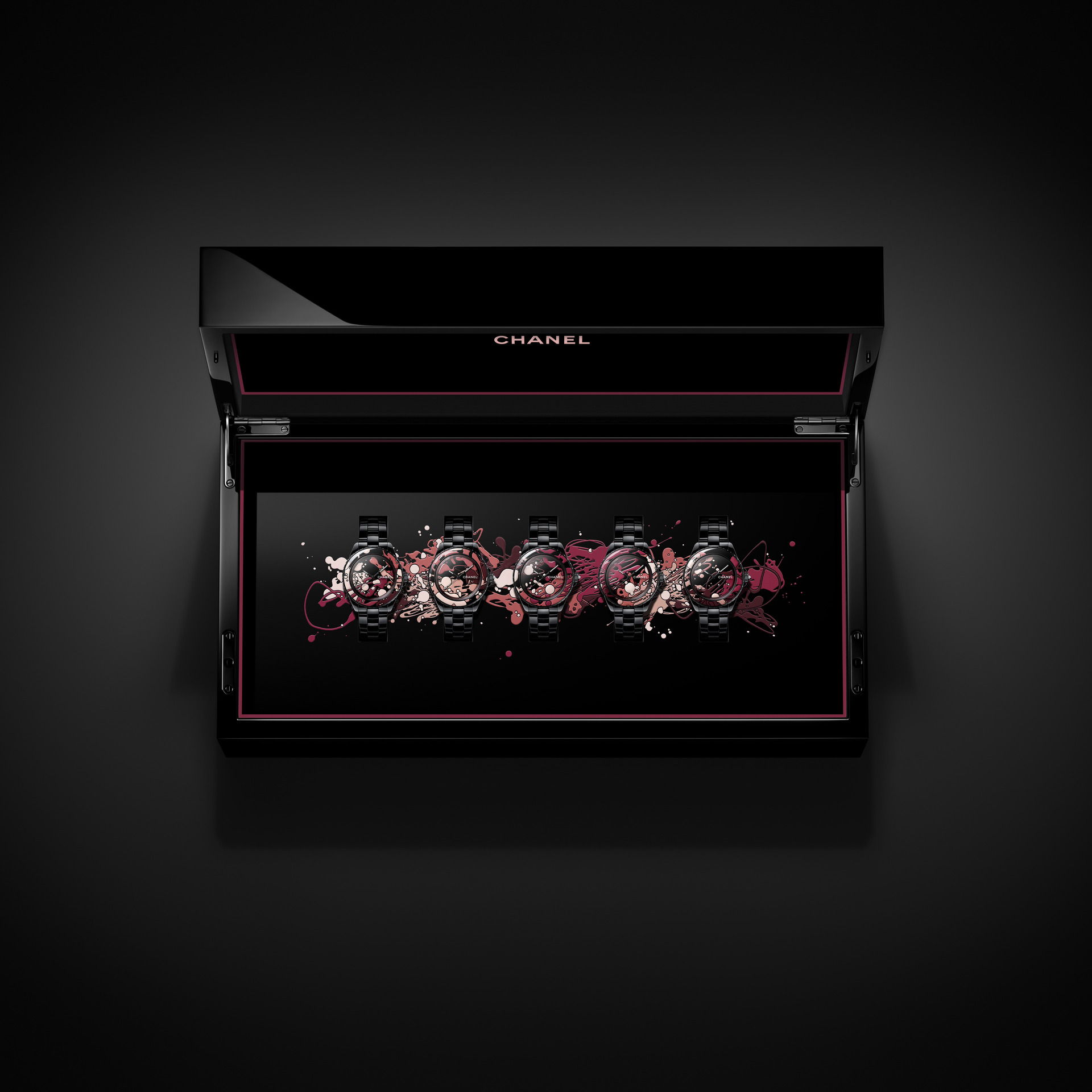 J12 BOX “DRIPPING ART” 腕表礼盒堪称艺术、工艺与创意的至臻结合,这五枚一组的 J12 表款灵感便源自滴画艺术,重现指甲油滴落表盘的刹那,开发团队历经上百次色彩测试,耗费 200 小时的研究,才透过大明火珐琅工艺实现指甲油流淌在精密陶瓷上一般的效果,这组腕表透过泼溅图案相连又各自相异,每一枚表盘都是独一无二的艺术真迹。