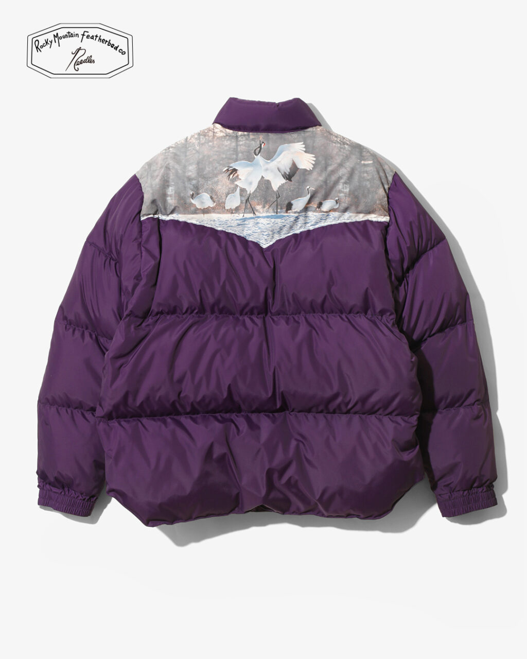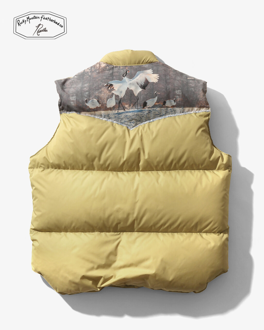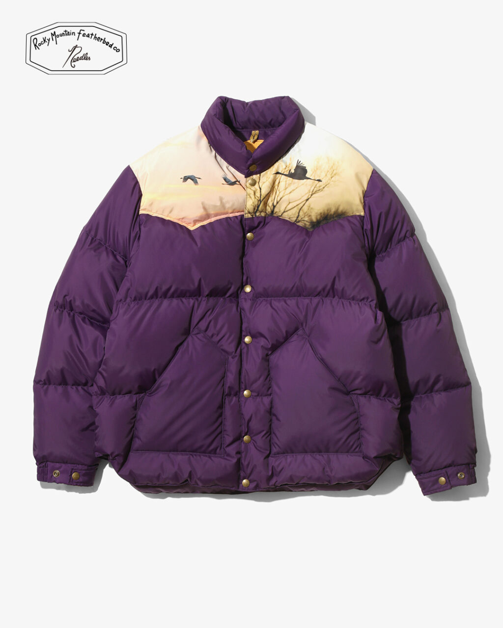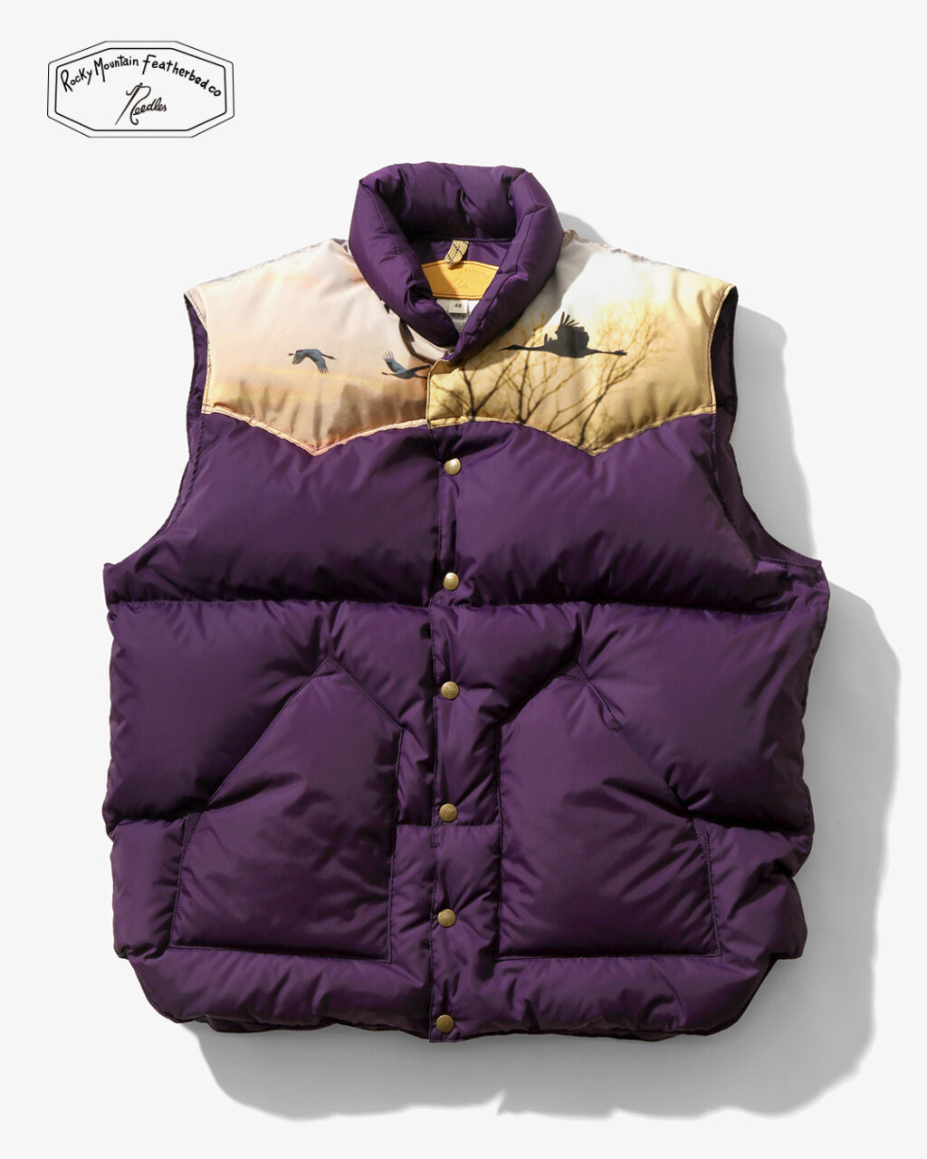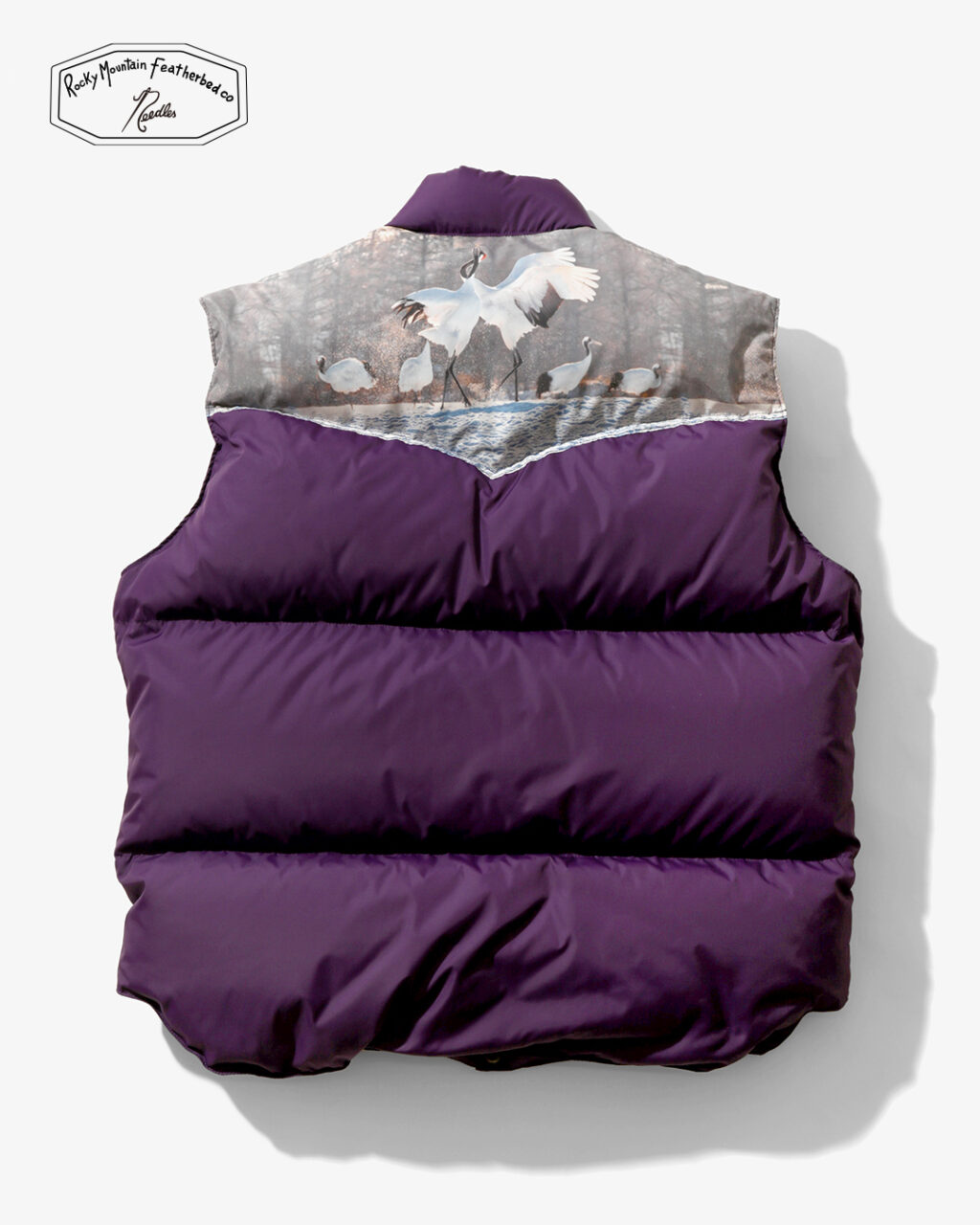 NEEDLES 与美国经典羽绒品牌 Rocky Mountain Featherbed 推出了首次合作。此次合作的一大亮点在于:刻意不采用通常由一整块面料制作的设计,而是在胸以上部分印有丹顶鹤在黄昏、雪原中翩翩起舞的照片。该系列包括两种类型——羽绒服和背心,其外层和内层衬里均采用 70D 尼龙塔夫绸制成,填充物则为 700 蓬松度欧洲防水羽绒,用来确保高水平的保暖性和轻盈舒适的穿着体验。两款产品均提供米色、紫色和黑色三种选择,将于 10 月 18 日(星期六)在 NEPENTHES 官网及线下店发售。