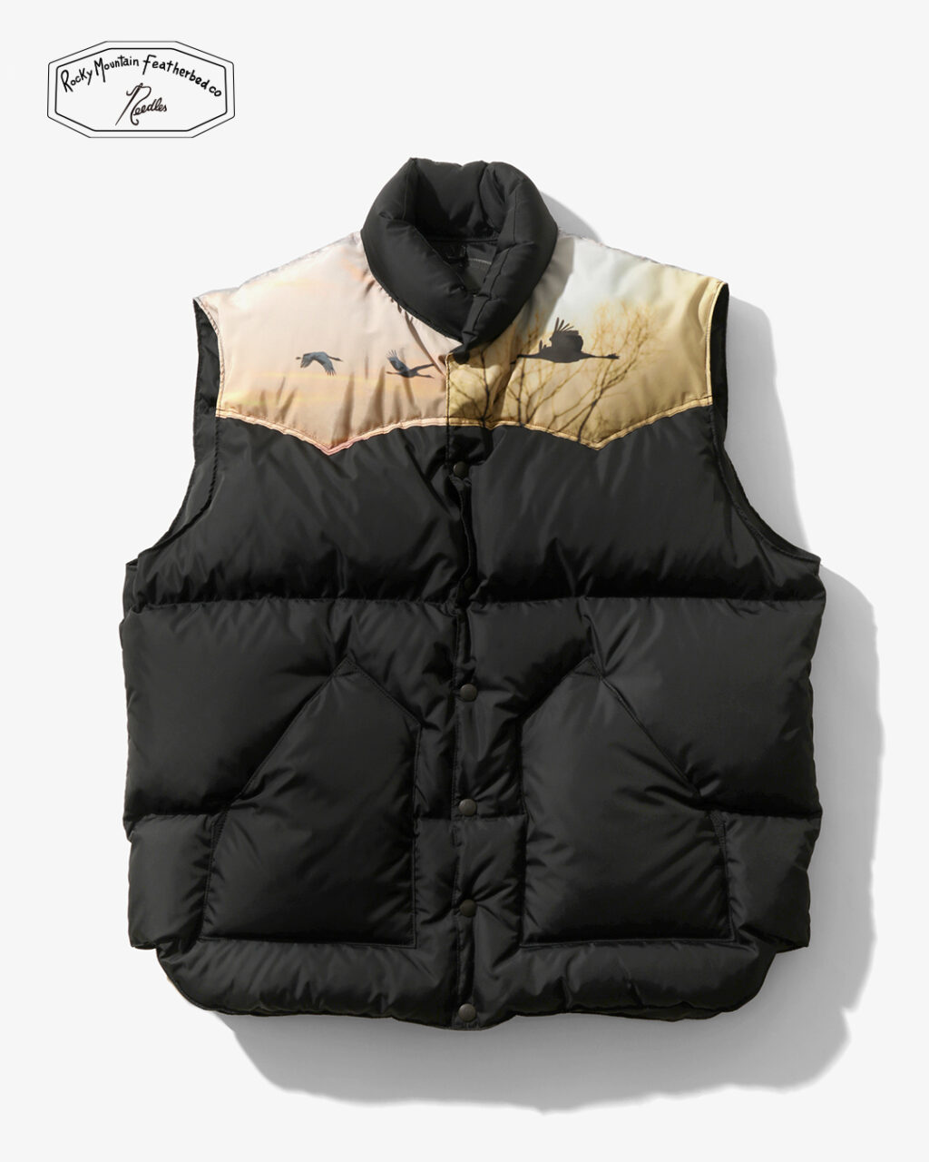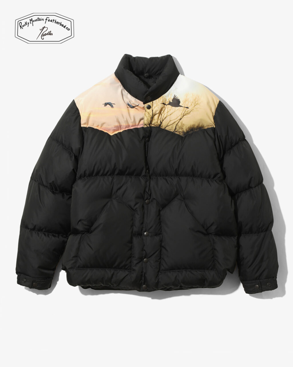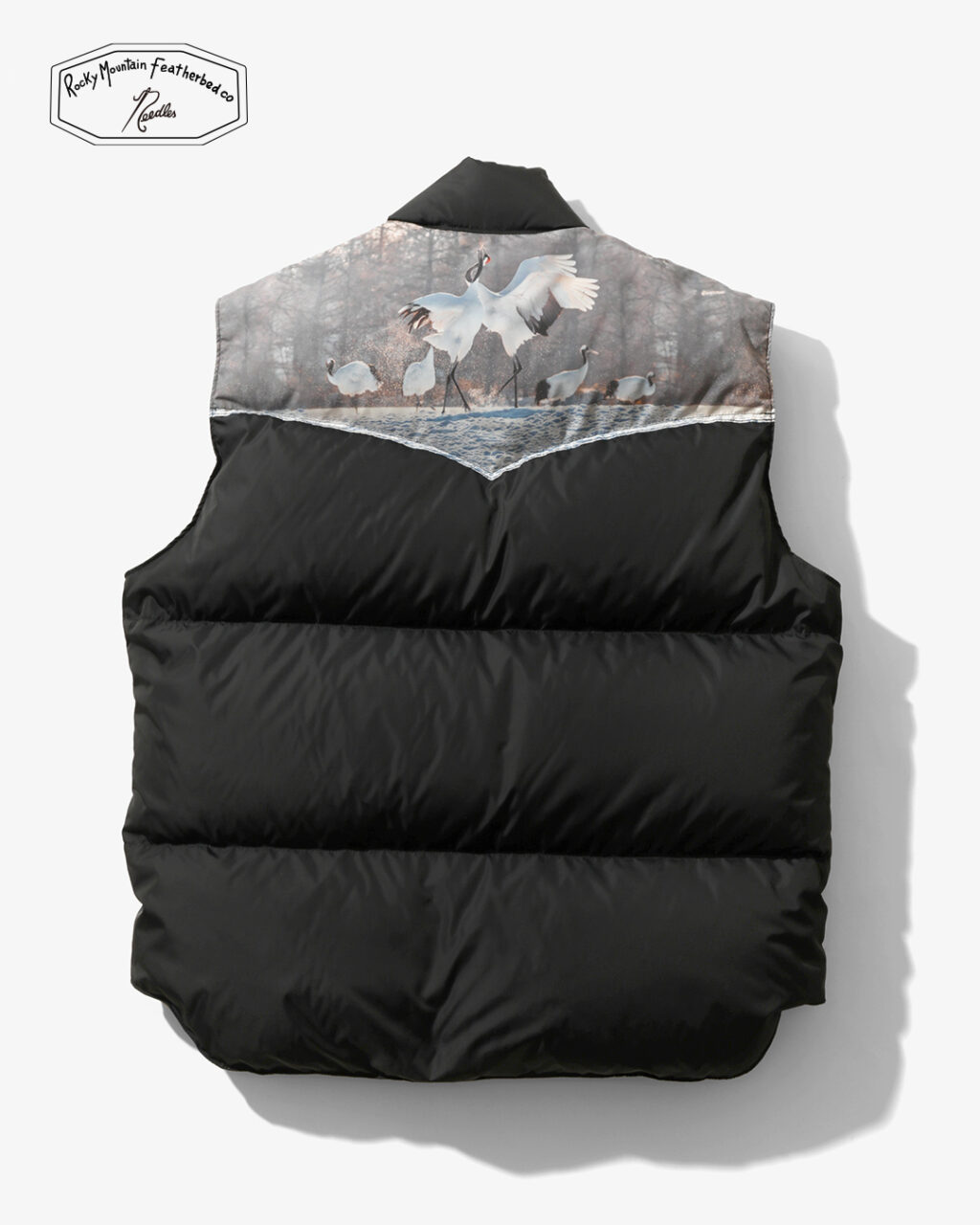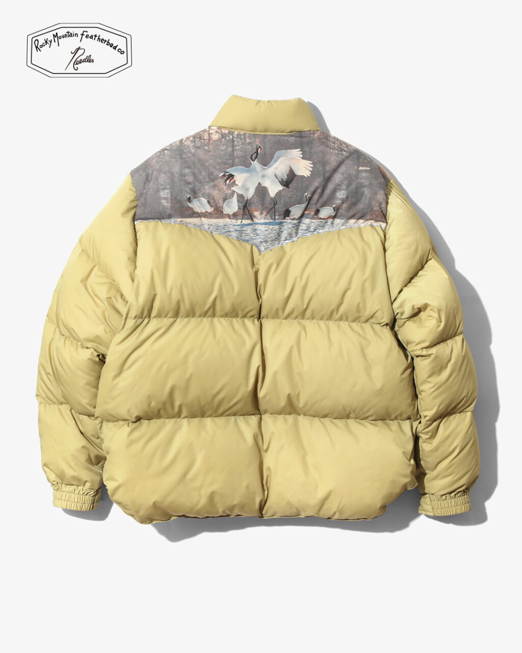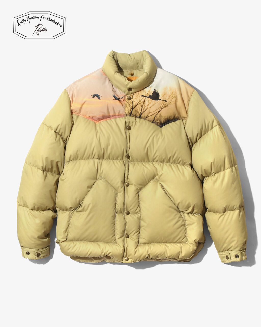 NEEDLES 与美国经典羽绒品牌 Rocky Mountain Featherbed 推出了首次合作。此次合作的一大亮点在于:刻意不采用通常由一整块面料制作的设计,而是在胸以上部分印有丹顶鹤在黄昏、雪原中翩翩起舞的照片。该系列包括两种类型——羽绒服和背心,其外层和内层衬里均采用 70D 尼龙塔夫绸制成,填充物则为 700 蓬松度欧洲防水羽绒,用来确保高水平的保暖性和轻盈舒适的穿着体验。两款产品均提供米色、紫色和黑色三种选择,将于 10 月 18 日(星期六)在 NEPENTHES 官网及线下店发售。