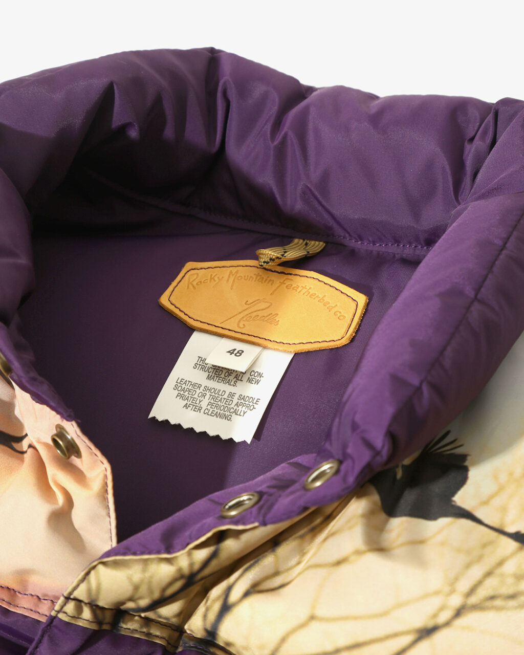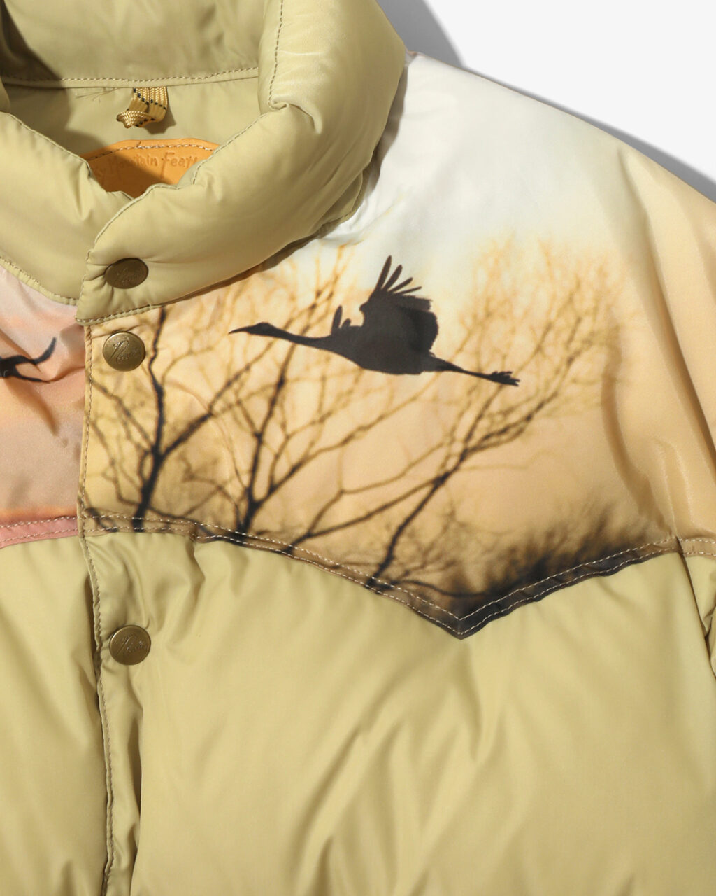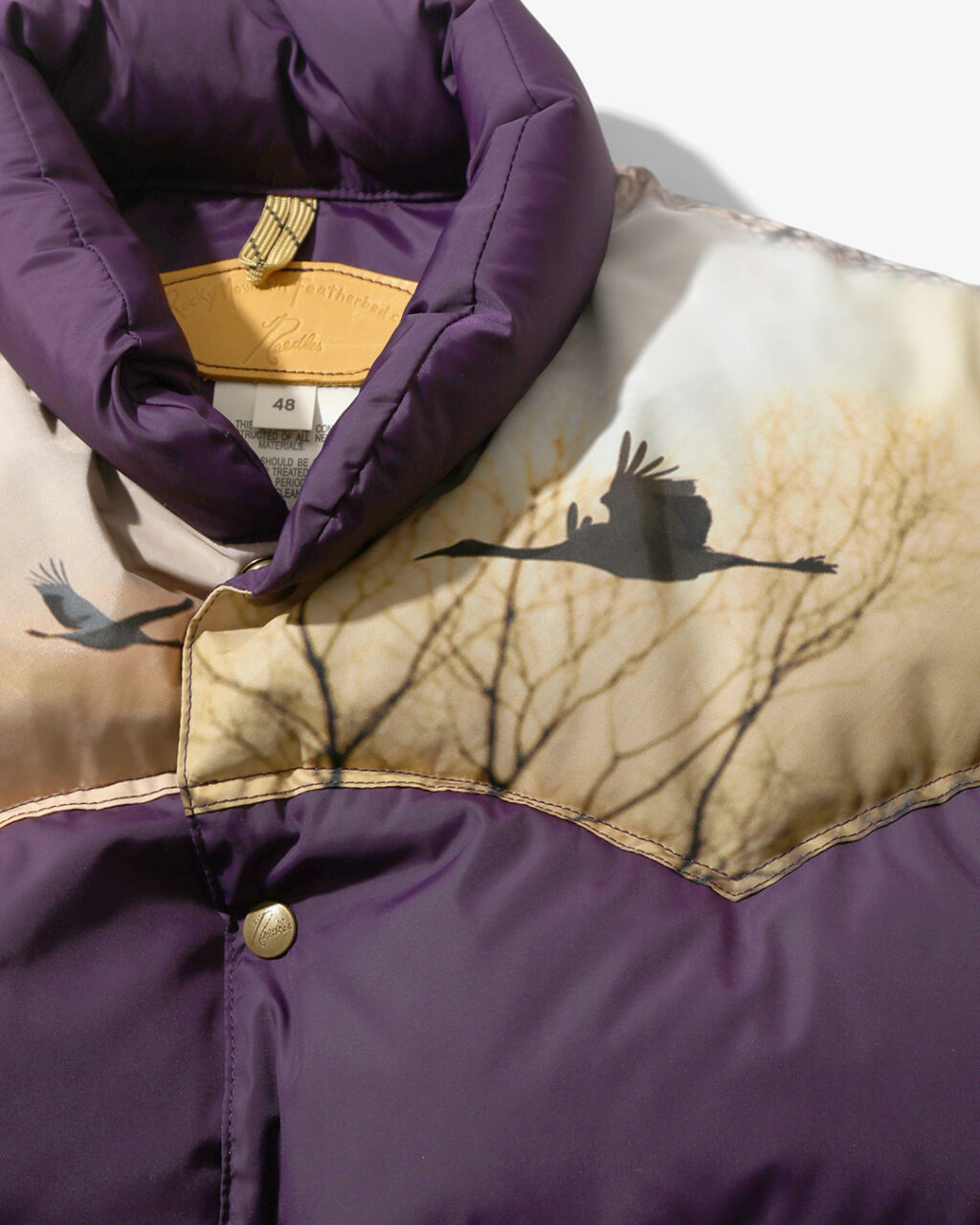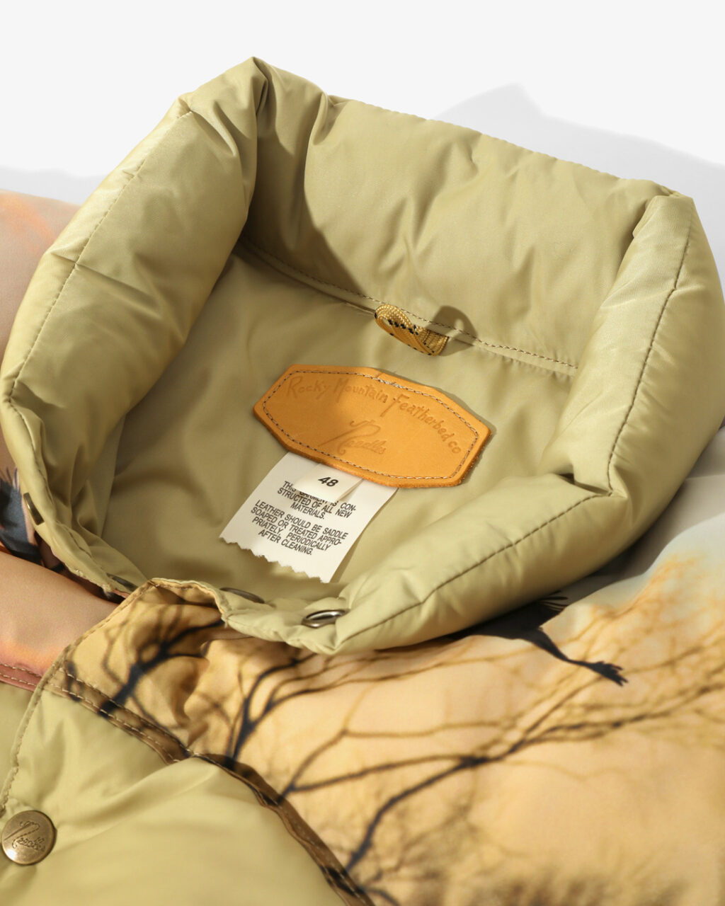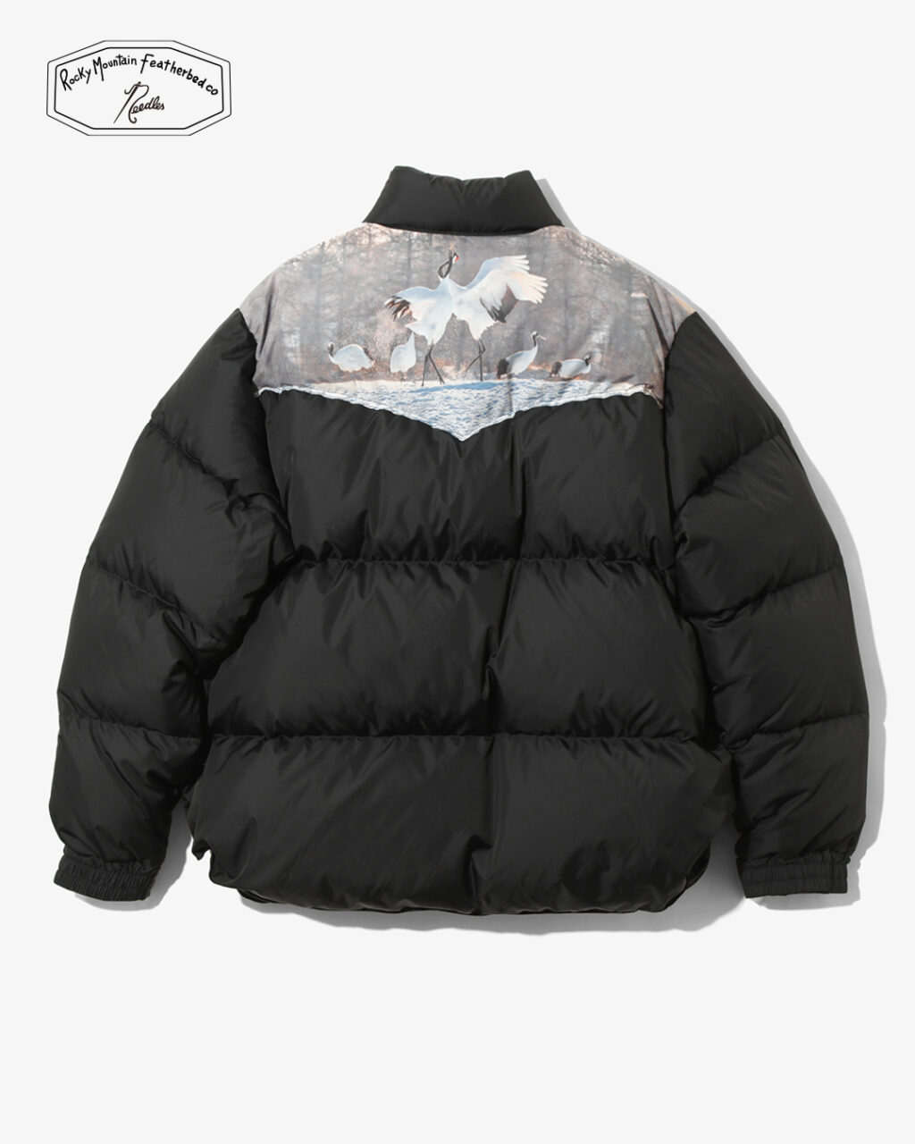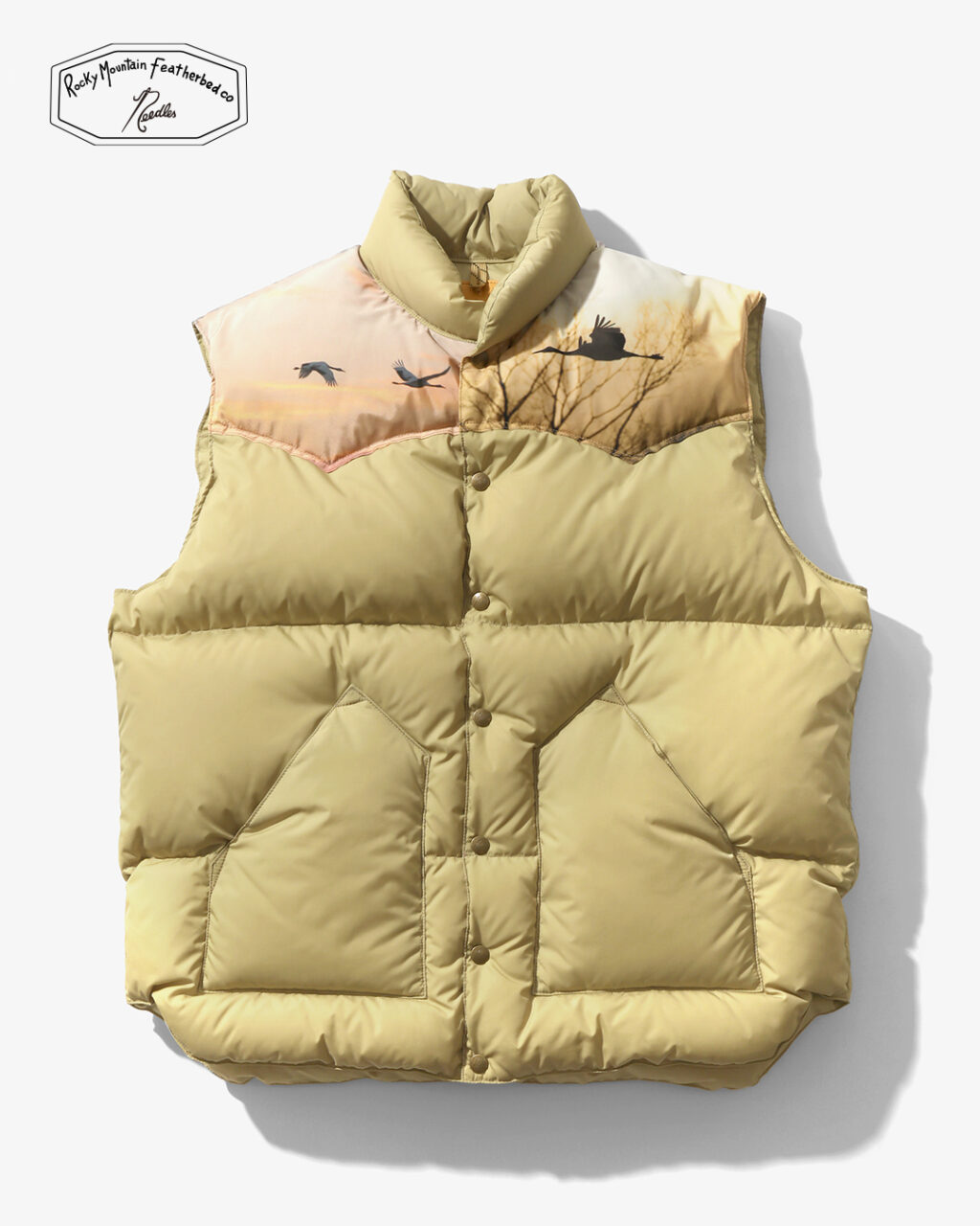 NEEDLES 与美国经典羽绒品牌 Rocky Mountain Featherbed 推出了首次合作。此次合作的一大亮点在于:刻意不采用通常由一整块面料制作的设计,而是在胸以上部分印有丹顶鹤在黄昏、雪原中翩翩起舞的照片。该系列包括两种类型——羽绒服和背心,其外层和内层衬里均采用 70D 尼龙塔夫绸制成,填充物则为 700 蓬松度欧洲防水羽绒,用来确保高水平的保暖性和轻盈舒适的穿着体验。两款产品均提供米色、紫色和黑色三种选择,将于 10 月 18 日(星期六)在 NEPENTHES 官网及线下店发售。