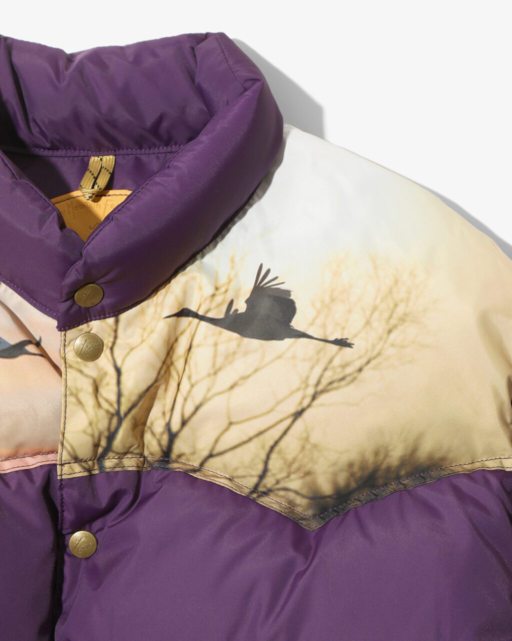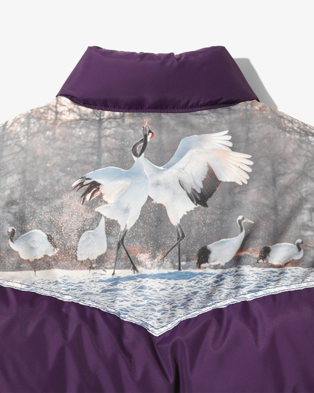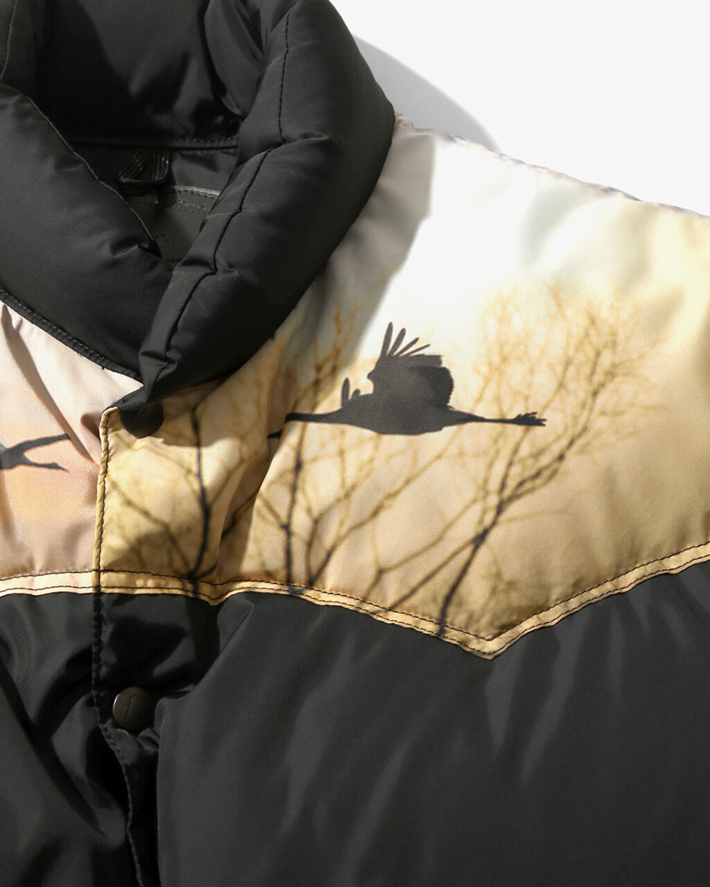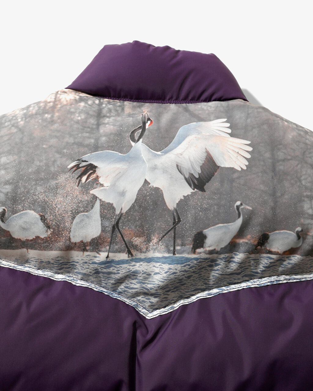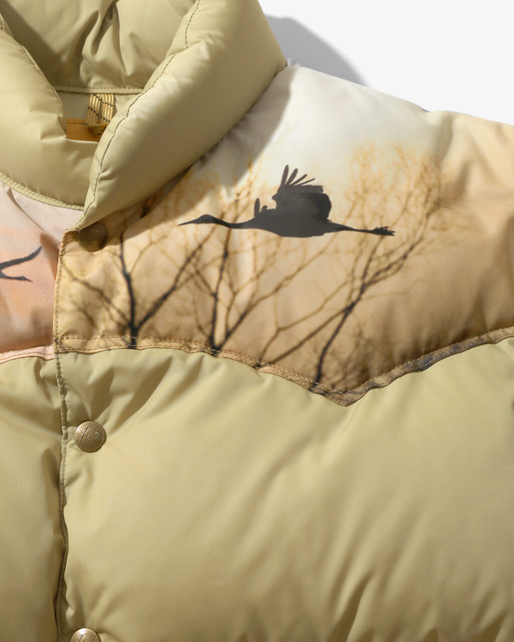 NEEDLES 与美国经典羽绒品牌 Rocky Mountain Featherbed 推出了首次合作。此次合作的一大亮点在于:刻意不采用通常由一整块面料制作的设计,而是在胸以上部分印有丹顶鹤在黄昏、雪原中翩翩起舞的照片。该系列包括两种类型——羽绒服和背心,其外层和内层衬里均采用 70D 尼龙塔夫绸制成,填充物则为 700 蓬松度欧洲防水羽绒,用来确保高水平的保暖性和轻盈舒适的穿着体验。两款产品均提供米色、紫色和黑色三种选择,将于 10 月 18 日(星期六)在 NEPENTHES 官网及线下店发售。