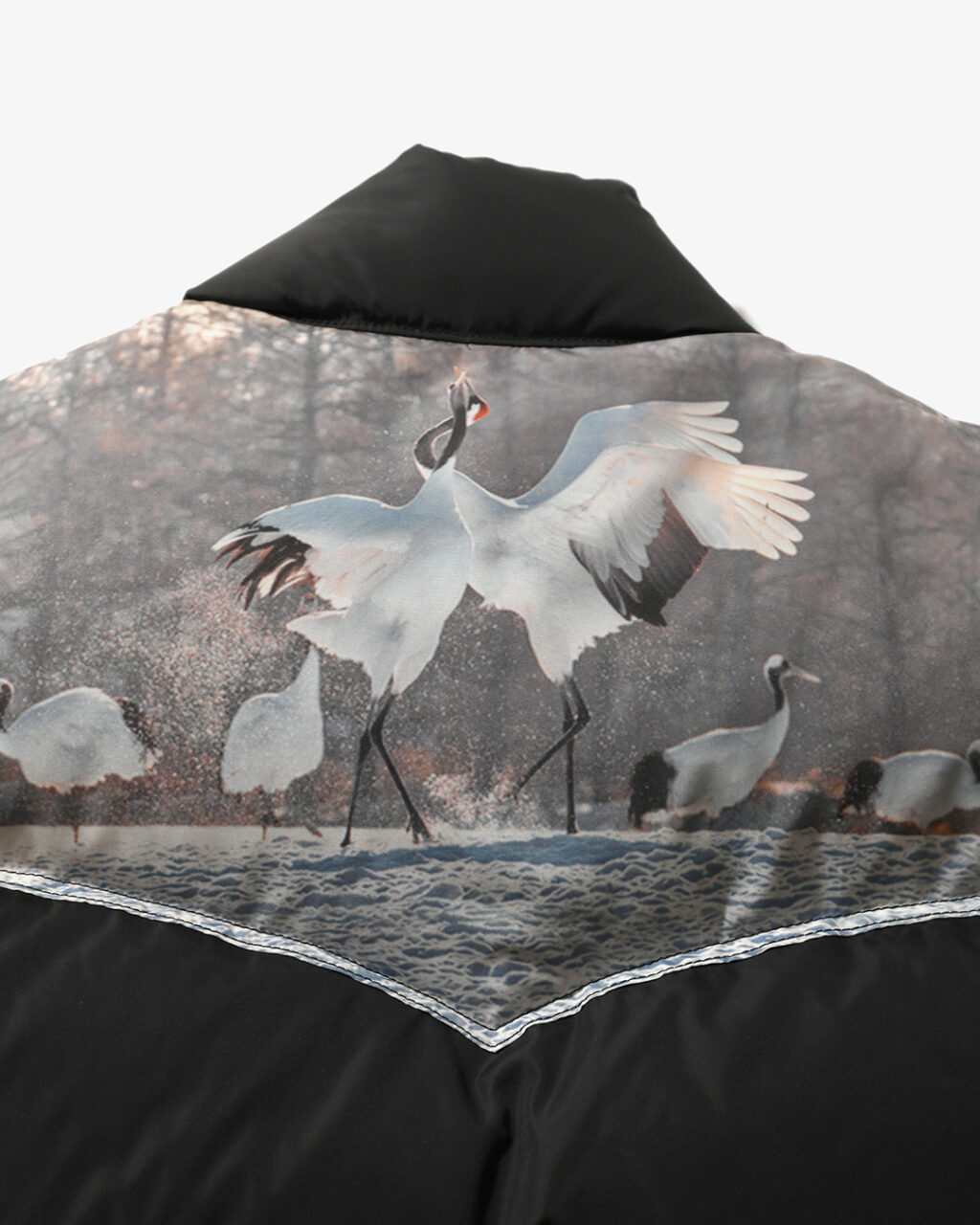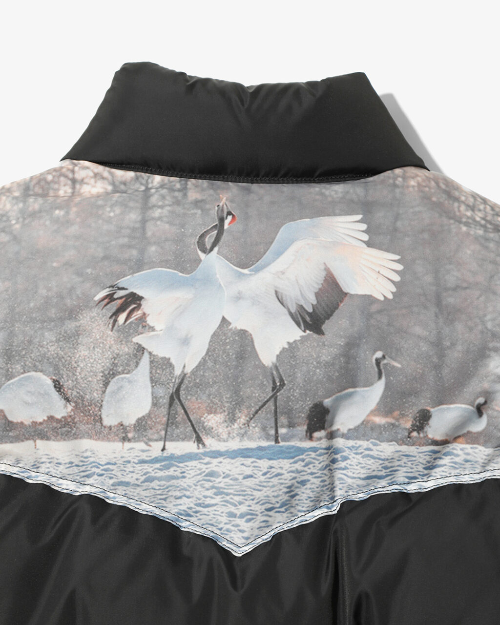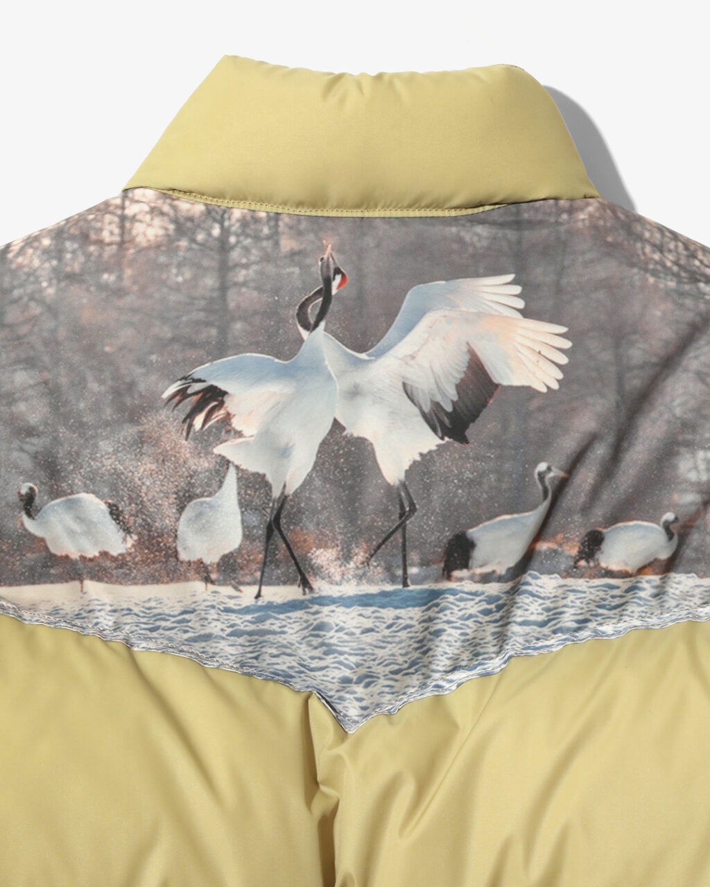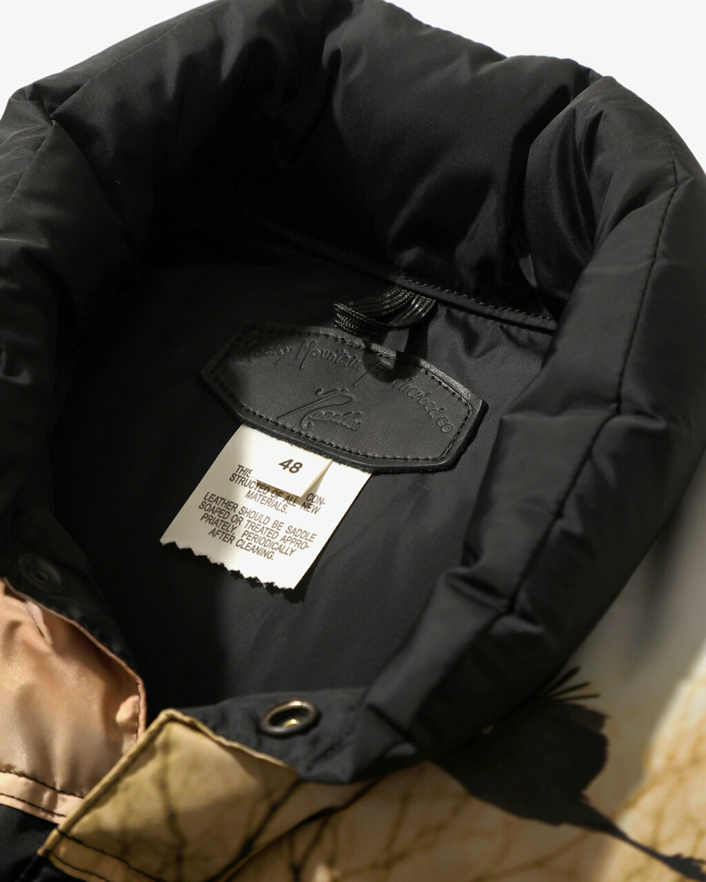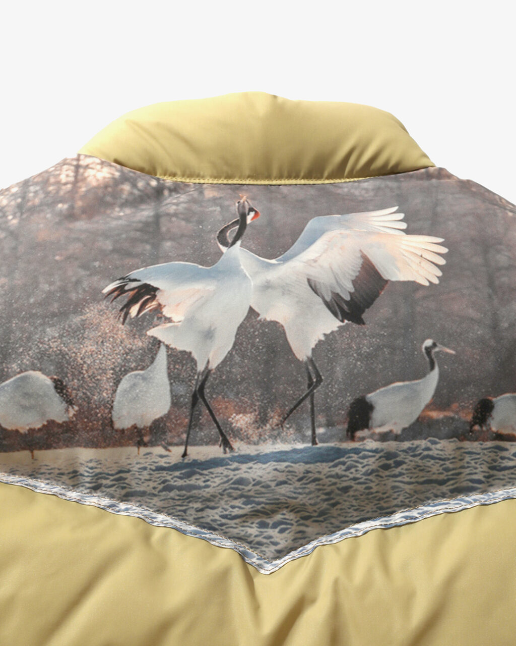 NEEDLES 与美国经典羽绒品牌 Rocky Mountain Featherbed 推出了首次合作。此次合作的一大亮点在于:刻意不采用通常由一整块面料制作的设计,而是在胸以上部分印有丹顶鹤在黄昏、雪原中翩翩起舞的照片。该系列包括两种类型——羽绒服和背心,其外层和内层衬里均采用 70D 尼龙塔夫绸制成,填充物则为 700 蓬松度欧洲防水羽绒,用来确保高水平的保暖性和轻盈舒适的穿着体验。两款产品均提供米色、紫色和黑色三种选择,将于 10 月 18 日(星期六)在 NEPENTHES 官网及线下店发售。