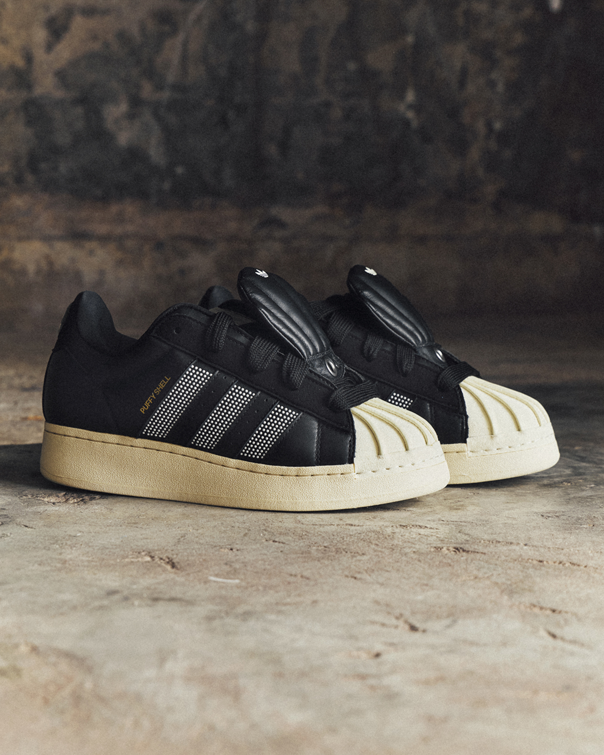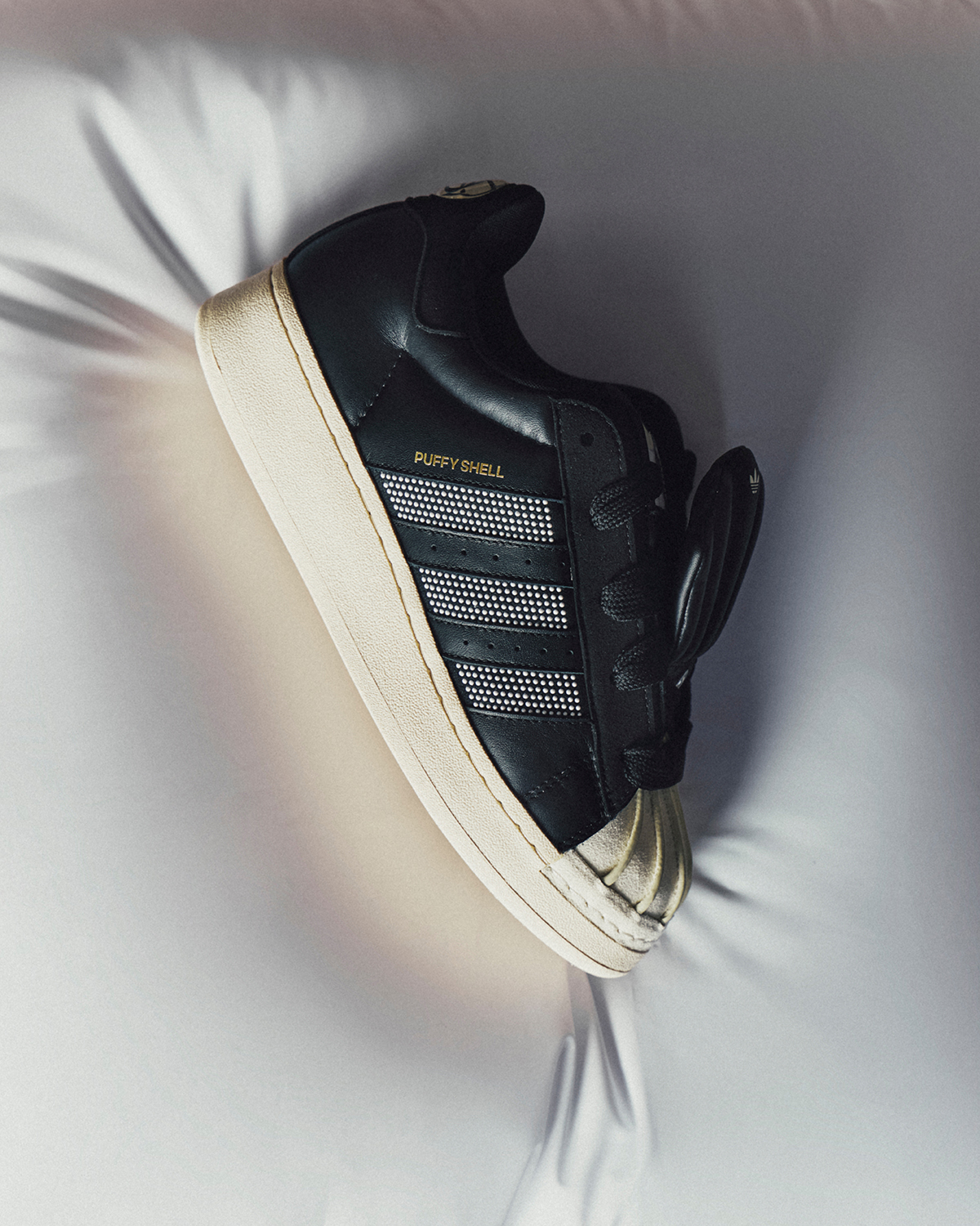 此外,PUFFY SHELL Superstar 在经典的 Superstar 贝壳头鞋型轮廓基础上,以膨胀感的饱满轮廓重新演绎贝壳头元素,填充鞋舌与可拆卸的贝壳装饰赋予造型上的更多可能,细节处点缀珍珠元素,在坚韧与温柔之间找到平衡。
