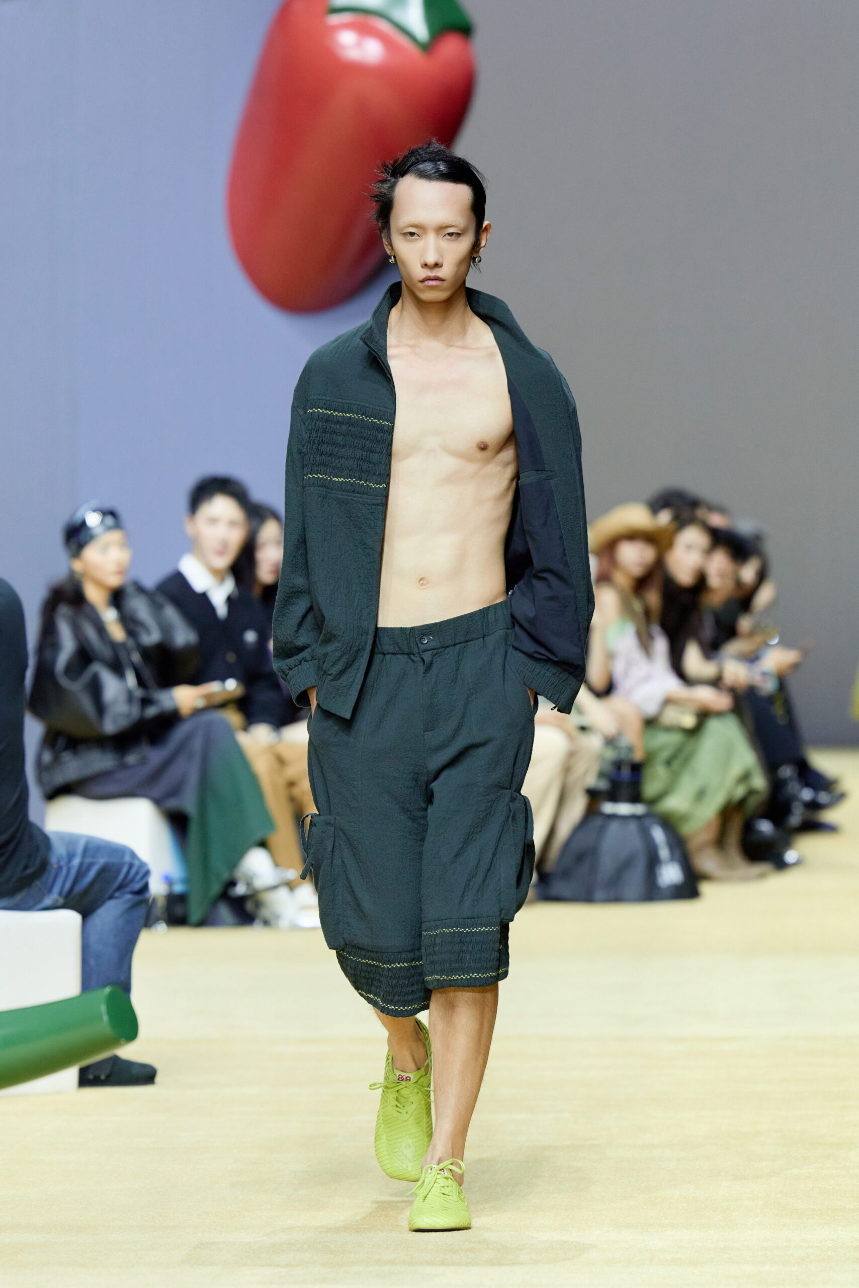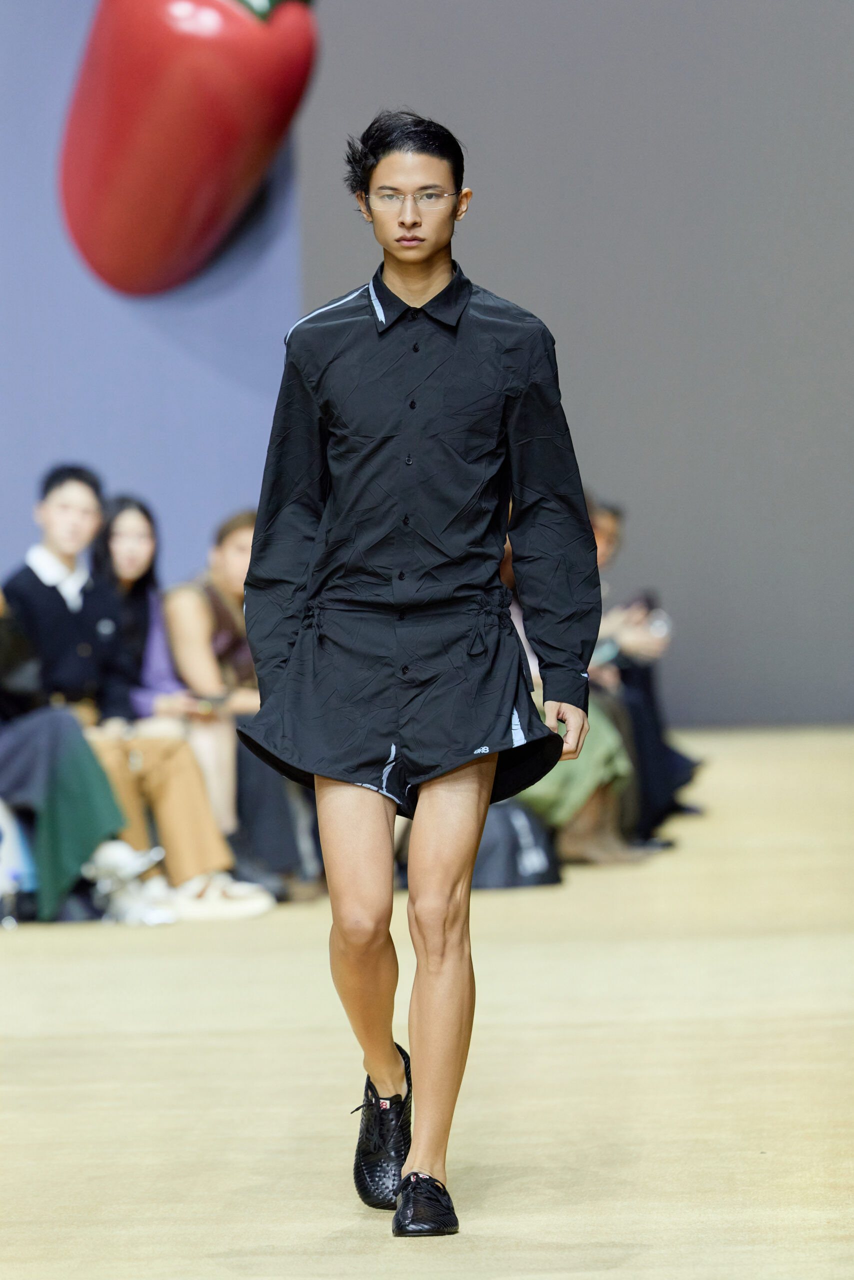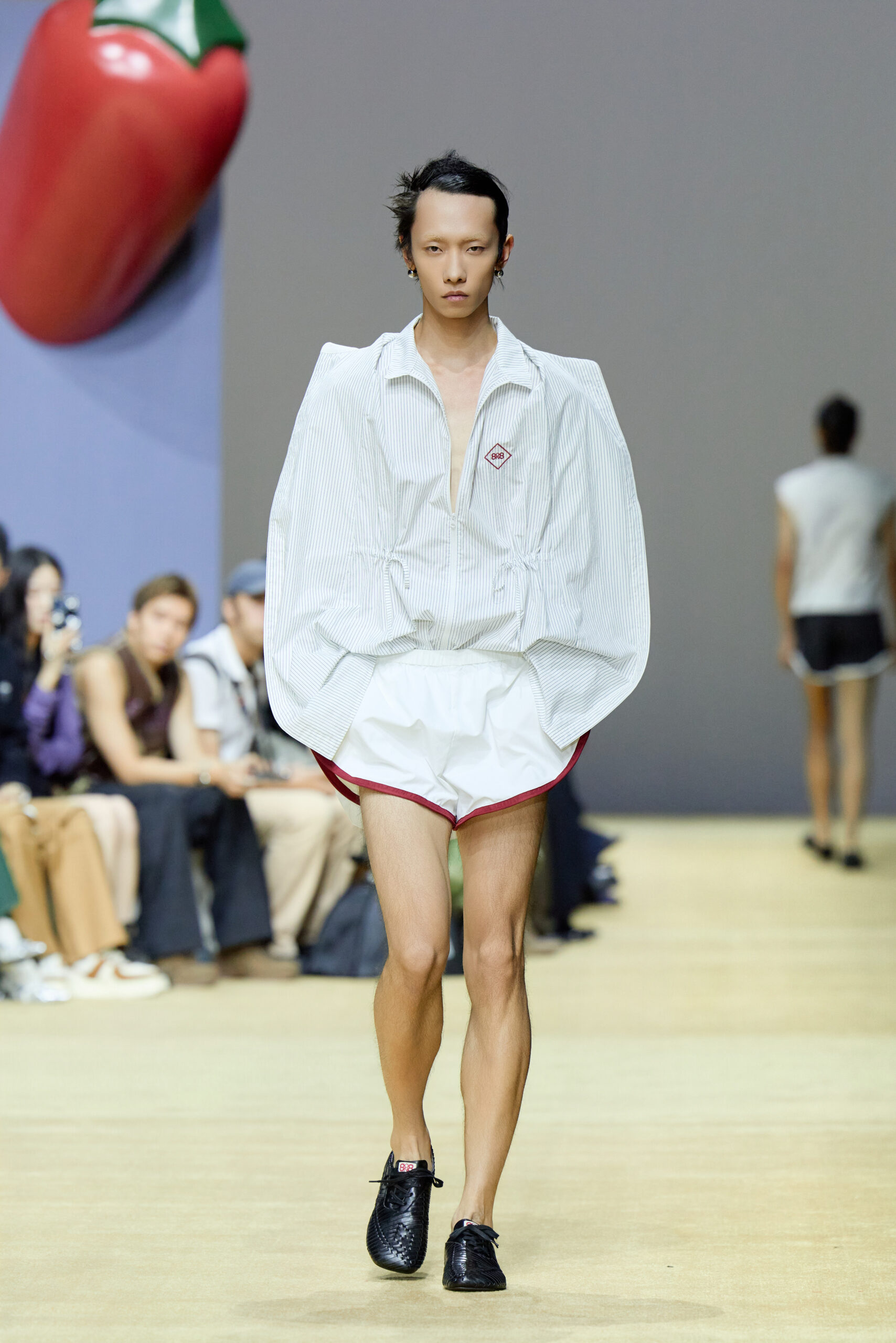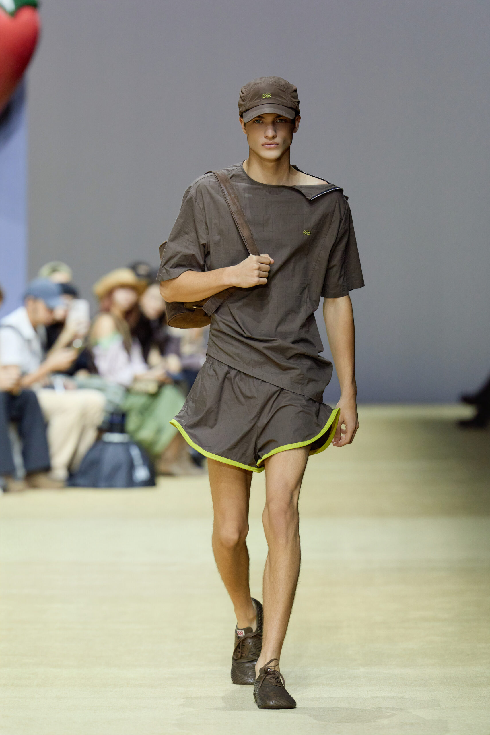 将传统西装的里布和户外皮肤衣合二为一,保持实验性剪裁是 8ON8 对传统男装的不断探究与对时装创意的永恒敬畏。端正的商务衬衫演变为 A 型剪裁,注入传统手工缩褶刺绣工艺。手工编织的皮质薄底跑鞋,日常随处可见的形象跳脱出现实的捆绑。手工编织的皮质薄底跑鞋,以精湛技艺突破常规束缚,寻常的跑步短裤亦被赋予崭新的生命律动,于步履起落间流泻出轻盈跃动的节奏;微微上扬的裤脚剪裁,不经意间勾勒出融合异域情愫与现代动感的审美线条。此类设计语言,既扎根于日常,又超脱于寻常,在矛盾与统一的辩证中构筑出独特的视觉叙事——这正是 8ON8 最为核心的人物性格与美学印记:在平凡中淬炼新奇,在理性秩序中安放诗意荒诞。