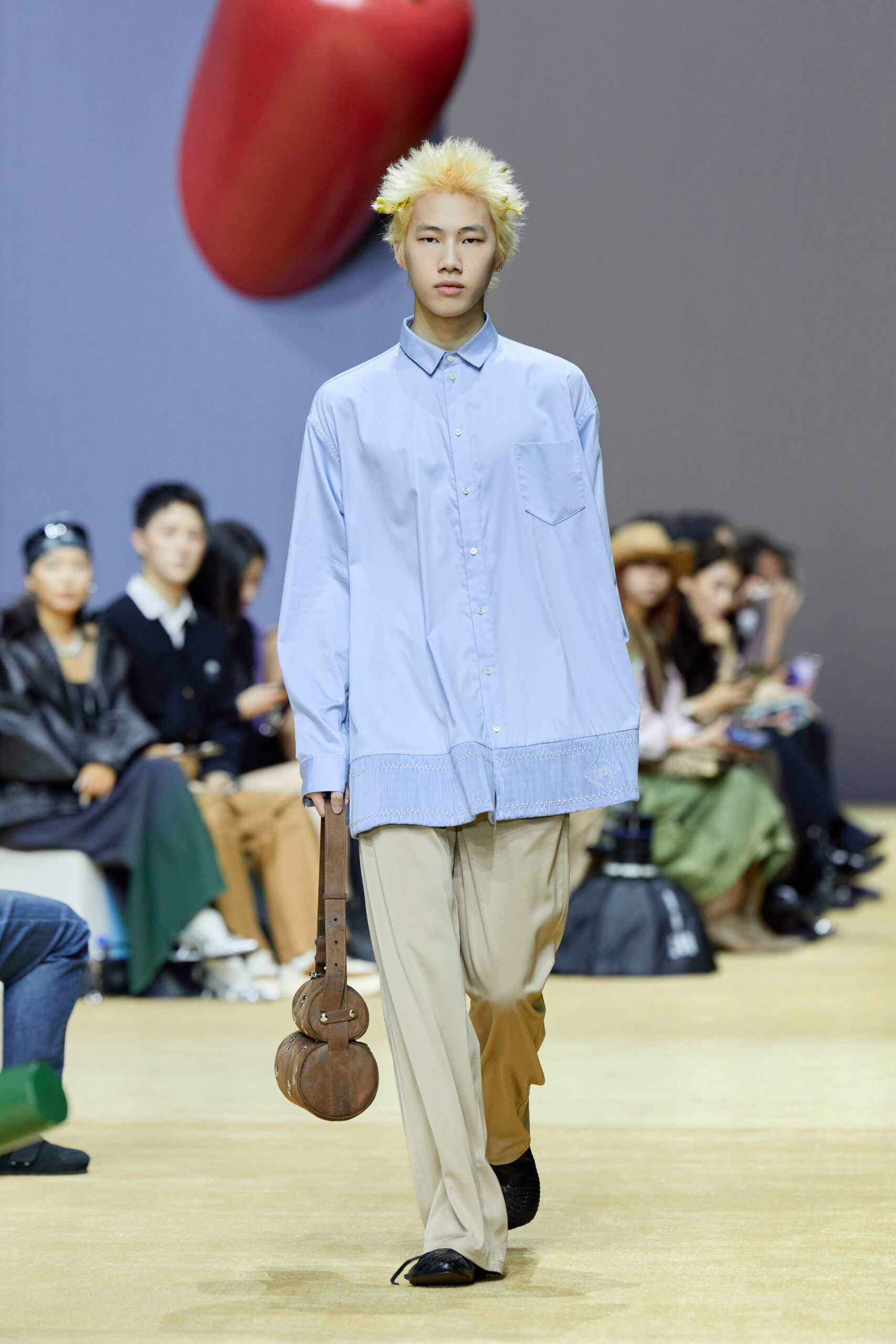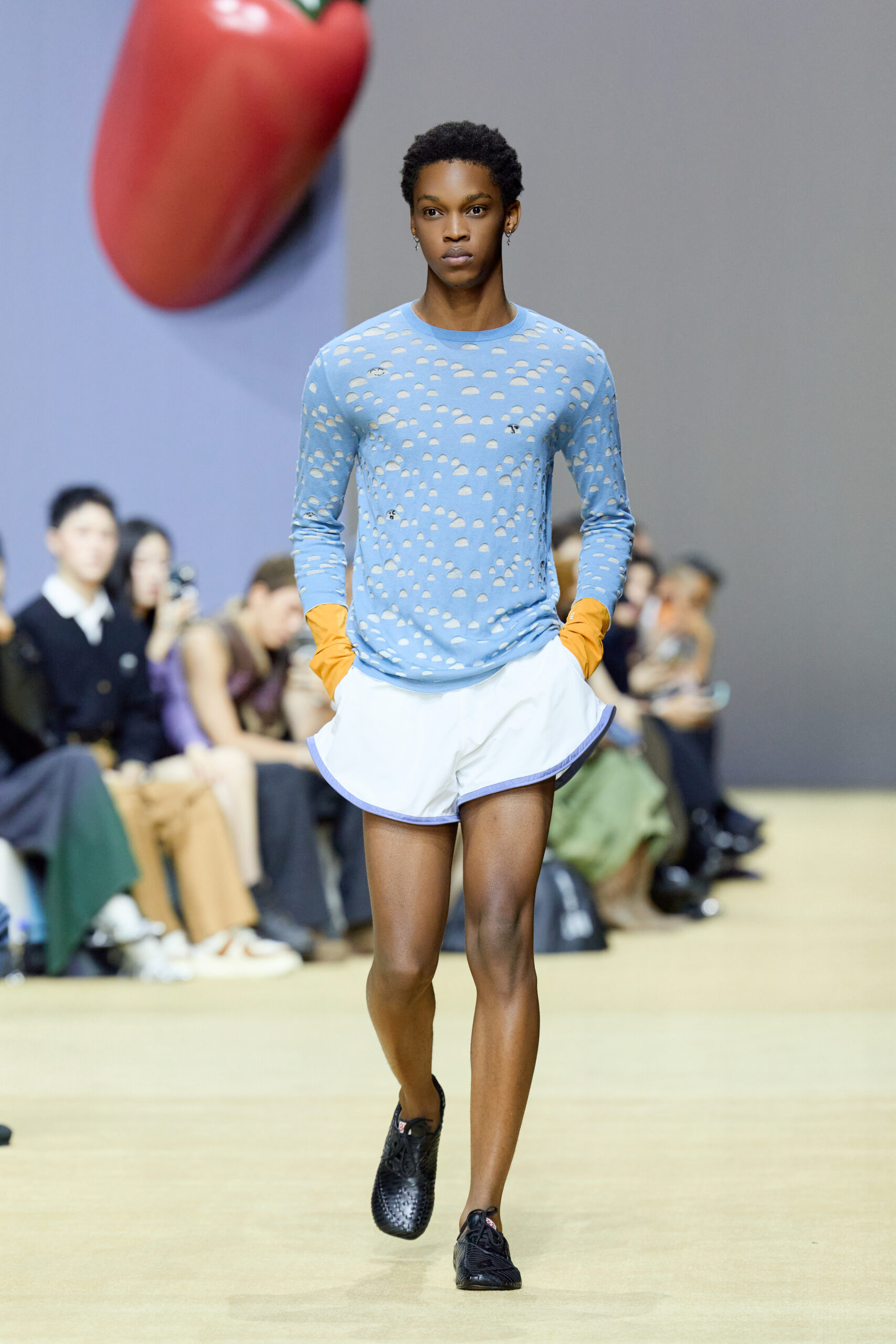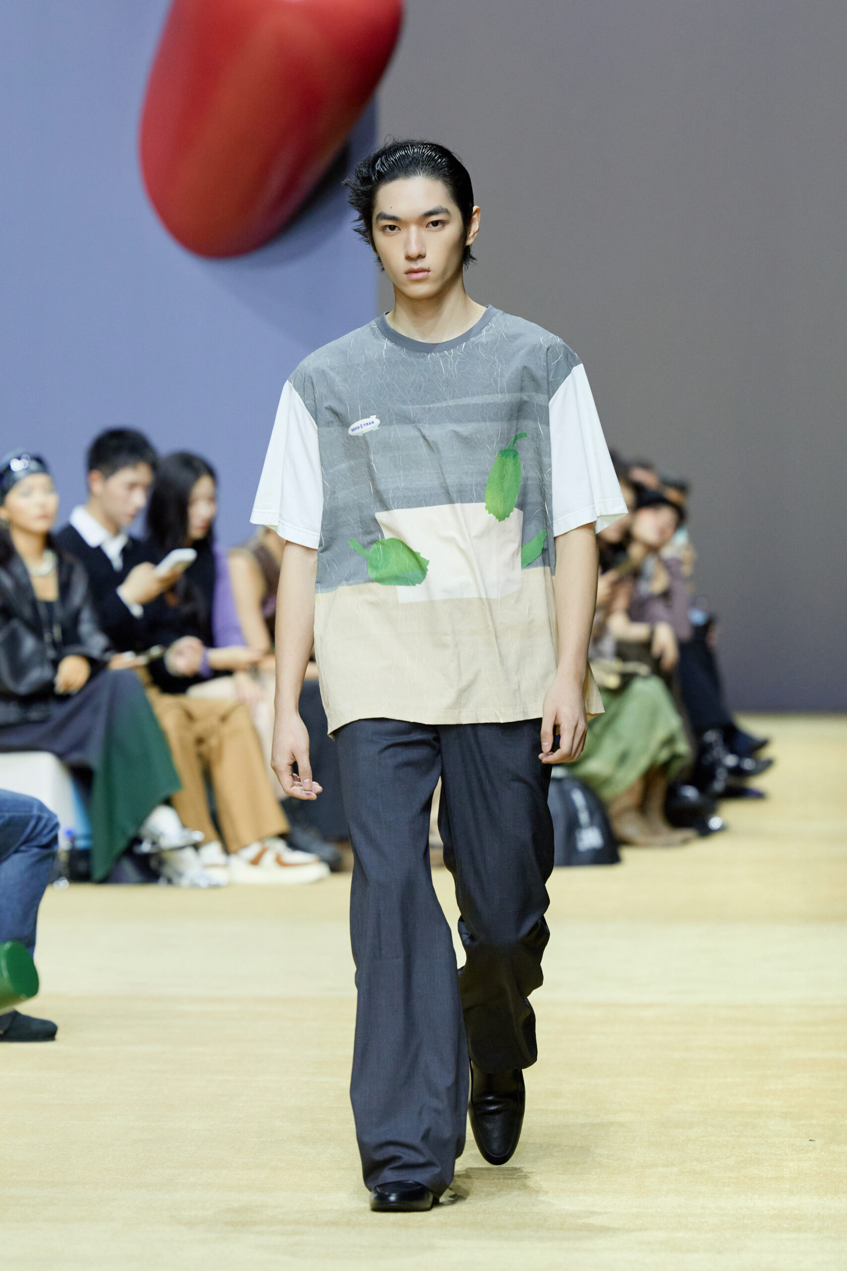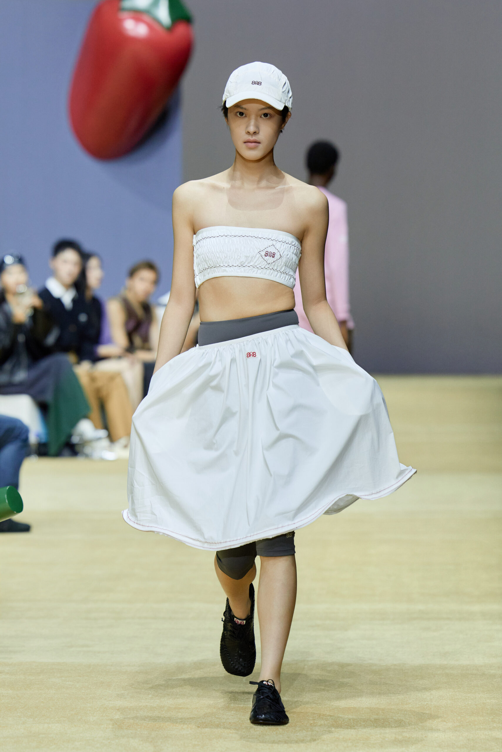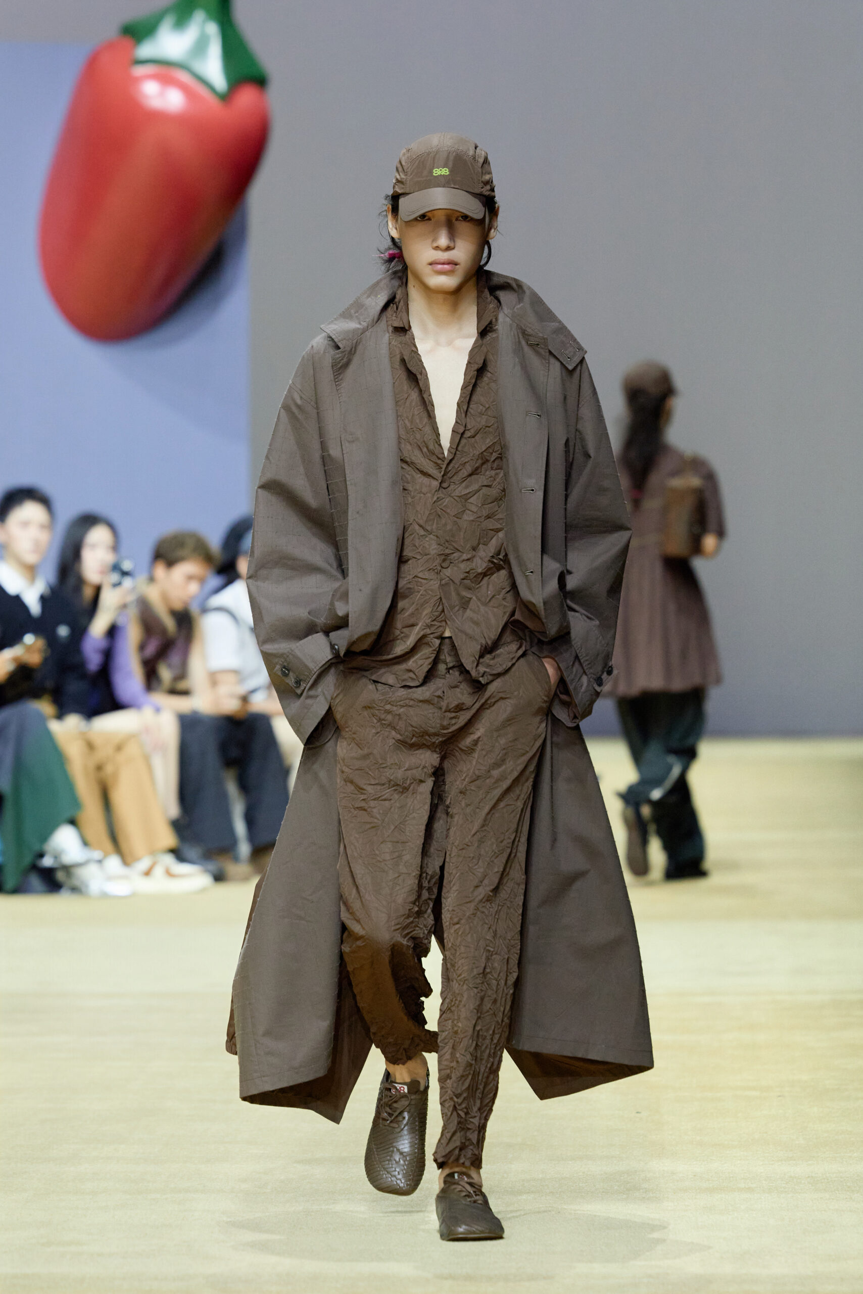 将传统西装的里布和户外皮肤衣合二为一,保持实验性剪裁是 8ON8 对传统男装的不断探究与对时装创意的永恒敬畏。端正的商务衬衫演变为 A 型剪裁,注入传统手工缩褶刺绣工艺。手工编织的皮质薄底跑鞋,日常随处可见的形象跳脱出现实的捆绑。手工编织的皮质薄底跑鞋,以精湛技艺突破常规束缚,寻常的跑步短裤亦被赋予崭新的生命律动,于步履起落间流泻出轻盈跃动的节奏;微微上扬的裤脚剪裁,不经意间勾勒出融合异域情愫与现代动感的审美线条。此类设计语言,既扎根于日常,又超脱于寻常,在矛盾与统一的辩证中构筑出独特的视觉叙事——这正是 8ON8 最为核心的人物性格与美学印记:在平凡中淬炼新奇,在理性秩序中安放诗意荒诞。
