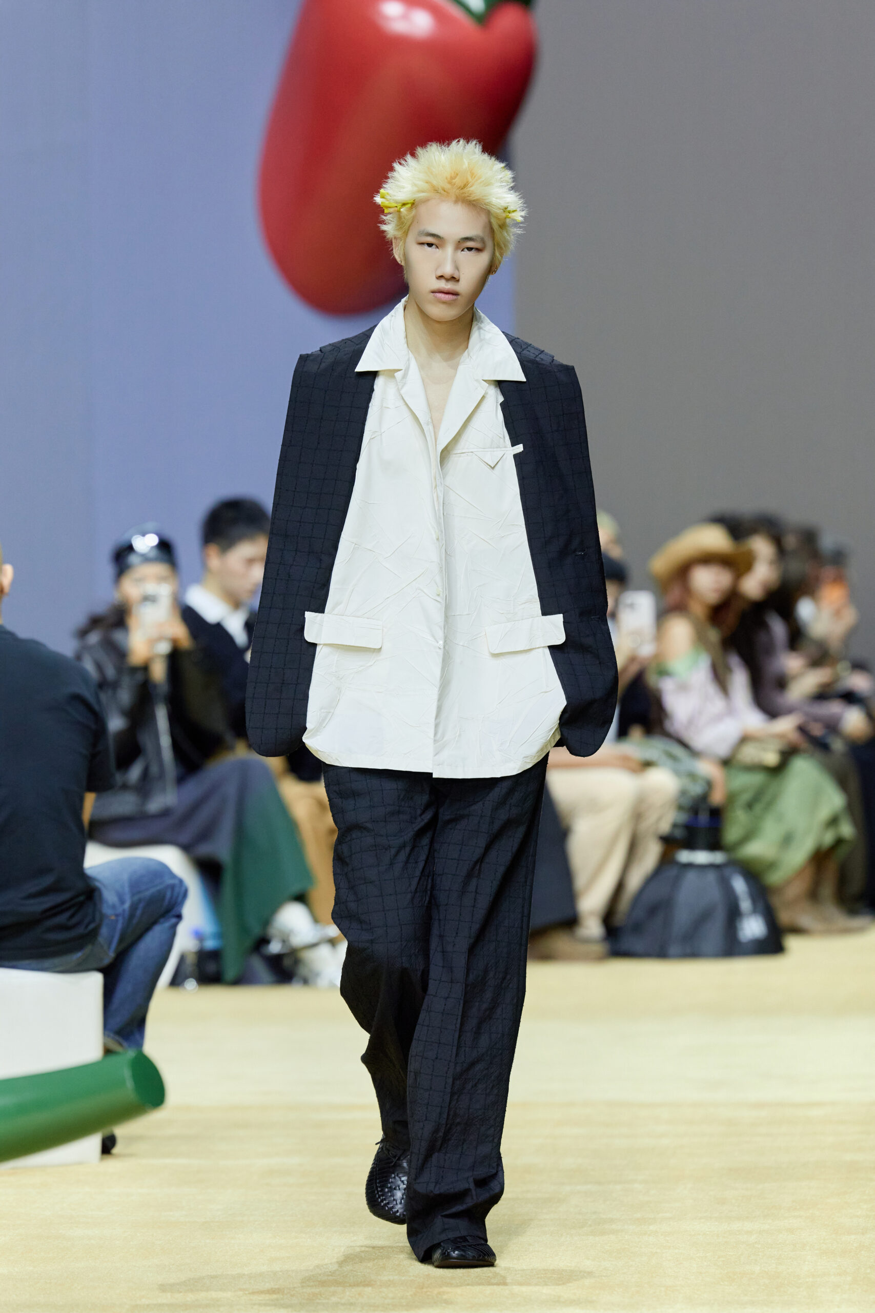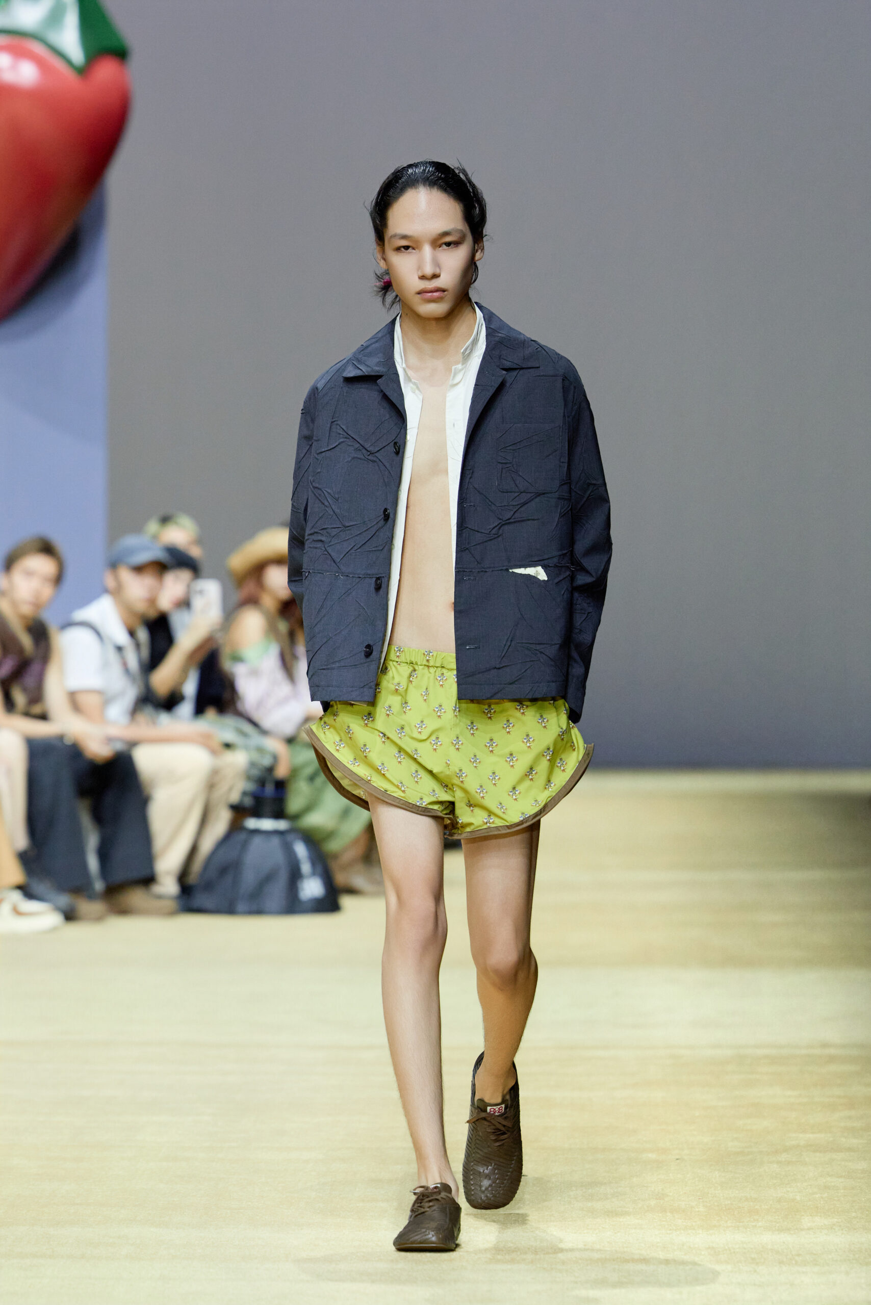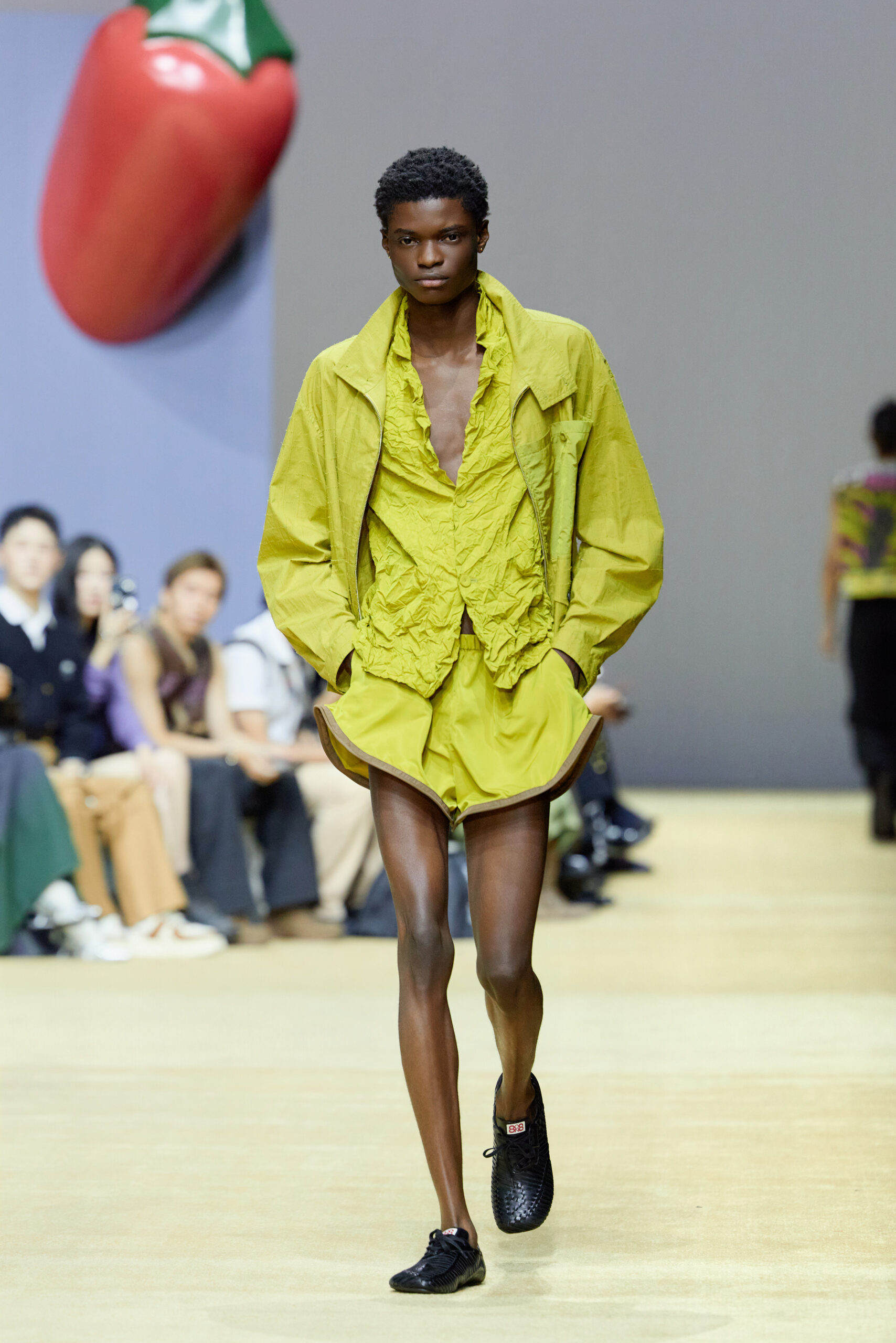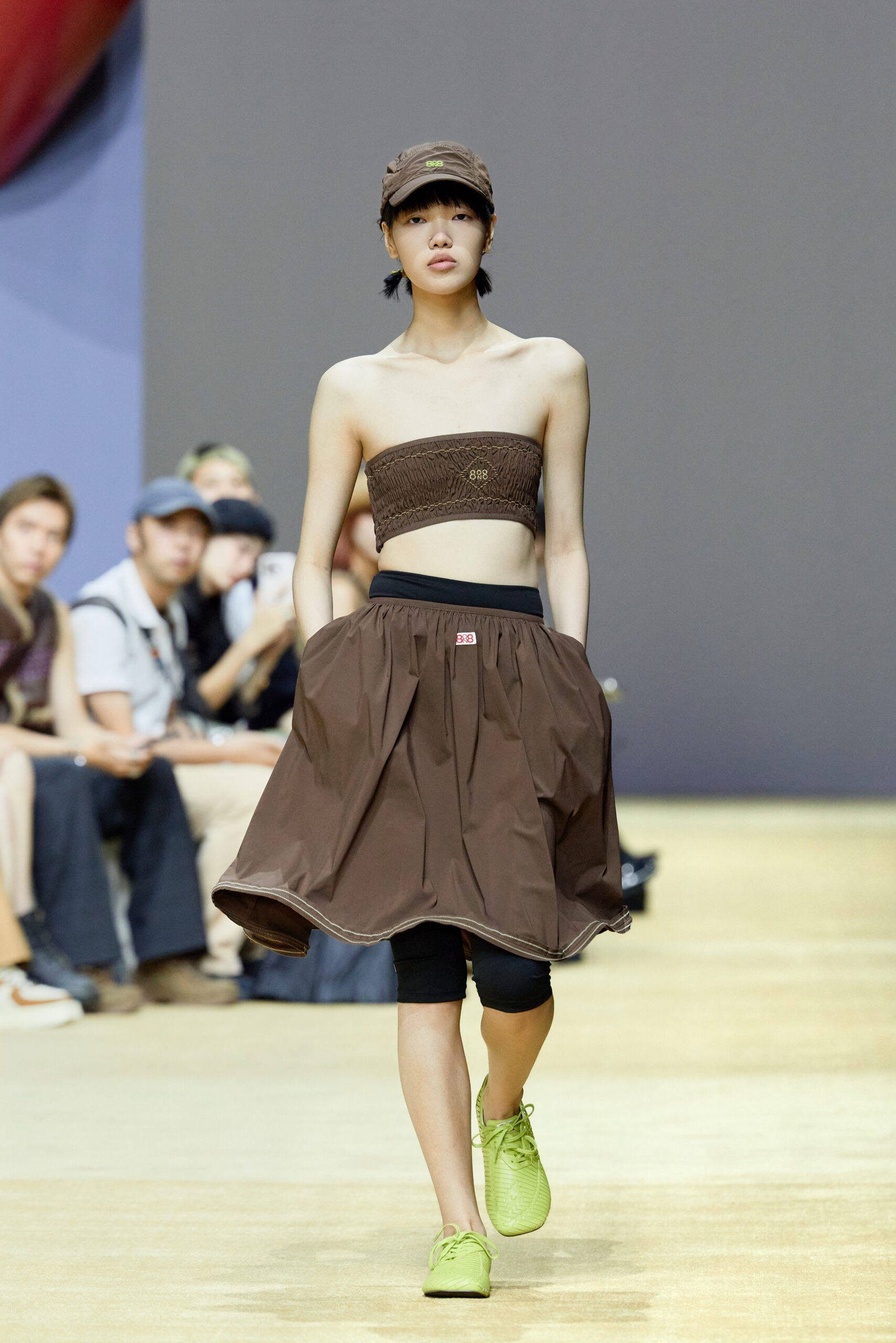 将传统西装的里布和户外皮肤衣合二为一,保持实验性剪裁是 8ON8 对传统男装的不断探究与对时装创意的永恒敬畏。端正的商务衬衫演变为 A 型剪裁,注入传统手工缩褶刺绣工艺。手工编织的皮质薄底跑鞋,日常随处可见的形象跳脱出现实的捆绑。手工编织的皮质薄底跑鞋,以精湛技艺突破常规束缚,寻常的跑步短裤亦被赋予崭新的生命律动,于步履起落间流泻出轻盈跃动的节奏;微微上扬的裤脚剪裁,不经意间勾勒出融合异域情愫与现代动感的审美线条。此类设计语言,既扎根于日常,又超脱于寻常,在矛盾与统一的辩证中构筑出独特的视觉叙事——这正是 8ON8 最为核心的人物性格与美学印记:在平凡中淬炼新奇,在理性秩序中安放诗意荒诞。