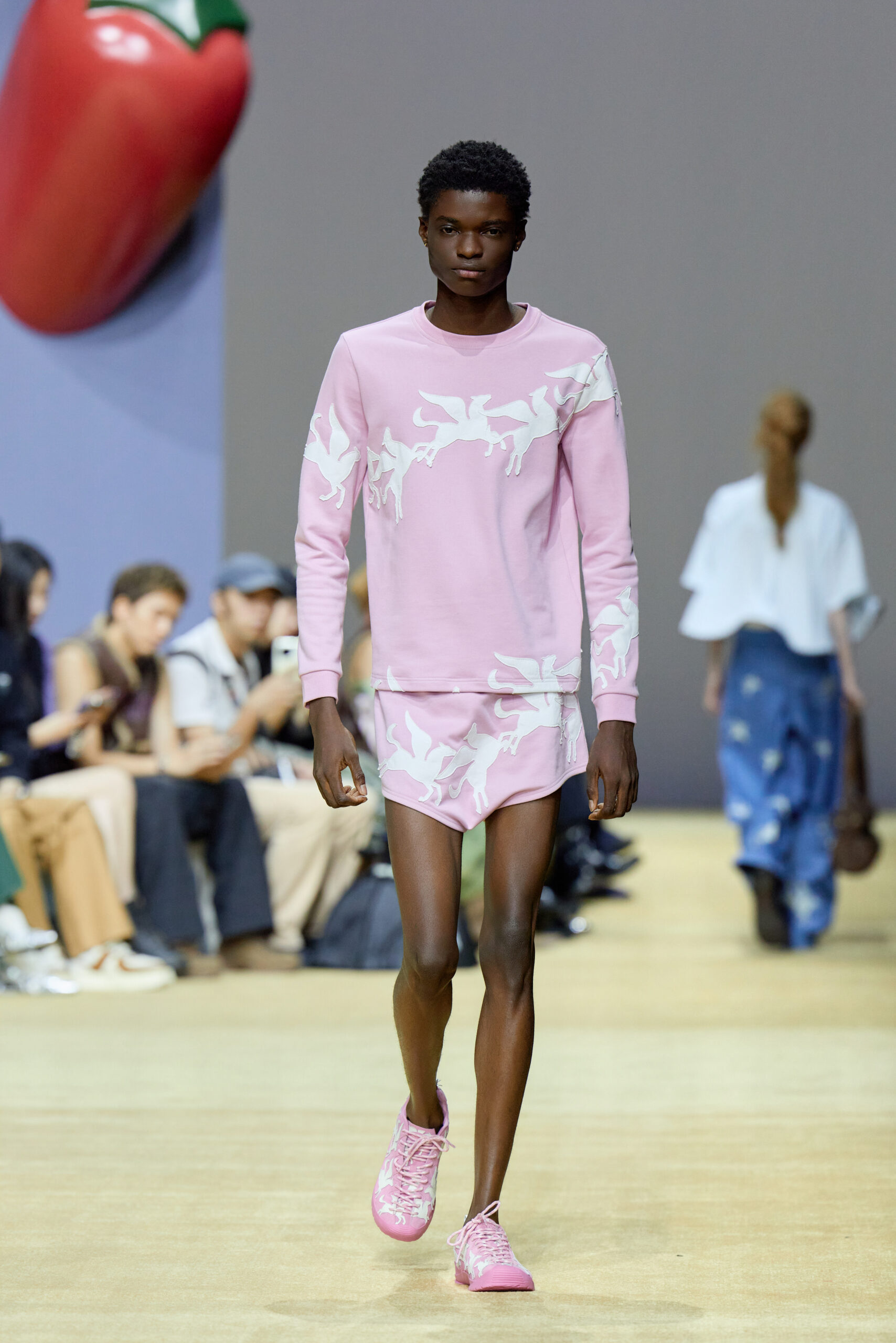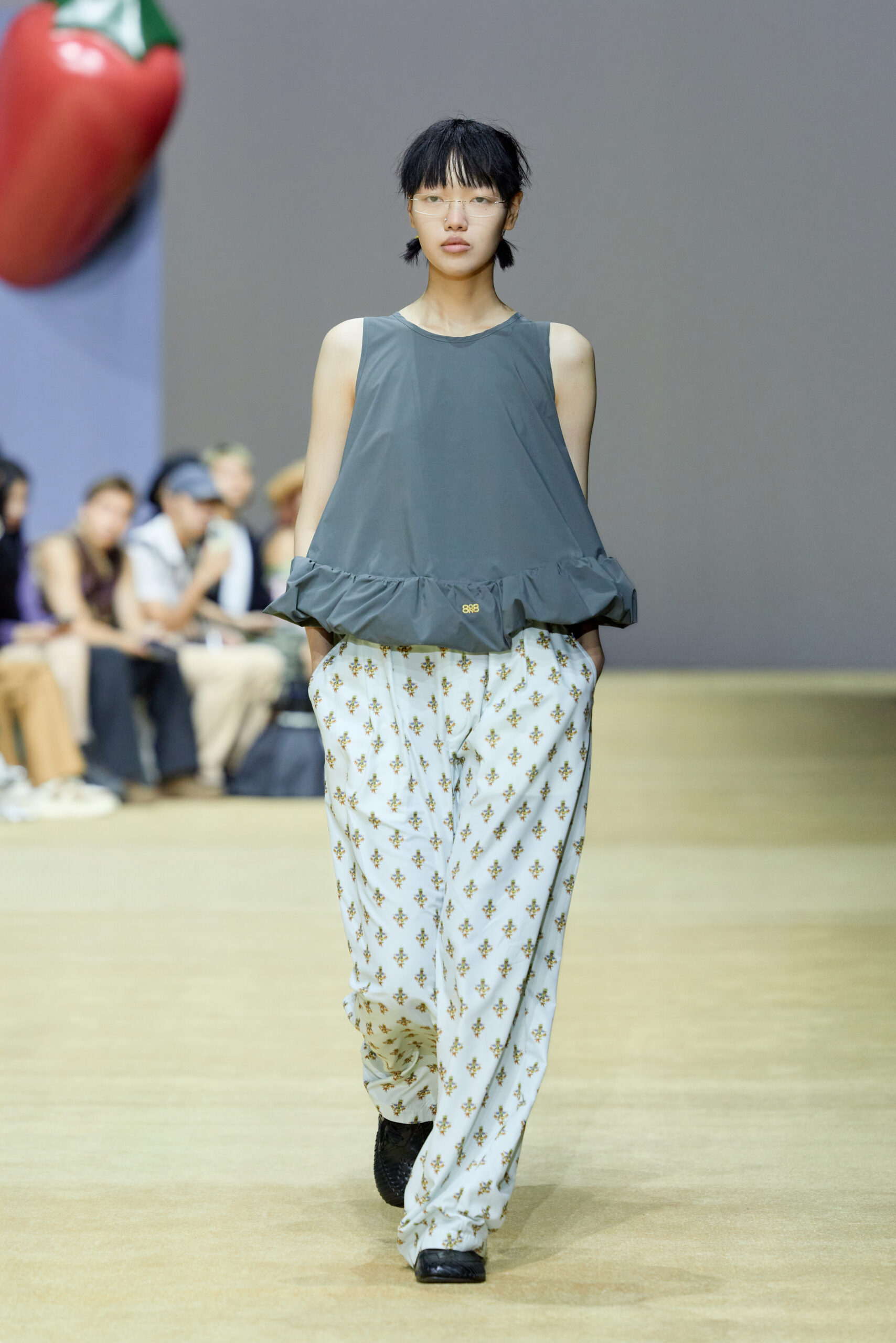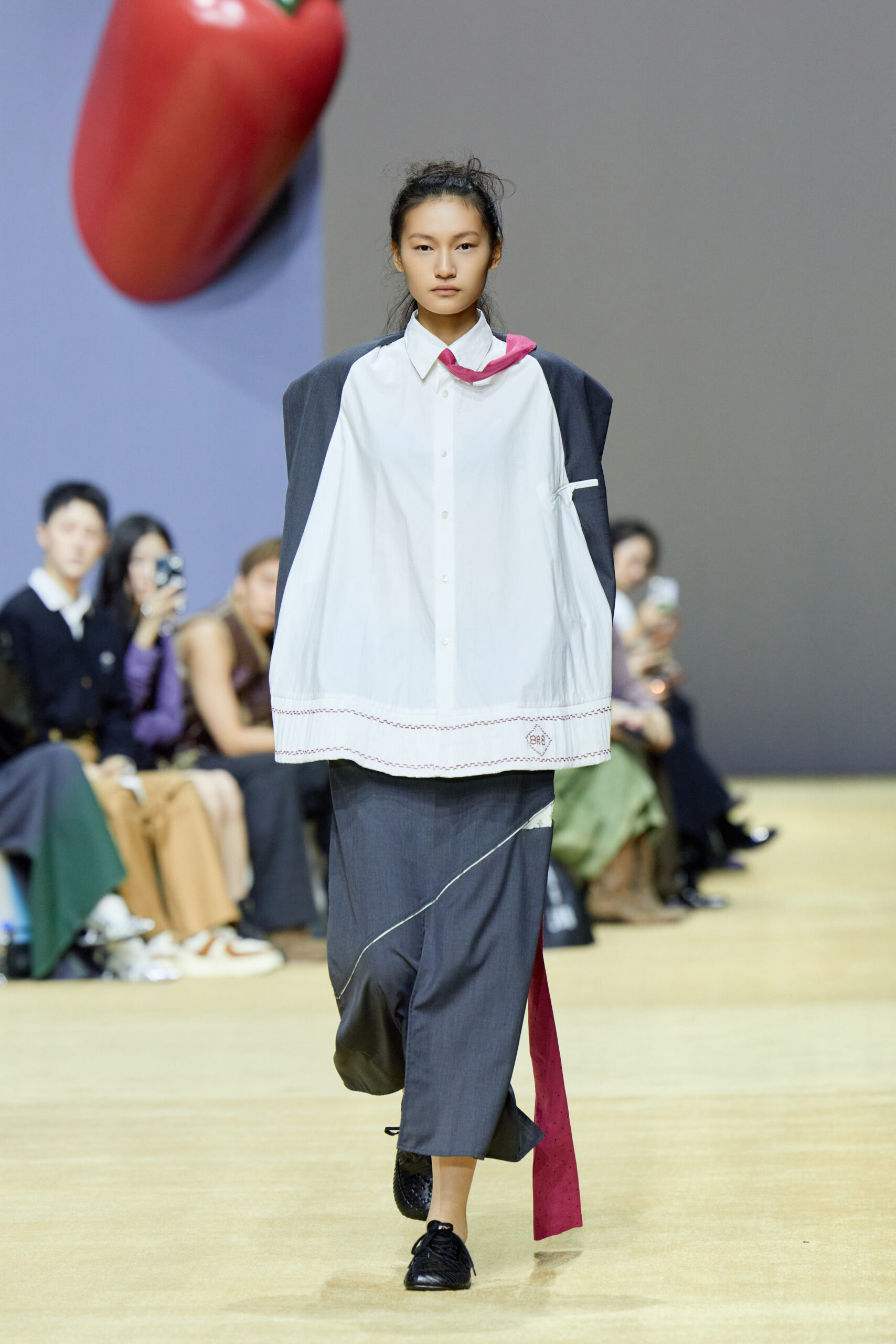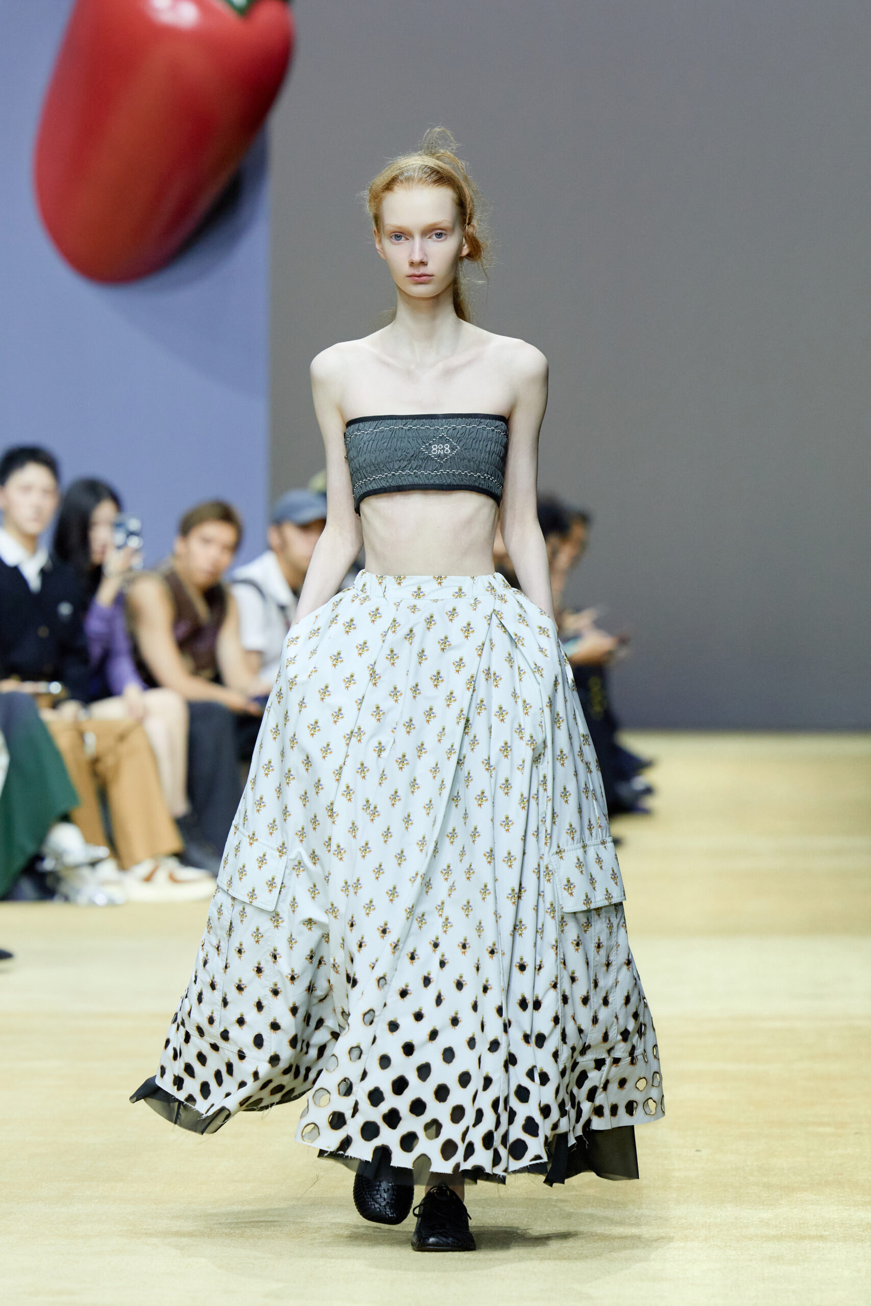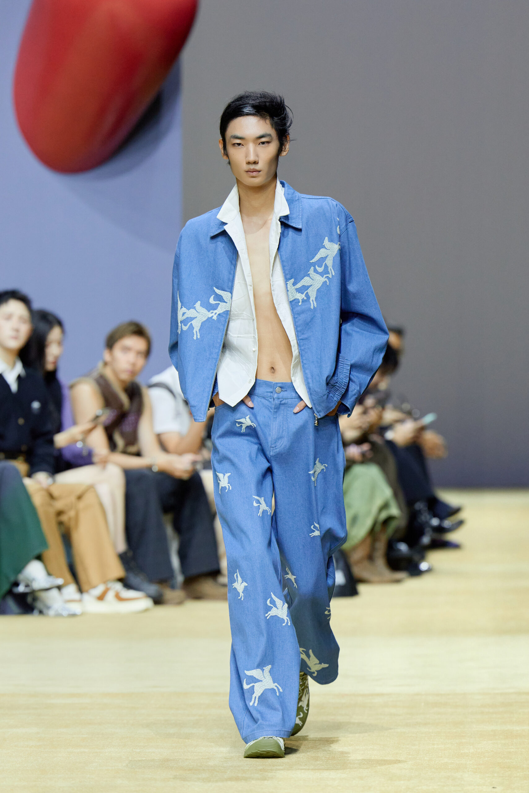 将传统西装的里布和户外皮肤衣合二为一,保持实验性剪裁是 8ON8 对传统男装的不断探究与对时装创意的永恒敬畏。端正的商务衬衫演变为 A 型剪裁,注入传统手工缩褶刺绣工艺。手工编织的皮质薄底跑鞋,日常随处可见的形象跳脱出现实的捆绑。手工编织的皮质薄底跑鞋,以精湛技艺突破常规束缚,寻常的跑步短裤亦被赋予崭新的生命律动,于步履起落间流泻出轻盈跃动的节奏;微微上扬的裤脚剪裁,不经意间勾勒出融合异域情愫与现代动感的审美线条。此类设计语言,既扎根于日常,又超脱于寻常,在矛盾与统一的辩证中构筑出独特的视觉叙事——这正是 8ON8 最为核心的人物性格与美学印记:在平凡中淬炼新奇,在理性秩序中安放诗意荒诞。