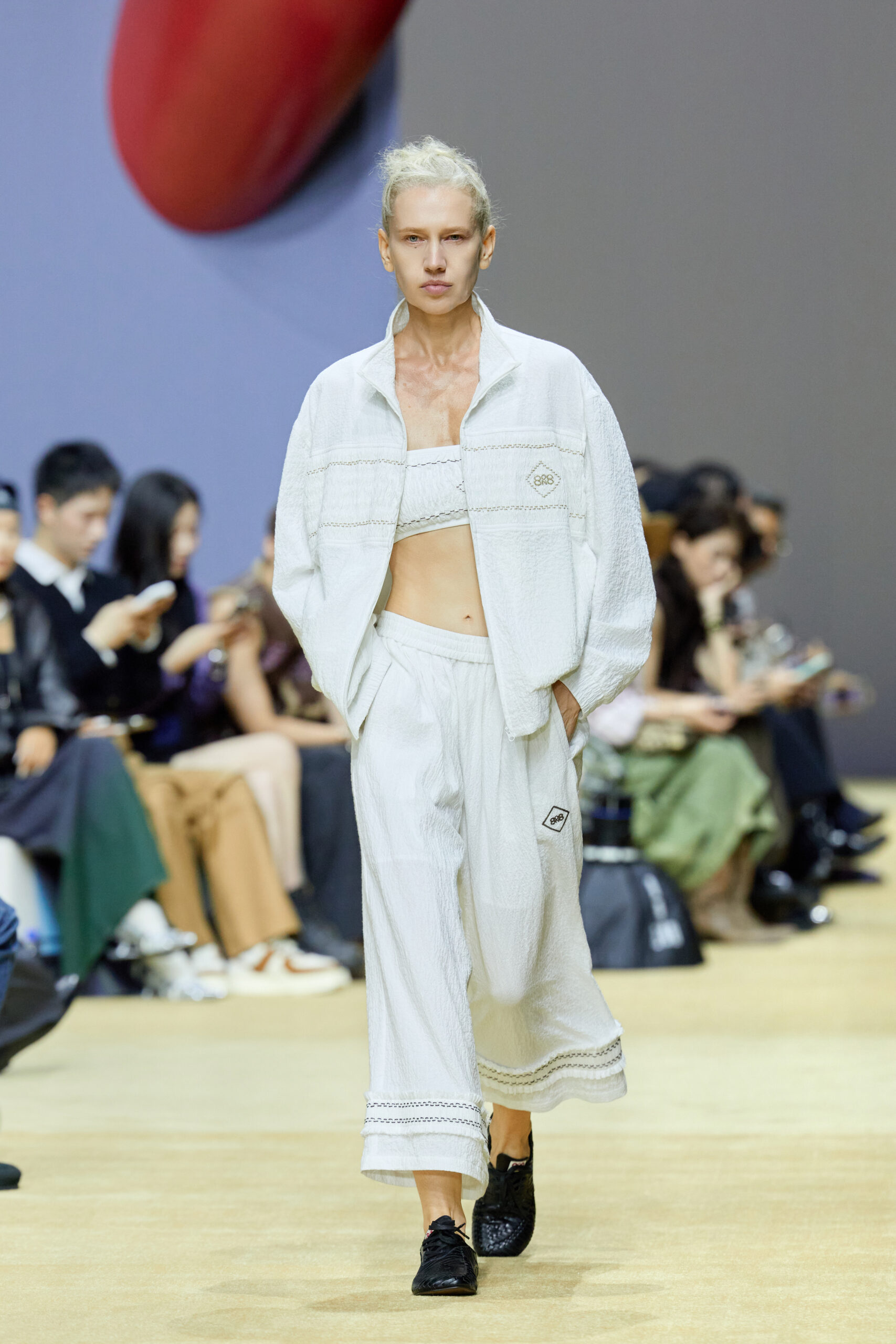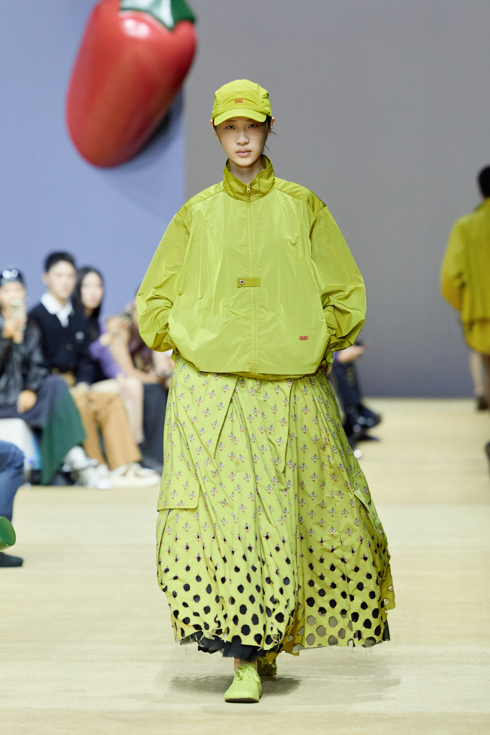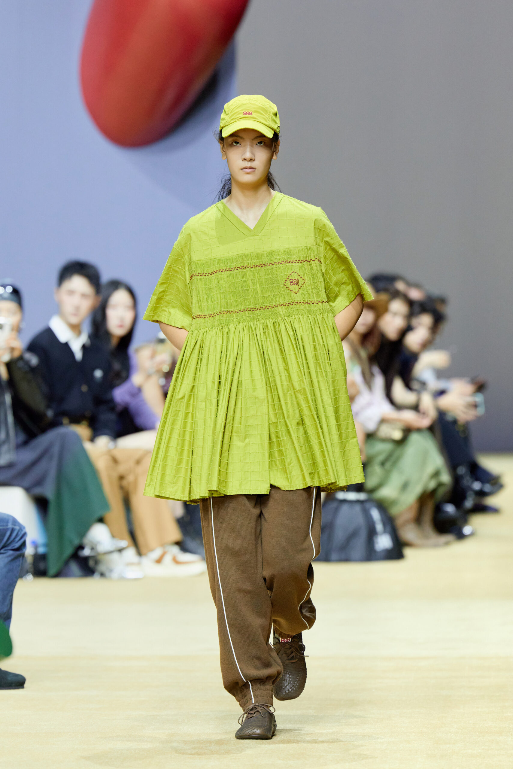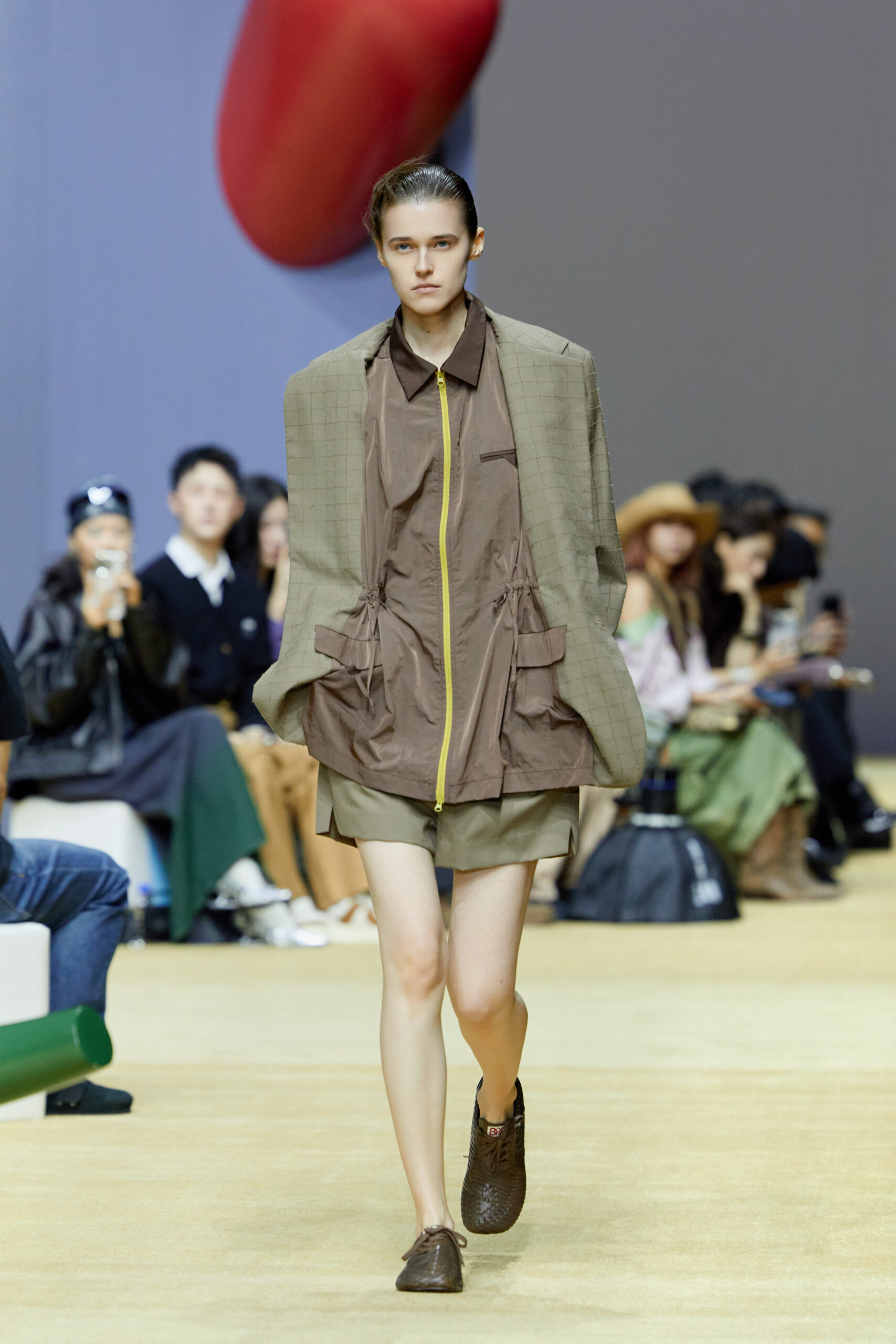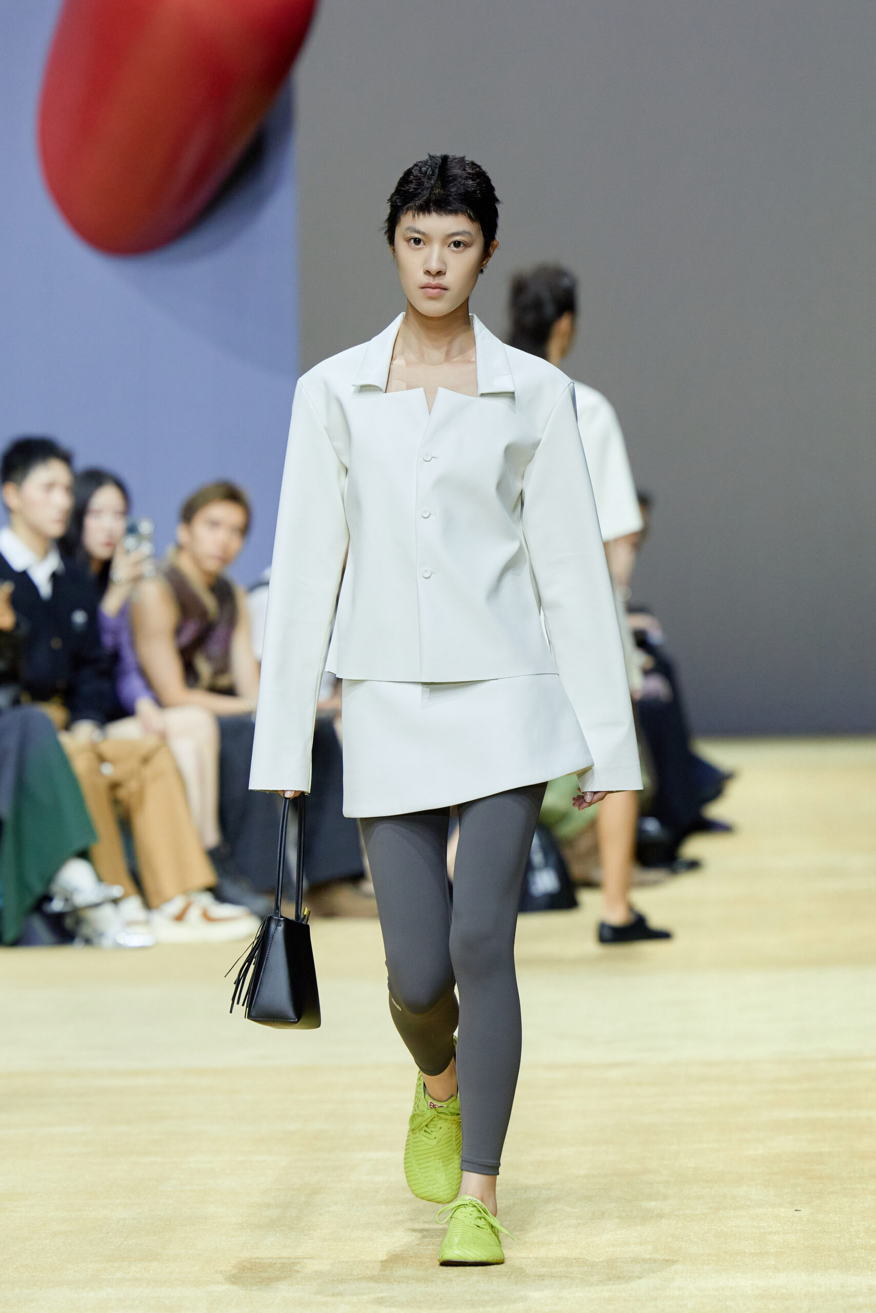 本季融入城市路跑文化、传统手工压褶和编织工艺。设计师龚力以超现实主义的视角诠释外收内放的城市运动者形象,将当代城市新中产内心对自然的向往和对追逐的渴望,用具体视觉热烈表达:流动的缩褶刺绣服饰、手工编织的皮质跑鞋展现出手工技艺与科技面料完美交融。大地色系的陶土红与 充满活力的霓虹色调碰撞出兼具松弛与动态感的轮廓,新鲜脱俗的民族手工艺与城市通勤风格的巧妙融和,传达出身处现实却神游四海的跳脱平衡。
