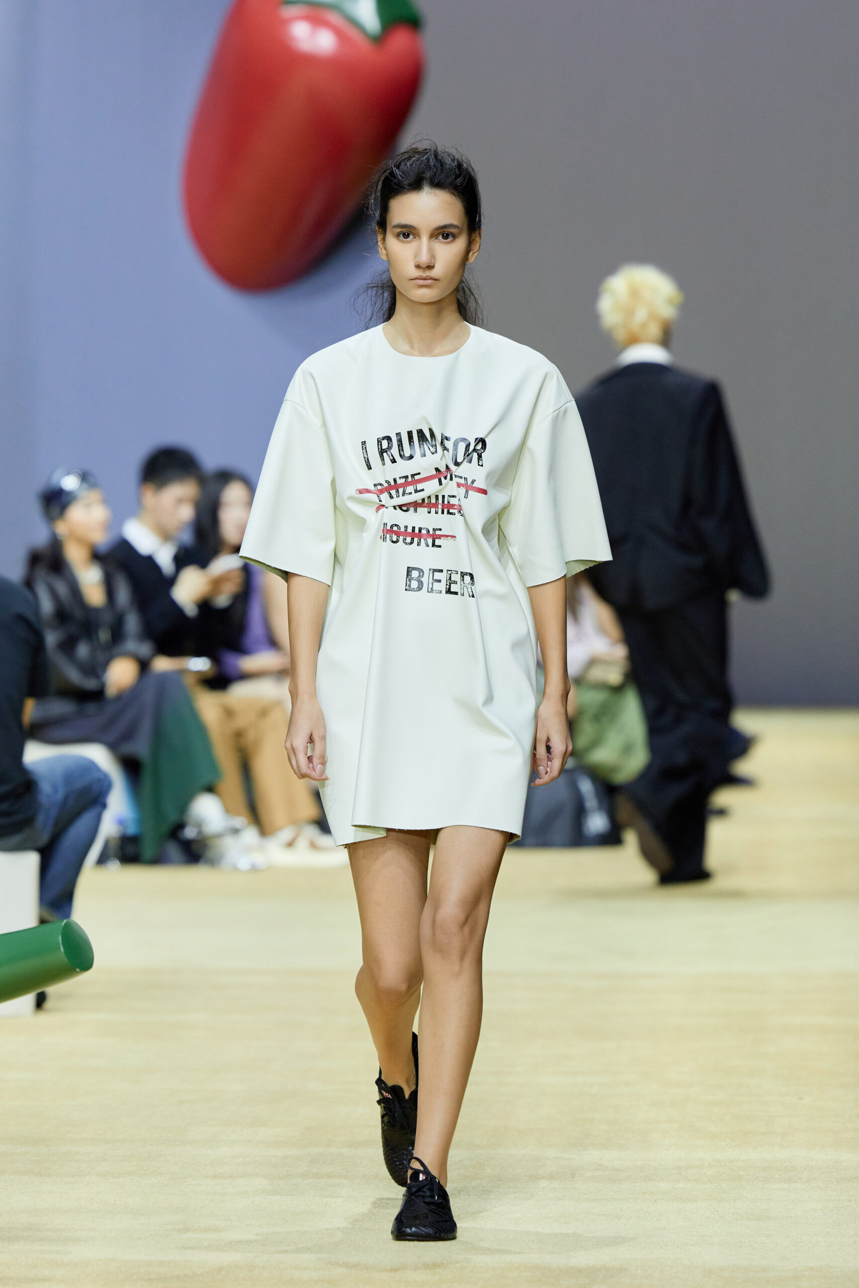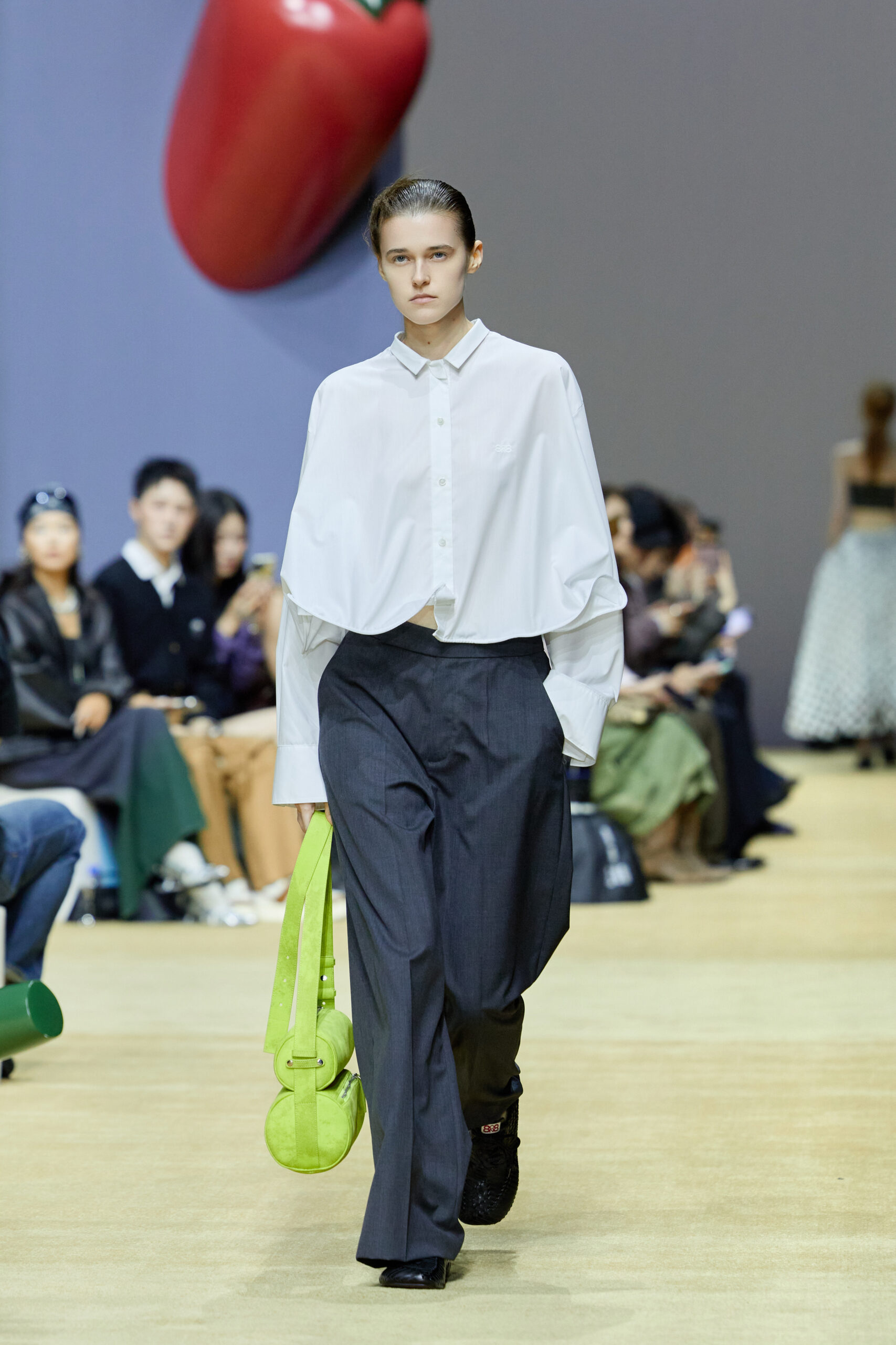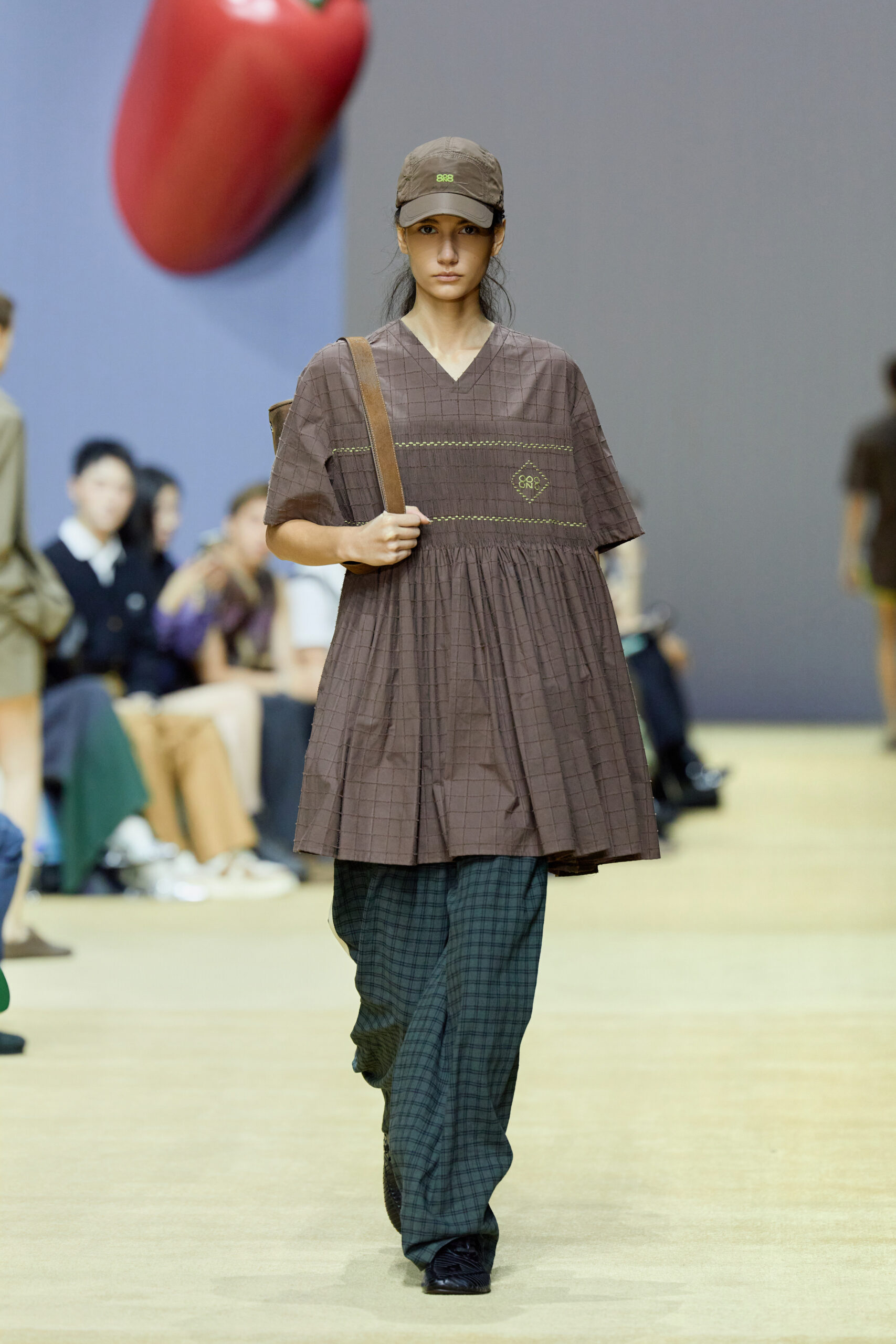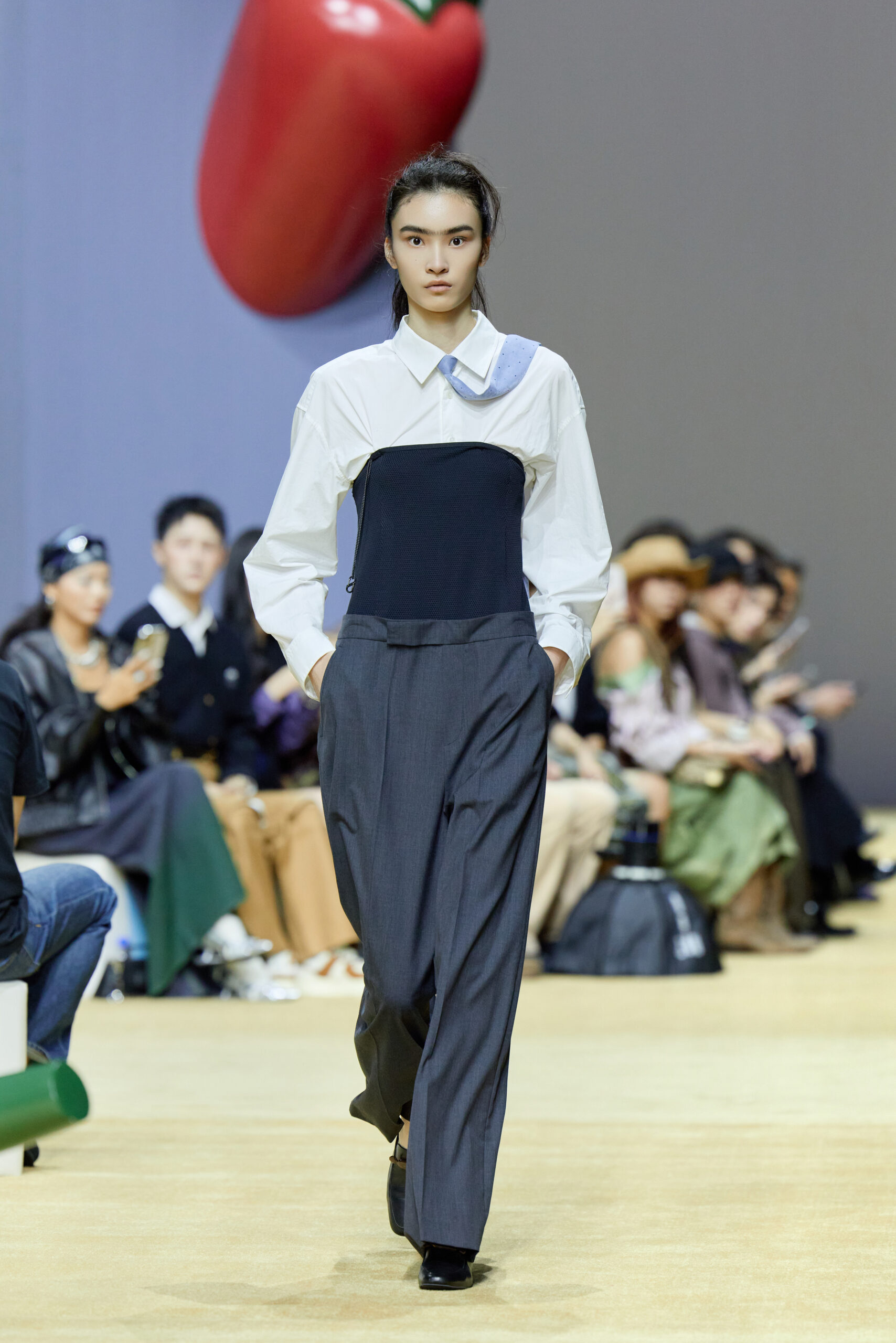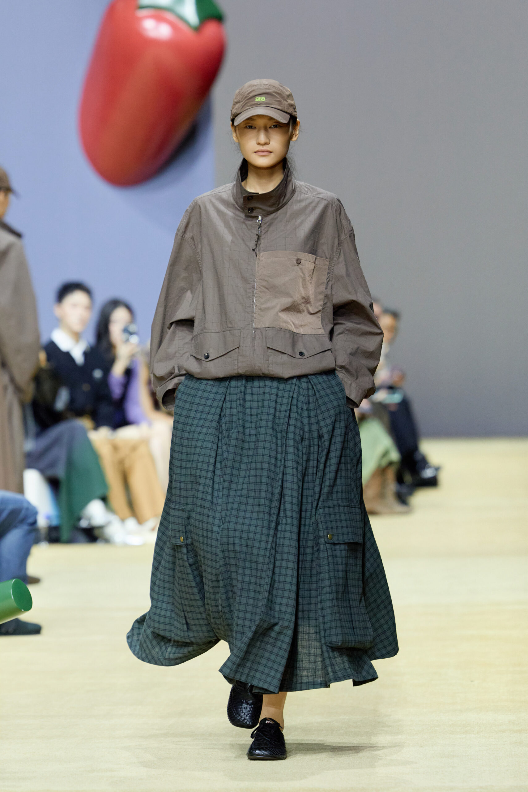 本季融入城市路跑文化、传统手工压褶和编织工艺。设计师龚力以超现实主义的视角诠释外收内放的城市运动者形象,将当代城市新中产内心对自然的向往和对追逐的渴望,用具体视觉热烈表达:流动的缩褶刺绣服饰、手工编织的皮质跑鞋展现出手工技艺与科技面料完美交融。大地色系的陶土红与 充满活力的霓虹色调碰撞出兼具松弛与动态感的轮廓,新鲜脱俗的民族手工艺与城市通勤风格的巧妙融和,传达出身处现实却神游四海的跳脱平衡。