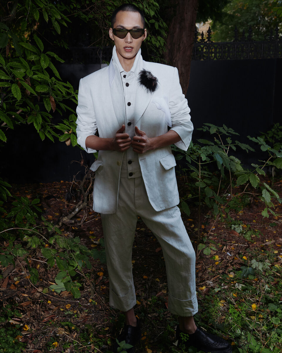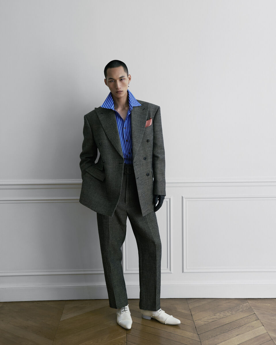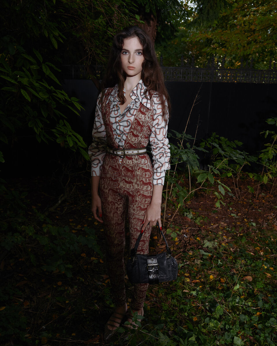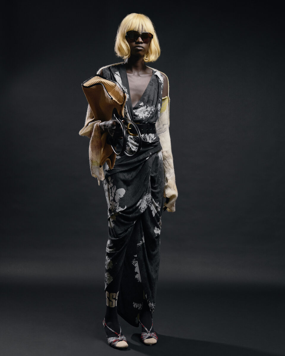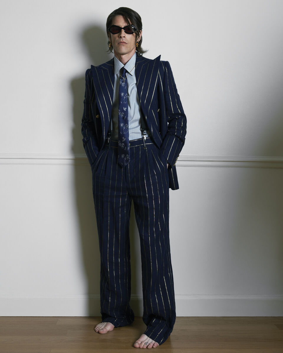 此外,系列还包含了 Andreas Kronthaler 的近期 T 台作品,展现品牌日益流动的设计风格。包括男女皆可穿的袋腰裤、飘逸的墨色印花连体裤和亮片塔夫绸晚礼服。运动感的元素,如俏皮的面罩形太阳镜和更丰富的经典剪裁,则吸引了通过 Depop 和 Bella Hadid 等途径对 Vivienne Westwood 产生浓厚兴趣的年轻人群,特别是那些追求重新剪裁和重塑轮廓的年轻男性。