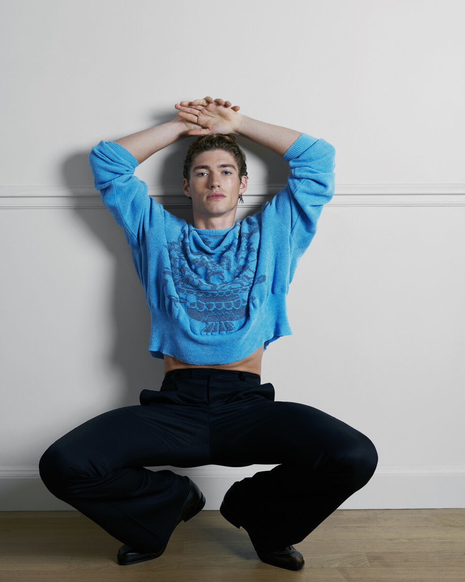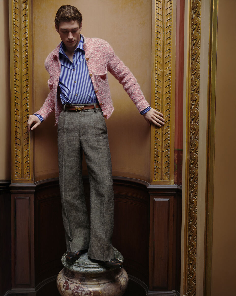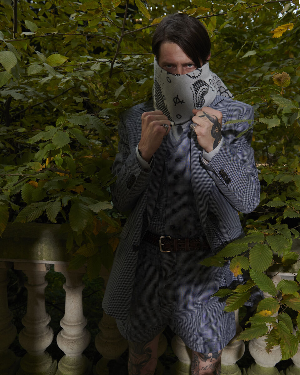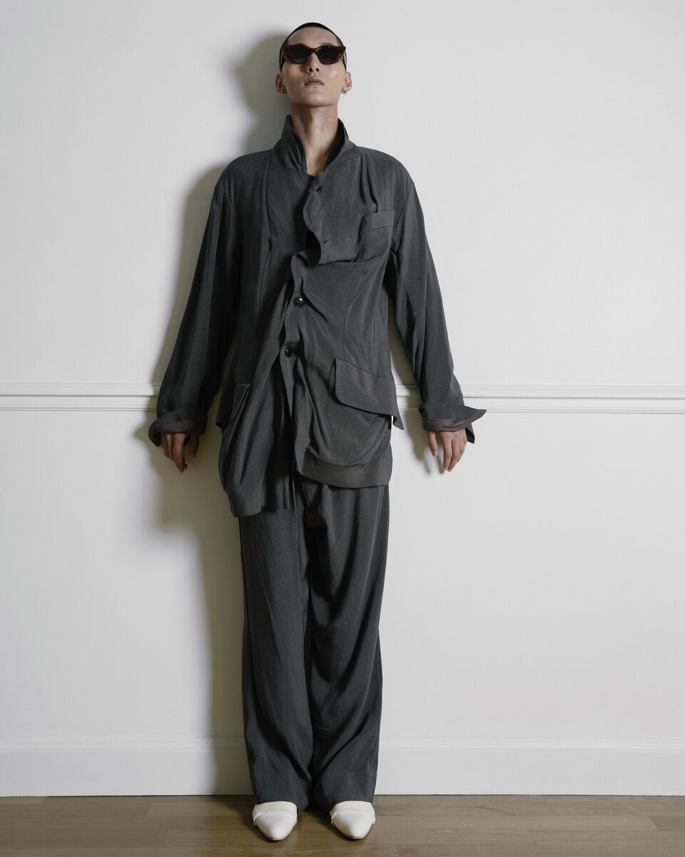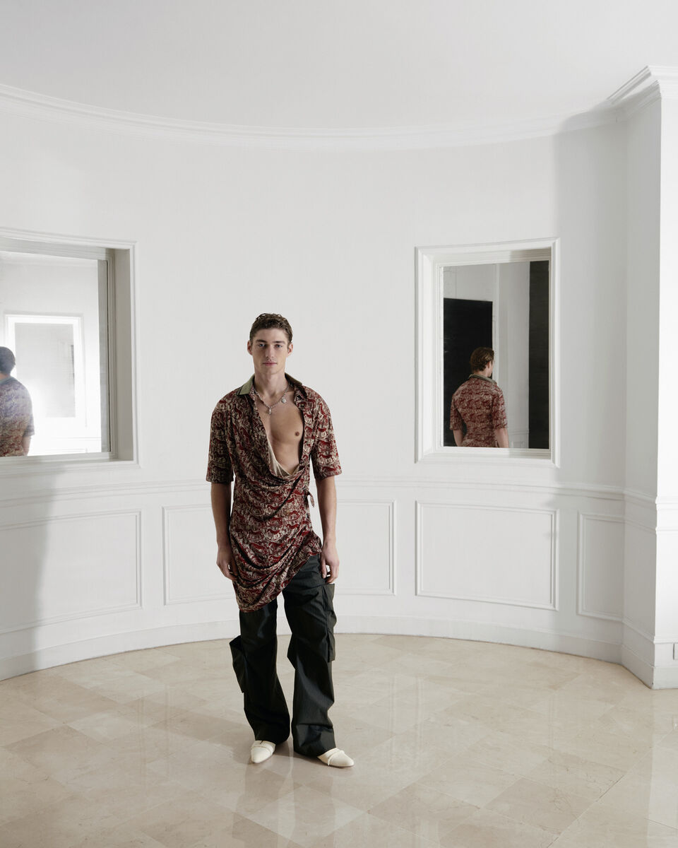 此外,系列还包含了 Andreas Kronthaler 的近期 T 台作品,展现品牌日益流动的设计风格。包括男女皆可穿的袋腰裤、飘逸的墨色印花连体裤和亮片塔夫绸晚礼服。运动感的元素,如俏皮的面罩形太阳镜和更丰富的经典剪裁,则吸引了通过 Depop 和 Bella Hadid 等途径对 Vivienne Westwood 产生浓厚兴趣的年轻人群,特别是那些追求重新剪裁和重塑轮廓的年轻男性。