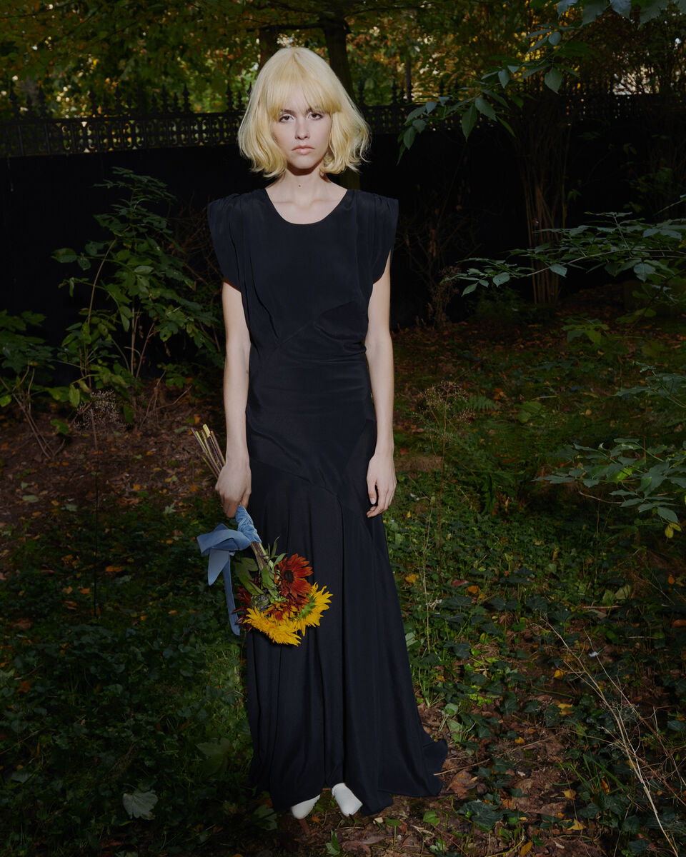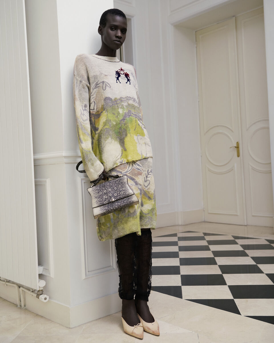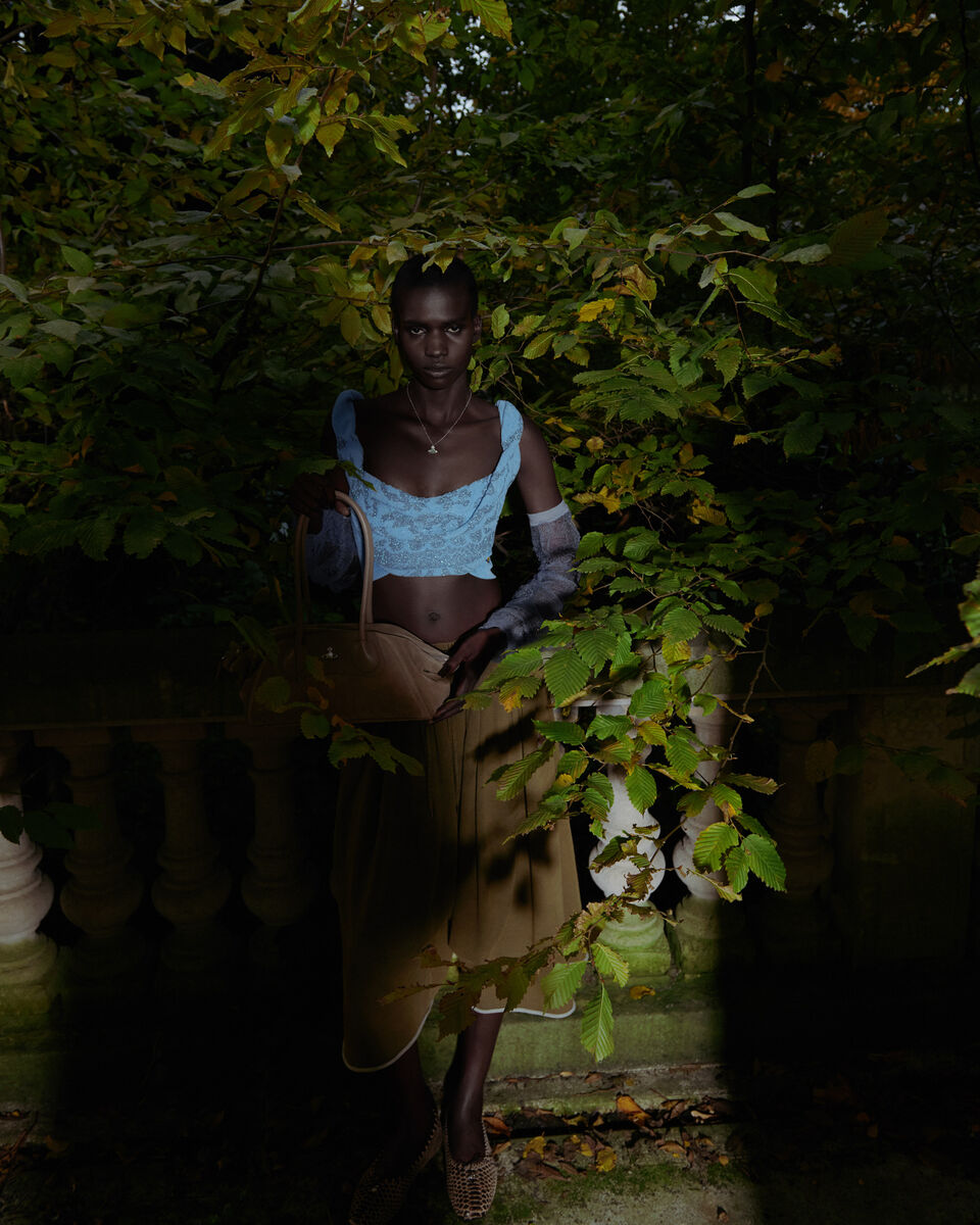 Vivienne Westwood 的 2026 春季系列灵感源自伦敦佳士得拍卖行展出的已故 Dame Vivienne Westwood 的衣橱,包括她 1983 年秋季的 Witches 系列、灯芯绒西装和 18 世纪刺绣样品。这些展品激发了设计灵感,呈现适合在英格兰荒原上游走的服饰,探索植物间的黑暗与衰败。
