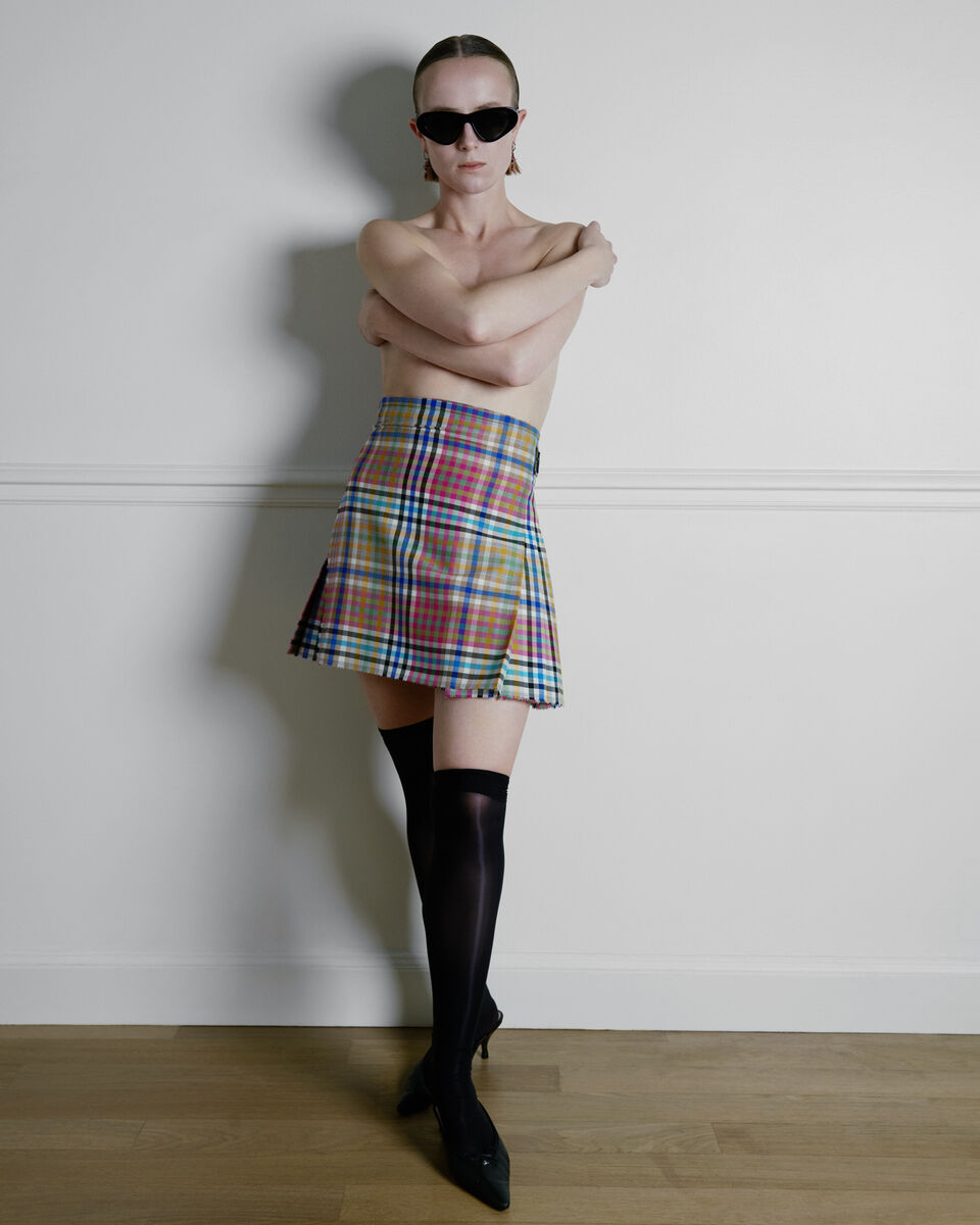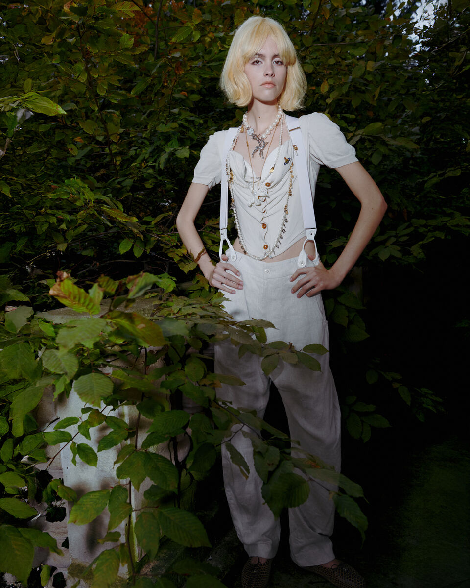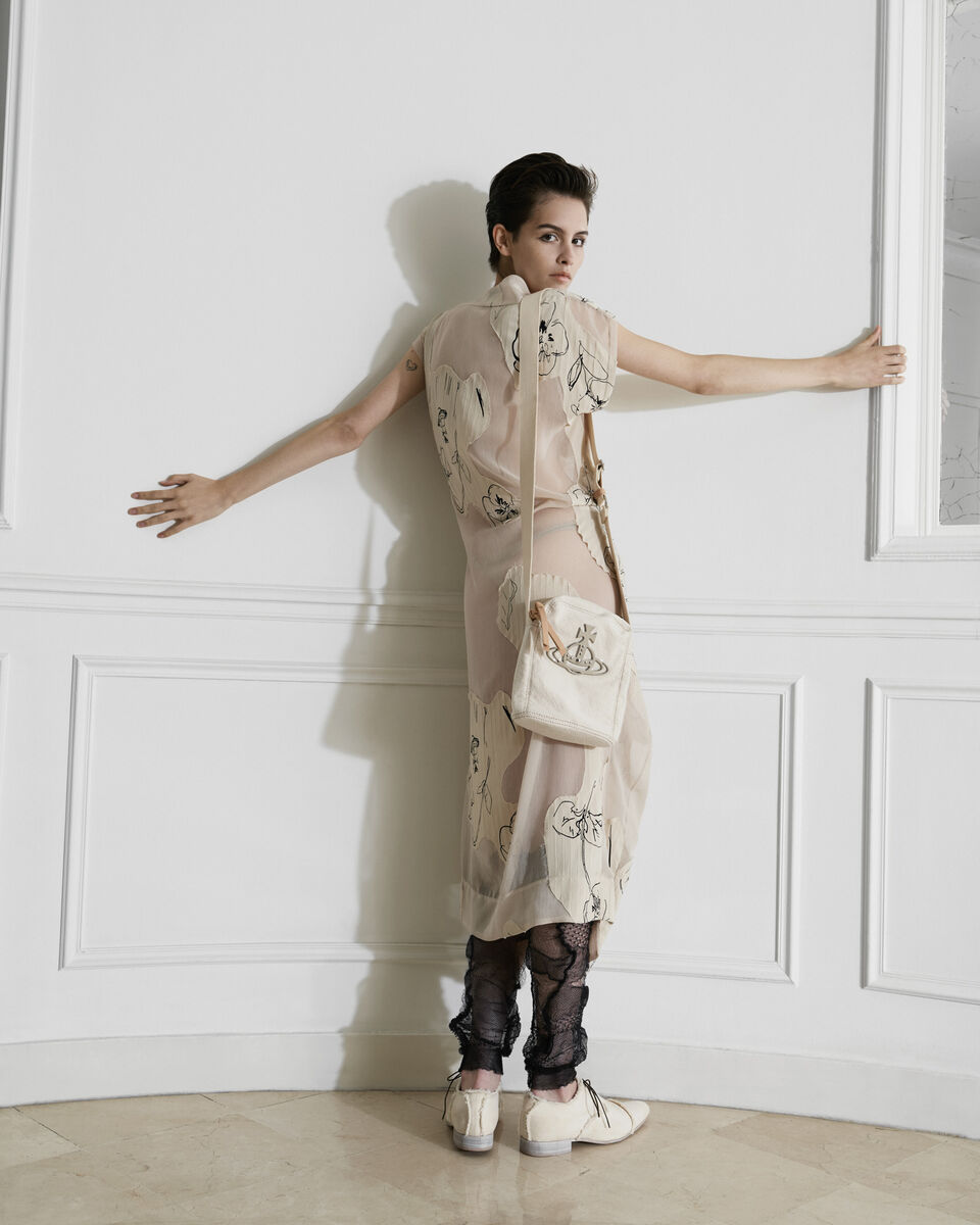 系列融合了洛可可风格西装、Bettina 夹克、迷你裙和短裤,采用处理过的牛仔布、风吹丝绸和有机面料,呈现随意、凌乱的感觉。经典的星期日裙用褶皱纱布制作,推出了多款高能彩色格子呢裙。柔软的针织套装印有艺术家 Dominic Myatt 重新演绎的 Paradise 印花,致敬 Vivienne Westwood。