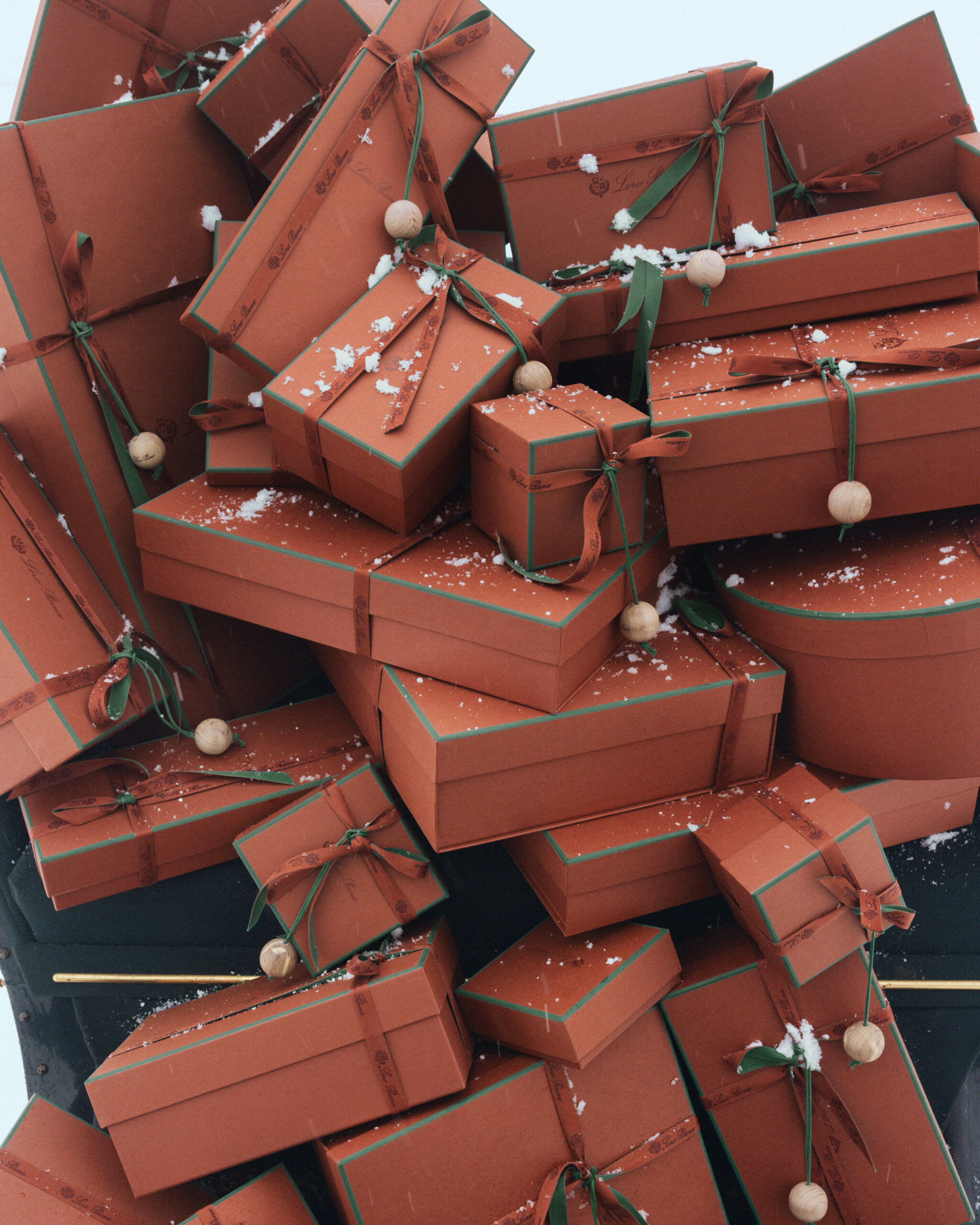 被雪覆盖的橱窗内,Loro Piana 标志性 Kummel 色礼盒,陈列着身穿精选冬季服饰的模特人台。其间点缀着 Kummel 色和绿色的小木偶,它们在忙着为节日做准备——有的在努力保持平衡,有的为观众表演戏法,还有的在高空绳索上漫步。最终,它们簇拥在成堆的品牌标志性礼盒旁,等待着盒中的惊喜好礼开启。