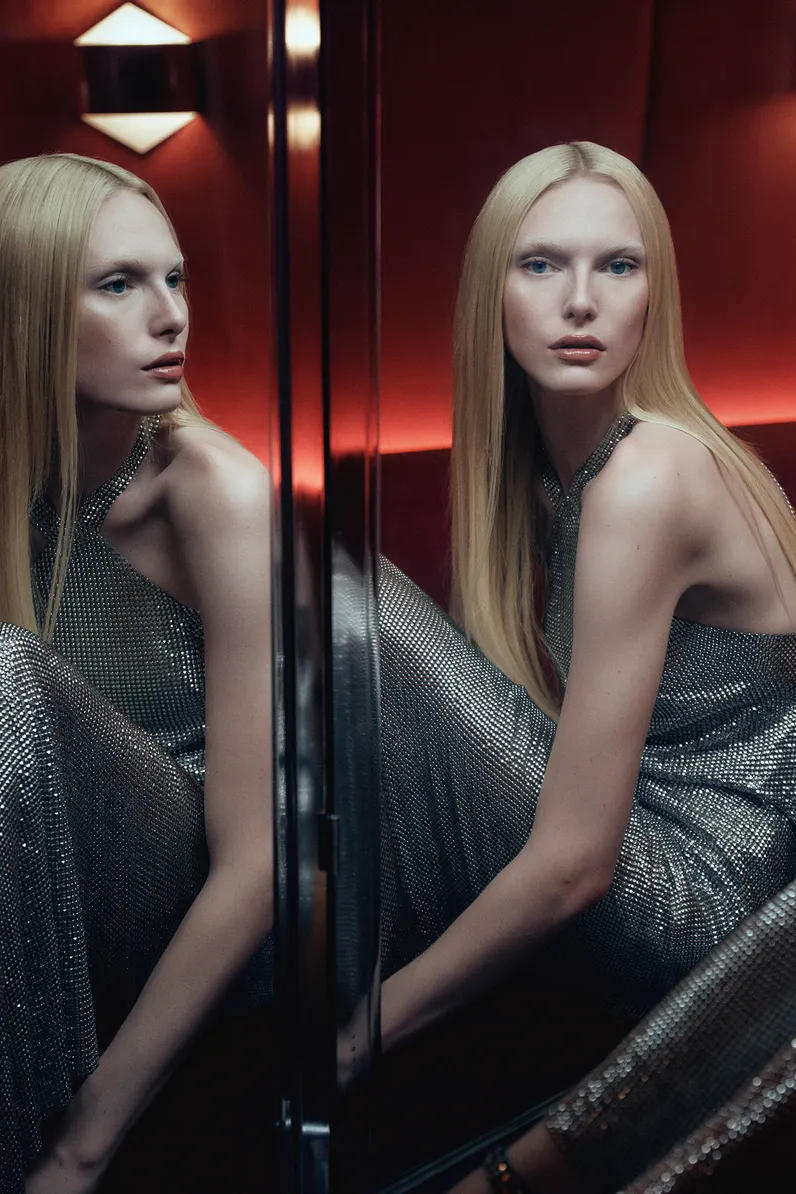 系列中,皮革单品占据重要位置,包括外套、大衣、迷你裙胸罩和裤子,配有钉子装饰。亮点还包括一款黑色马皮大衣、金属网格连衣裙、闪亮的吊带背心和礼服,以及用羊毛或丝绸杜塞丝布料定制的剪裁单品。基础款如印有品牌标志的背心和石洗牛仔单品,以及配饰如皮带和手套也包含在内。