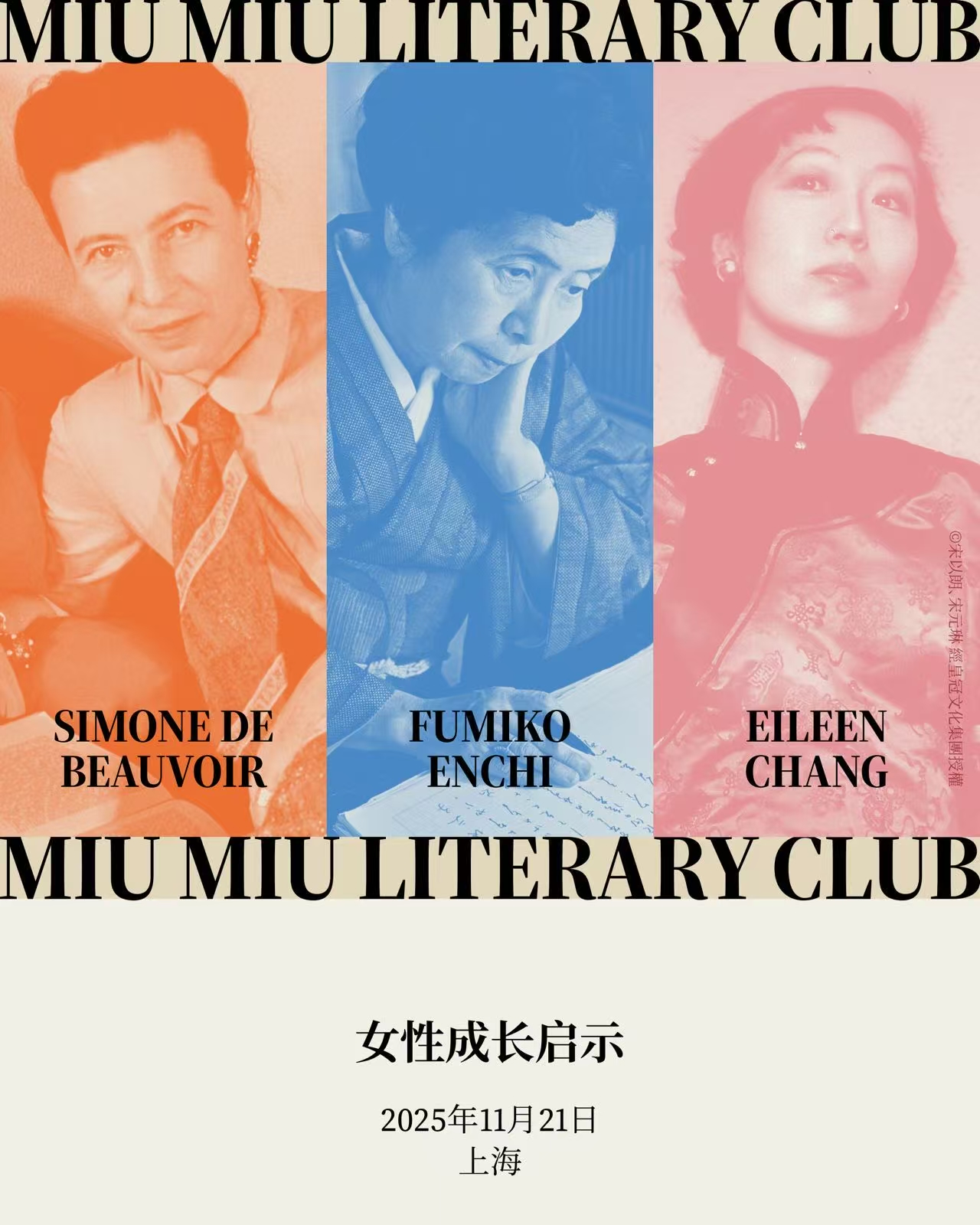 Miu Miu 呈现文学俱乐部上海站活动。以「女性成长启示」为主题,探讨三位女性文学大师的作品:法国存在主义学者西蒙娜·德·波伏瓦(Simone de Beauvoir);日本昭和时代最杰出的女性作家之一圆地文子(原名上田富美)以及当代中国文学的卓越代表张爱玲。