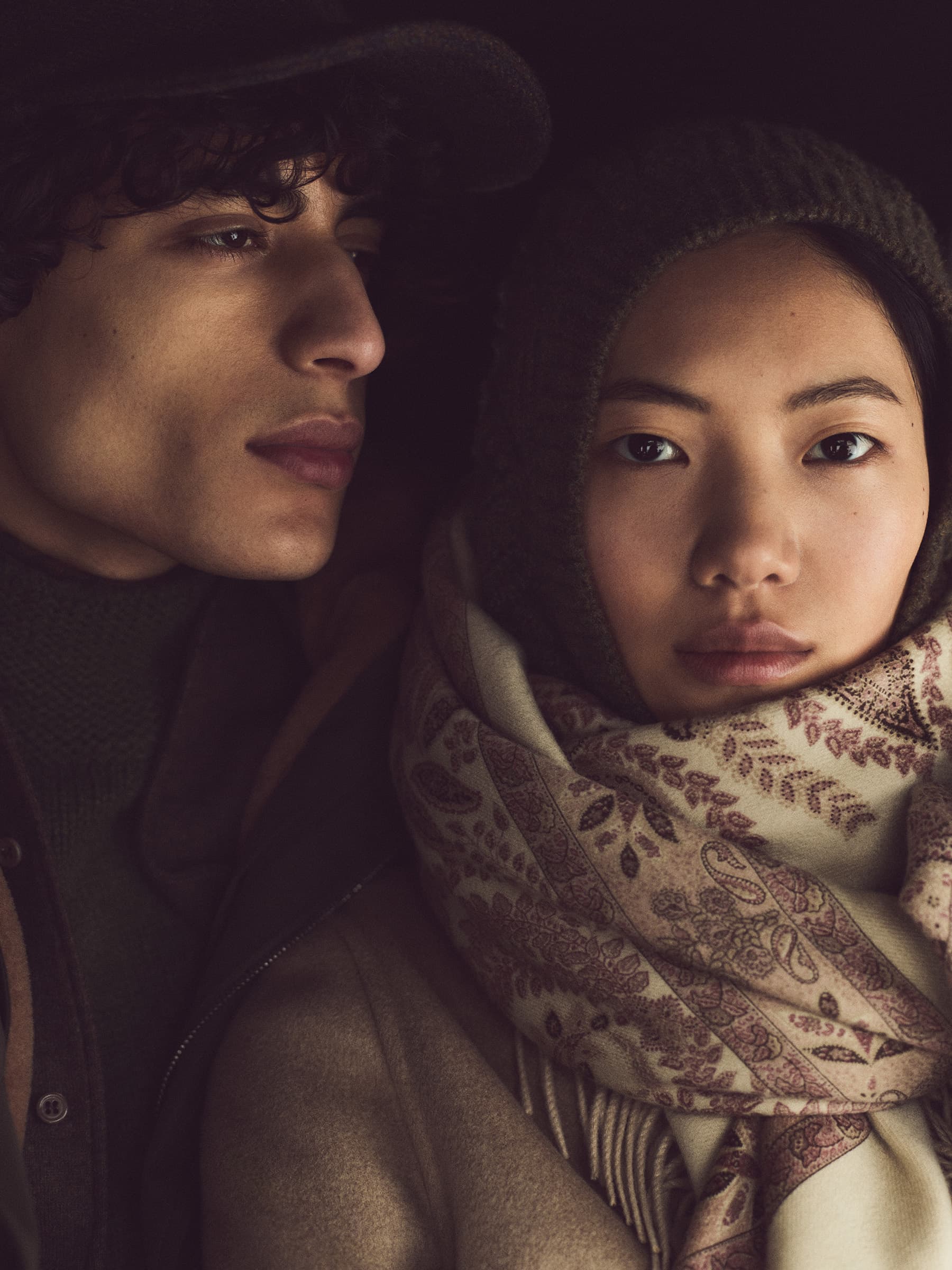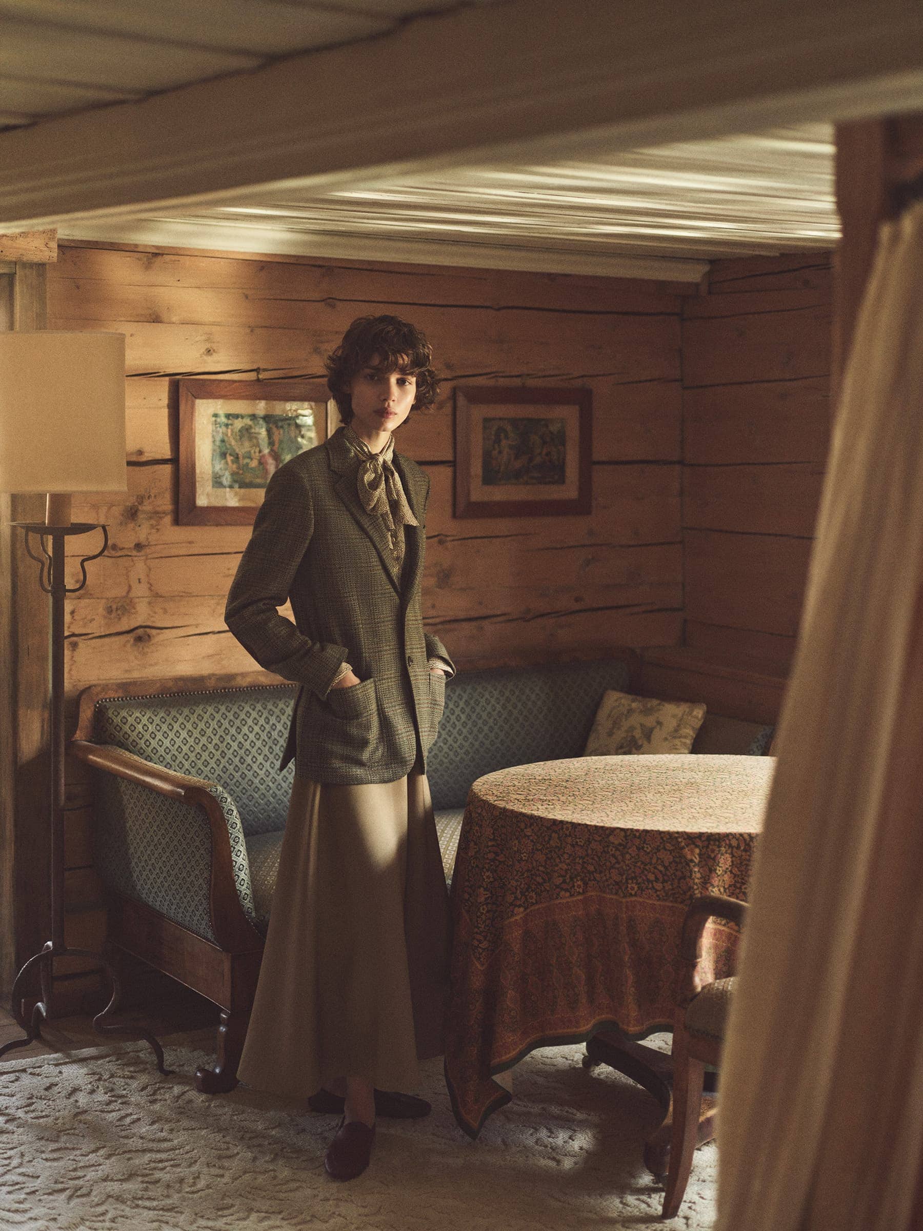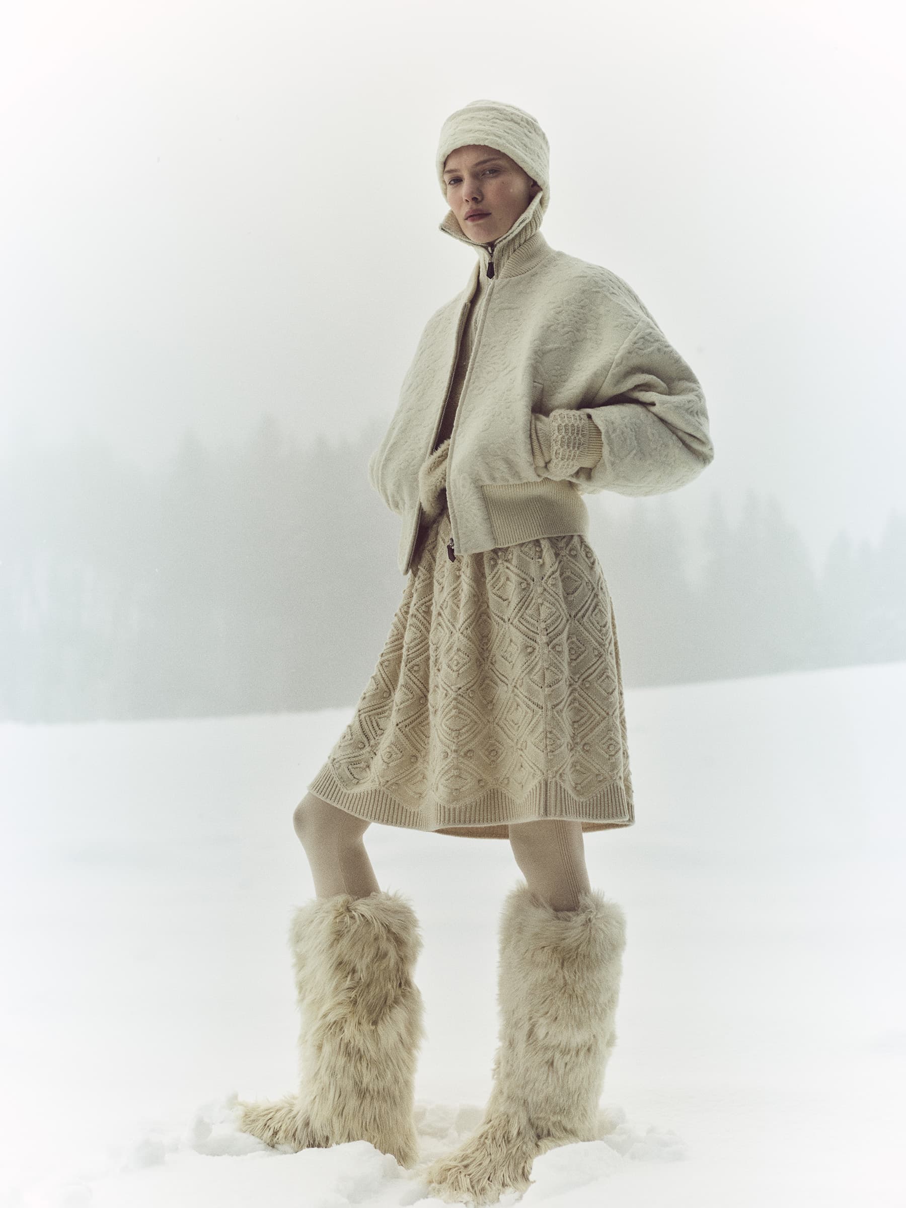 在众多品牌追逐璀璨光辉的季节里,Loro Piana 传递的更多是情感而非时尚。每一件衣物都与环境融为一体——婴儿羊绒在晨光中微微起伏,丝绒吸收阴影,双重羊驼毛如薄雾般铺展。色调——褐色、苔藓绿、树皮色、赭石——唤起自然与怀旧。它不是传统意义上的节日装扮,而是作为一种温暖、缓慢、触感的假日体验。