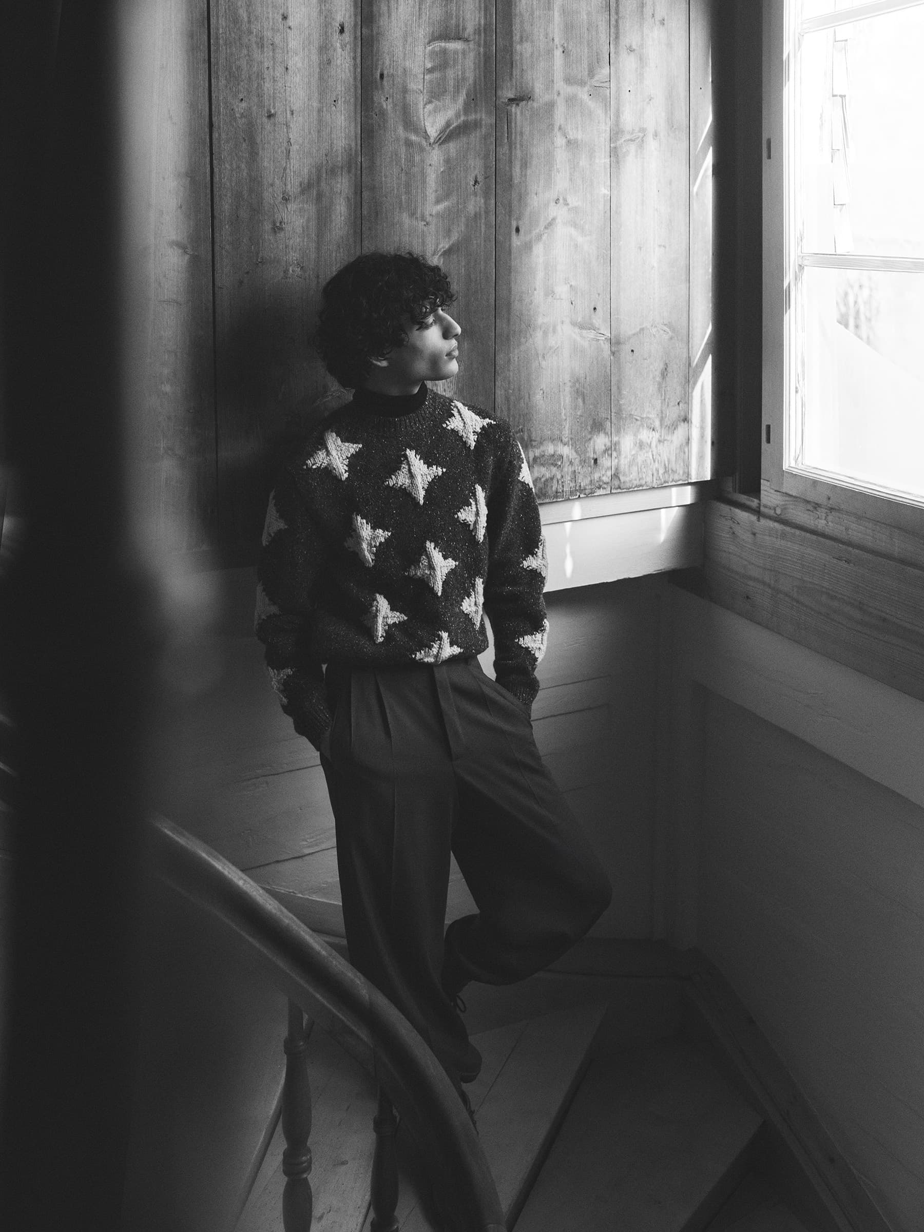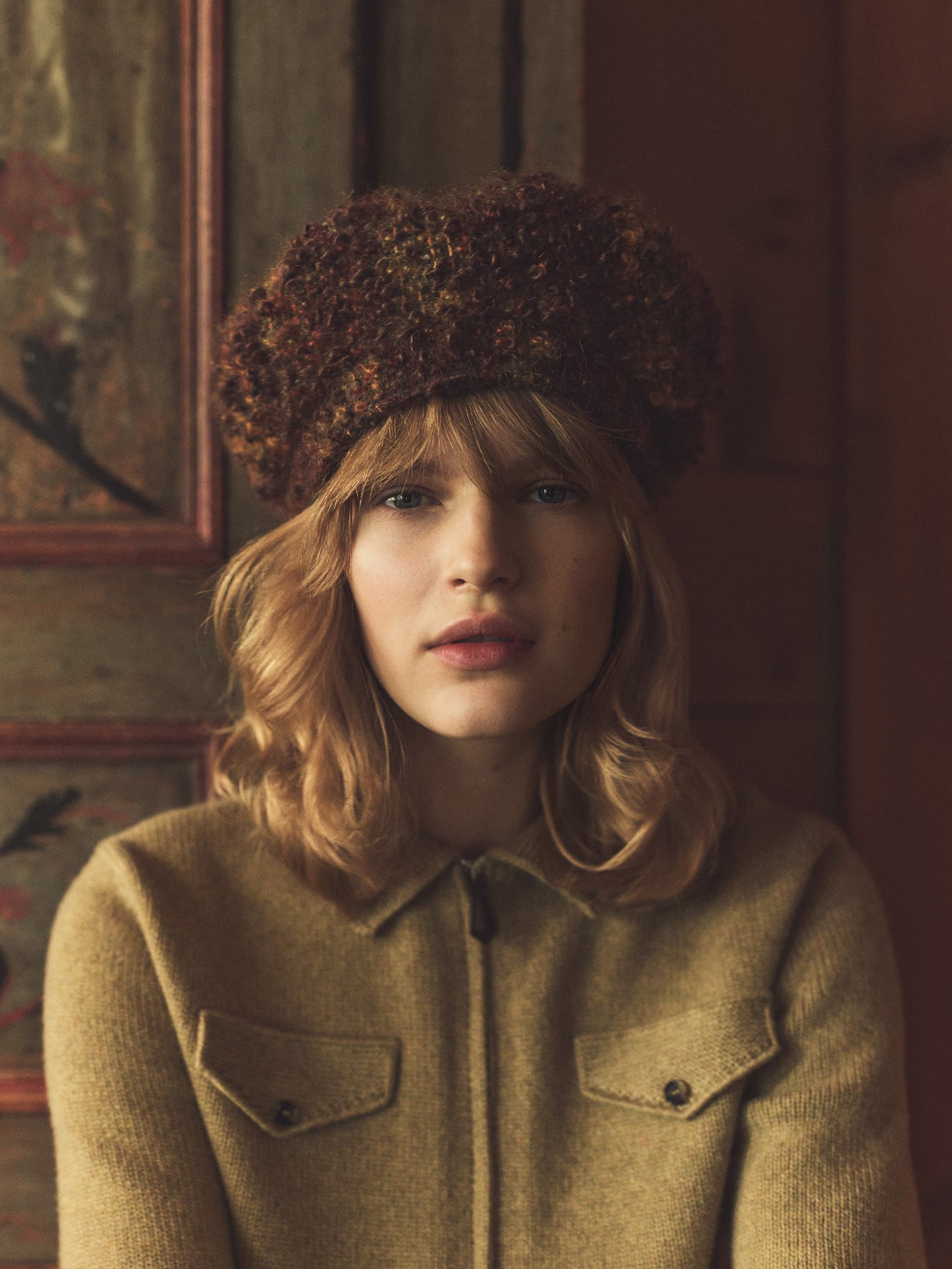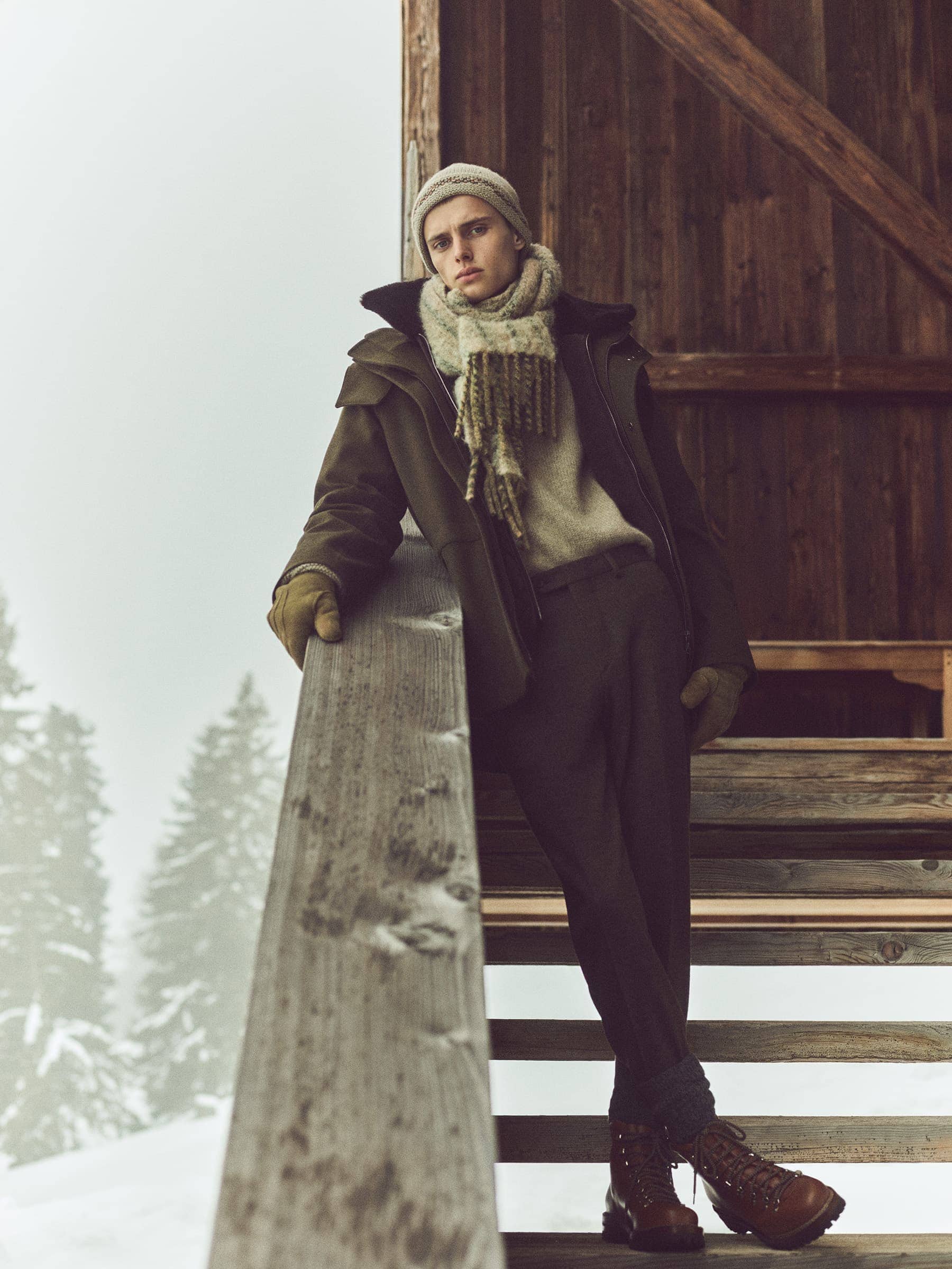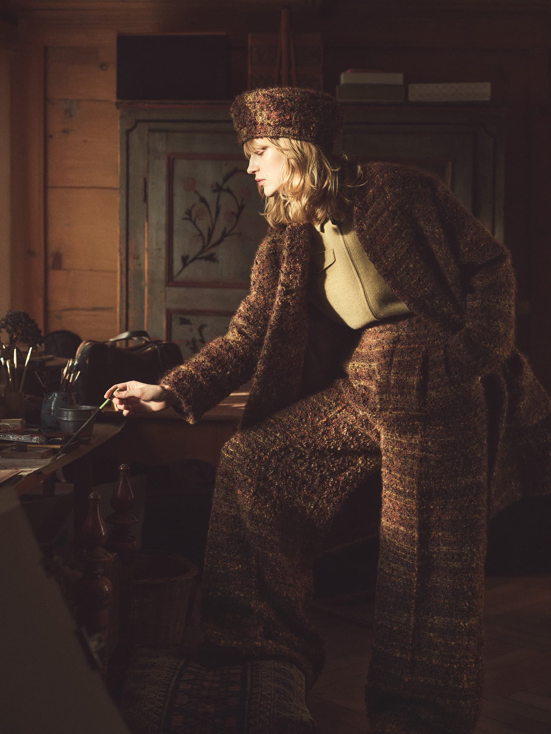广告场景在木屋的温暖与外面的冬季静谧之间交替,节奏悠然、温柔。一位画家被褐色毛料包围,沐浴在黄昏的余晖中;一名男子站在古旧的门前,他的羊绒大衣与门的纹理相得益彰;另一个人物,裹在围巾与孤寂中,倚靠着被雪覆盖的木梁。每个镜头都显得自然流畅,仿佛摄影师只是轻轻走进了生活在 Loro Piana 世界中的人们的日常。