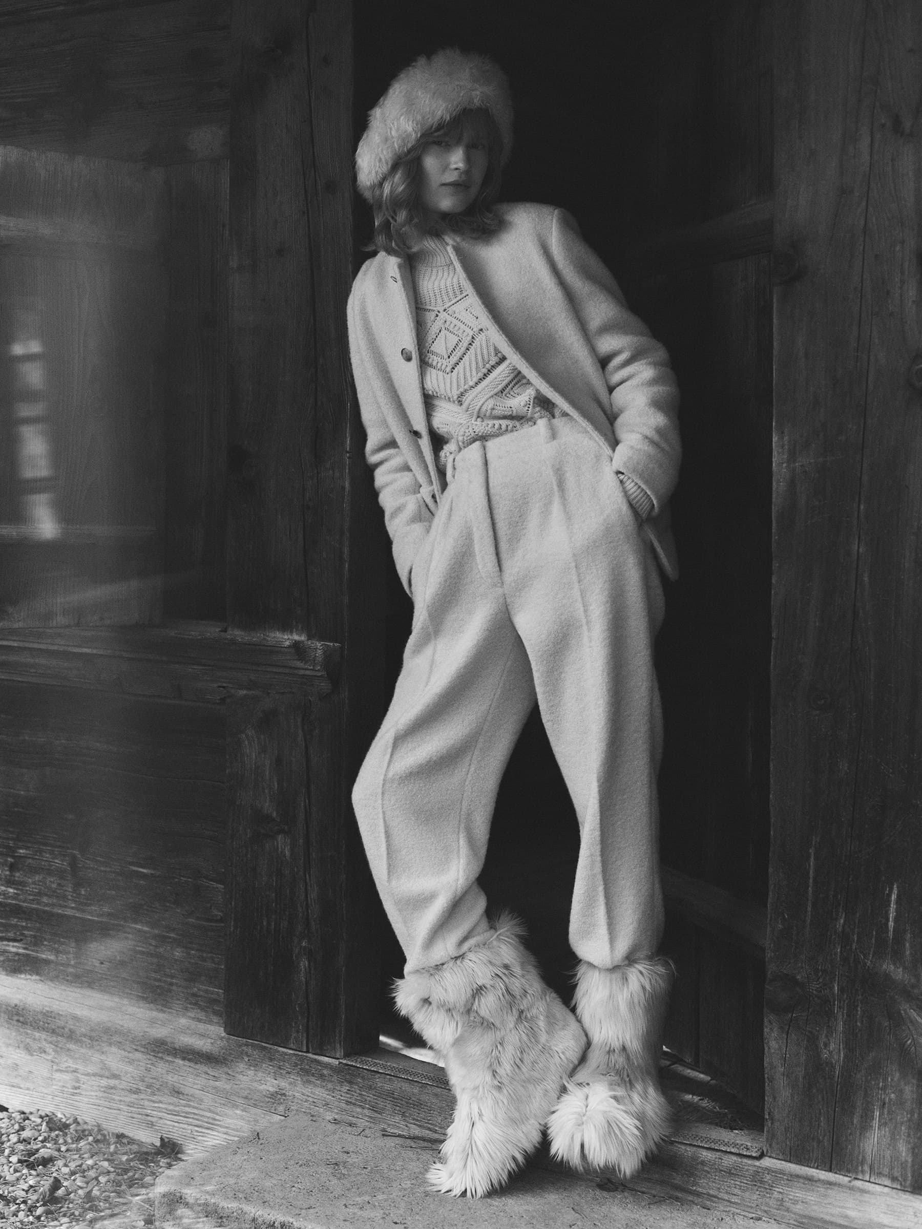 Loro Piana 2025 假日系列广告以一种宁静而熟悉的方式呈现,通过光线、质感与时间的低语展开。广告由 Annemarieke van Drimmelen 拍摄,画面以柔和的色调和模糊的焦点呈现,仿佛从一个被遗忘的老电影胶卷中找到,每一帧都显得异常私密——羊毛与木材的接触,天鹅绒与肌肤的相依,微弱的呼吸在阿尔卑斯山脉的寒冷空气中若隐若现。