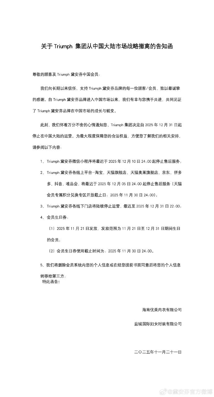 拥有 130 余年历史的德国内衣品牌 Triumph 黛安芬宣布将于 2025 年 12 月 31 日关闭中国内地全部线下门店,全部线上商店也在 12 月 5 日前全部关闭。黛安芬在 1886 年创立,于 2008 年进驻中国,是最早将钢圈内衣引入中国的品牌之一。此次大规模撤店,被业内普遍视为品牌战略性收缩的信号。品牌在 2017 年也曾关闭了英国的门店,此次在中国市场收缩,很可能是总部在进行全球资源重配,希望能集中到回报率更高的市场。