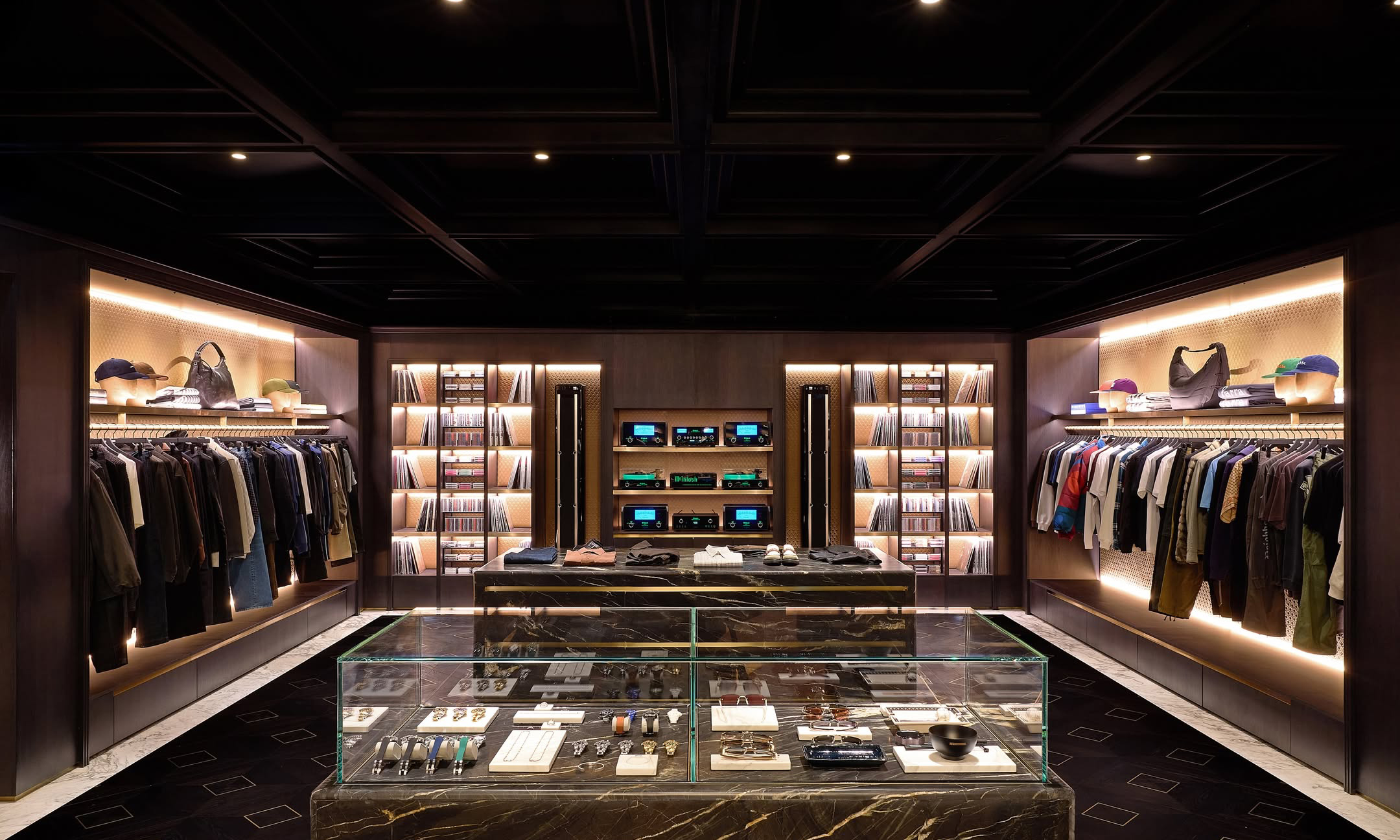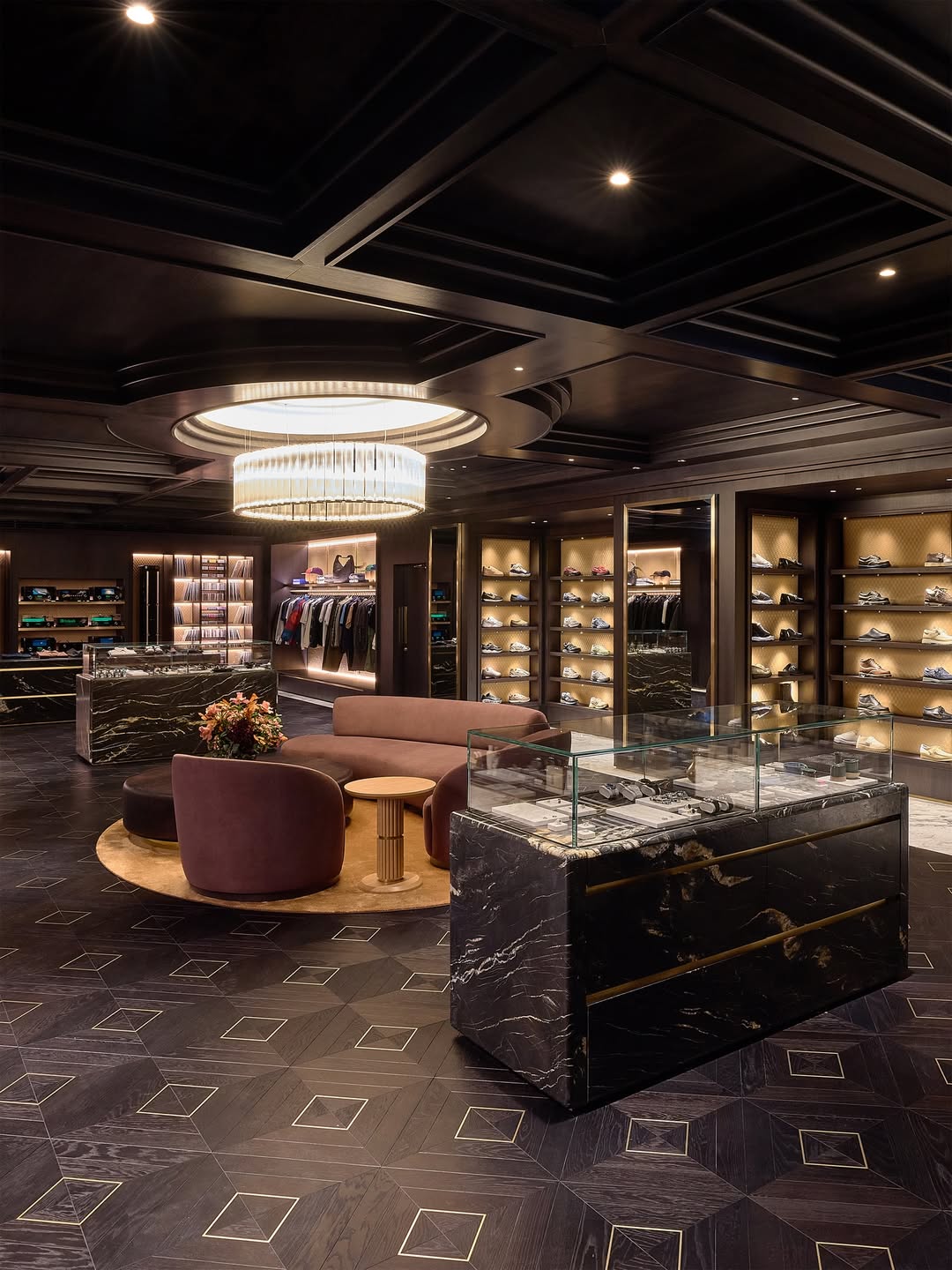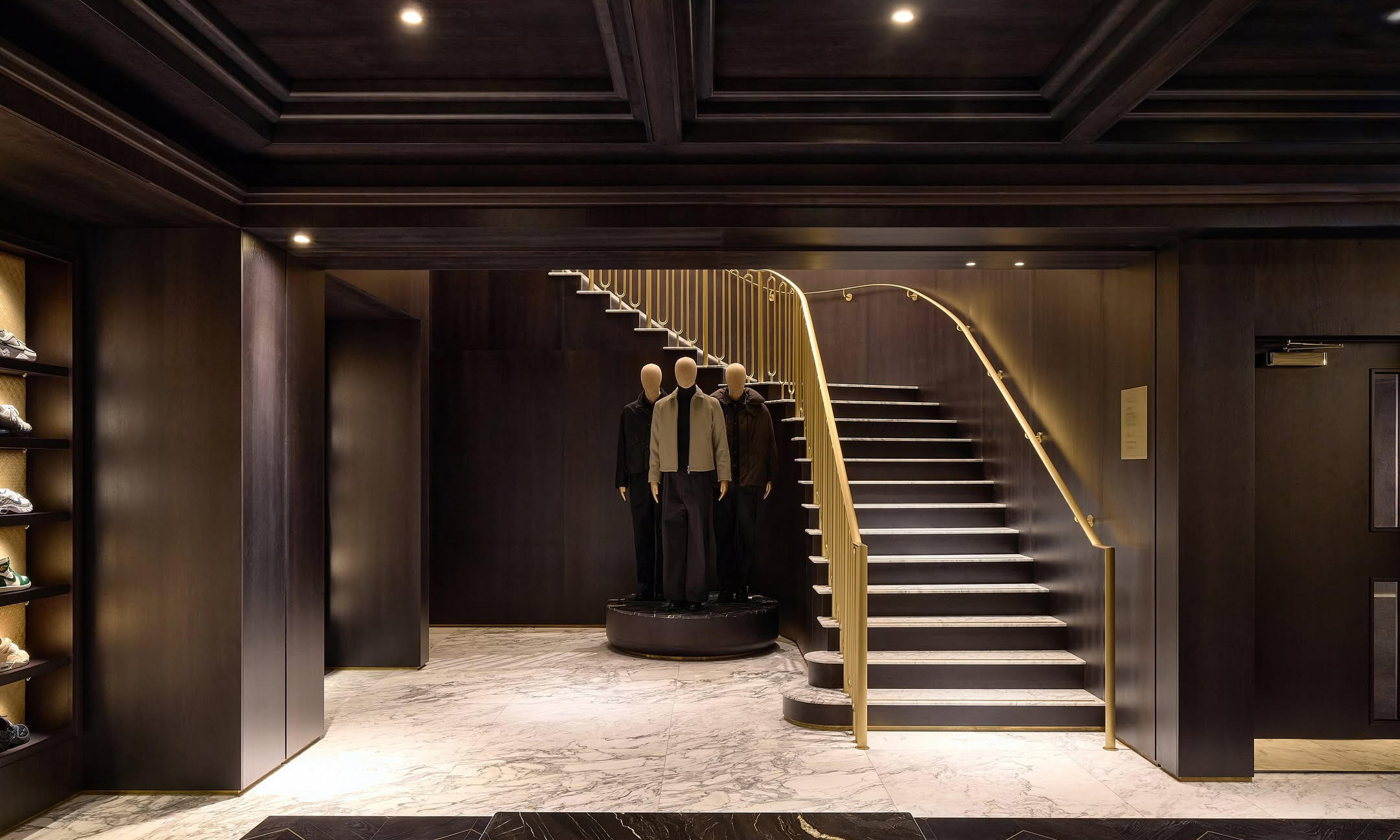 女装区域这一空间设计采用定制的白橡木木工、Tiffany 大理石、Estremoz 大理石墙面和 Pentelikon 大理石带等奢华材料。男装则采用深色调的胡桃木木工、Belvedere 大理石墙面和 Calacatta Vagli 大理石桌面,空间内还融入了 Kith 品牌独有的皮革工艺,深木色的鱼骨地板、绿色天鹅绒装饰、以及内嵌灯光营造出高雅氛围。