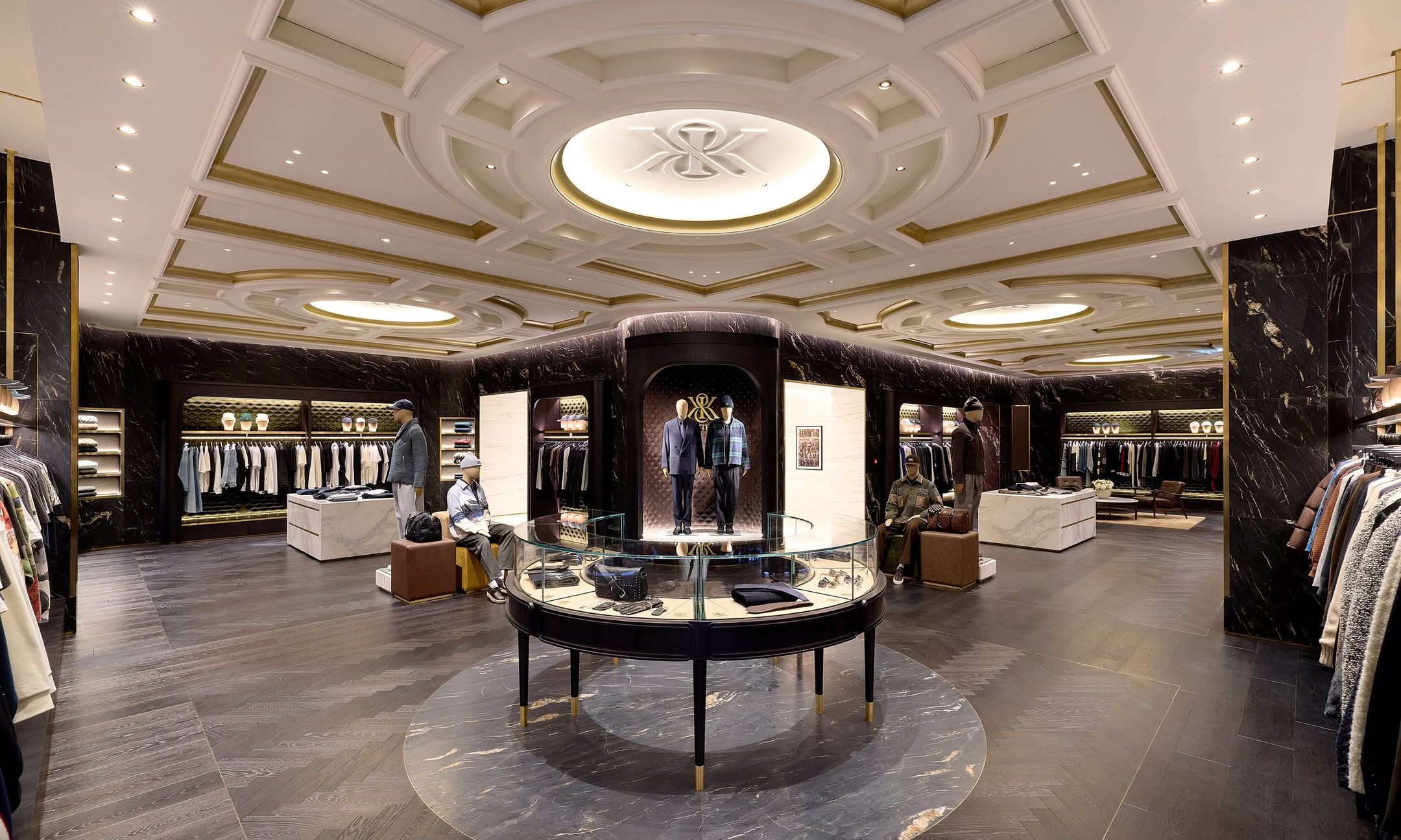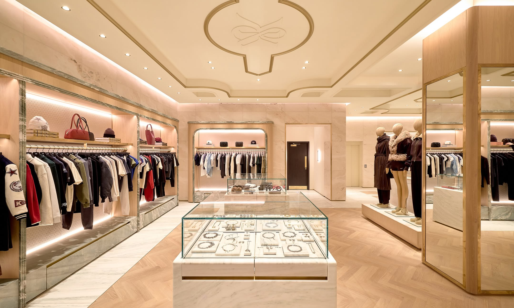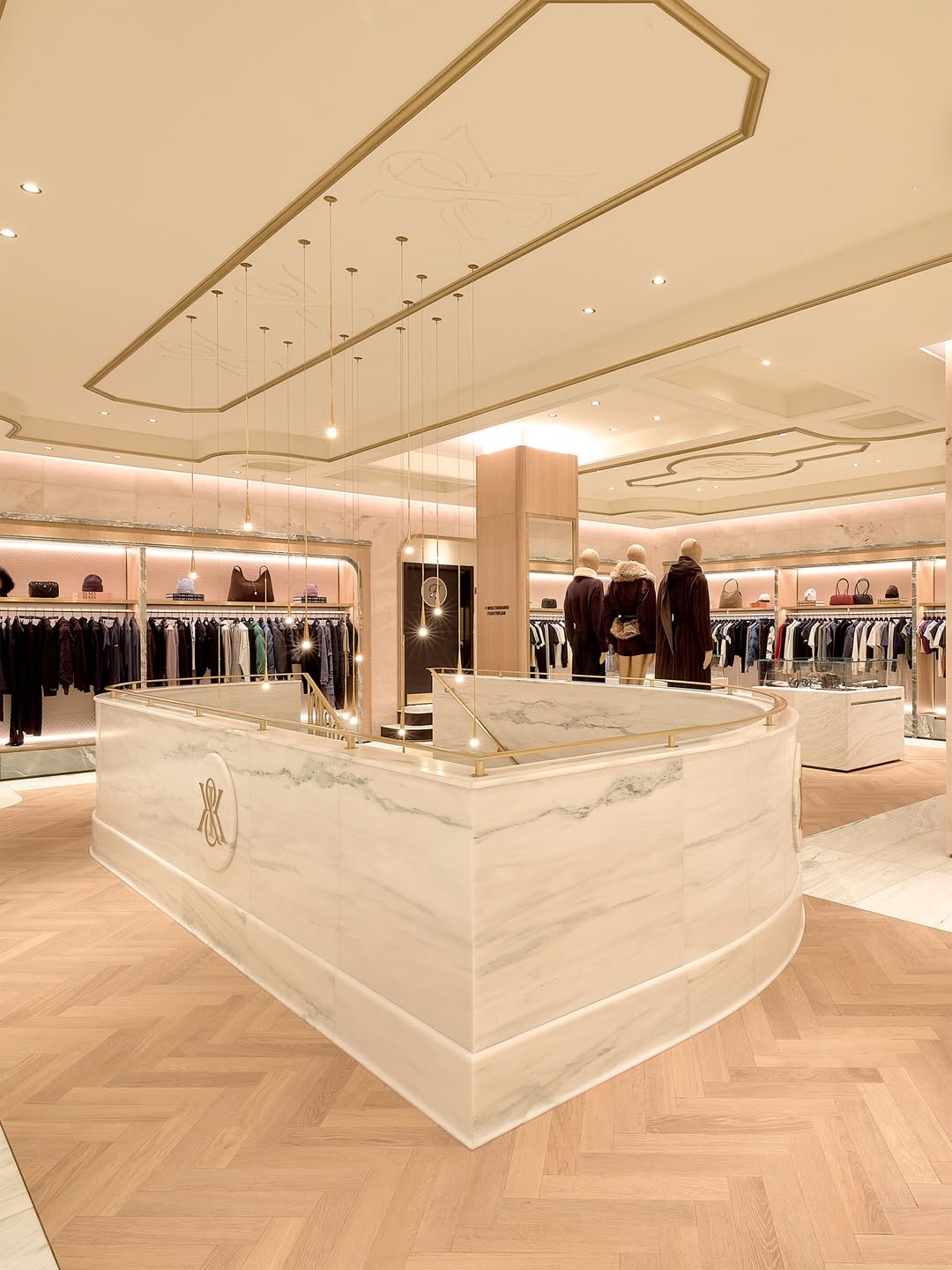 女装区域这一空间设计采用定制的白橡木木工、Tiffany 大理石、Estremoz 大理石墙面和 Pentelikon 大理石带等奢华材料。男装则采用深色调的胡桃木木工、Belvedere 大理石墙面和 Calacatta Vagli 大理石桌面,空间内还融入了 Kith 品牌独有的皮革工艺,深木色的鱼骨地板、绿色天鹅绒装饰、以及内嵌灯光营造出高雅氛围。