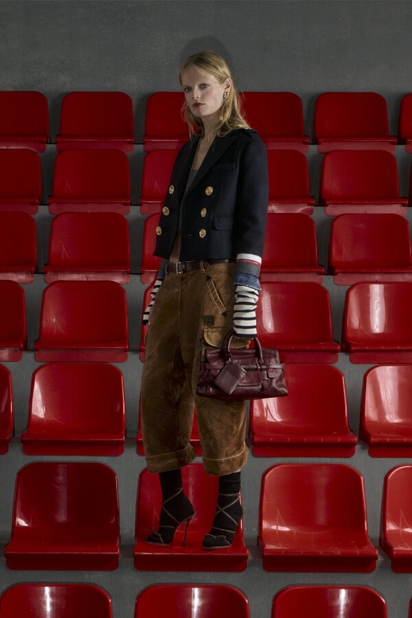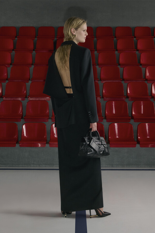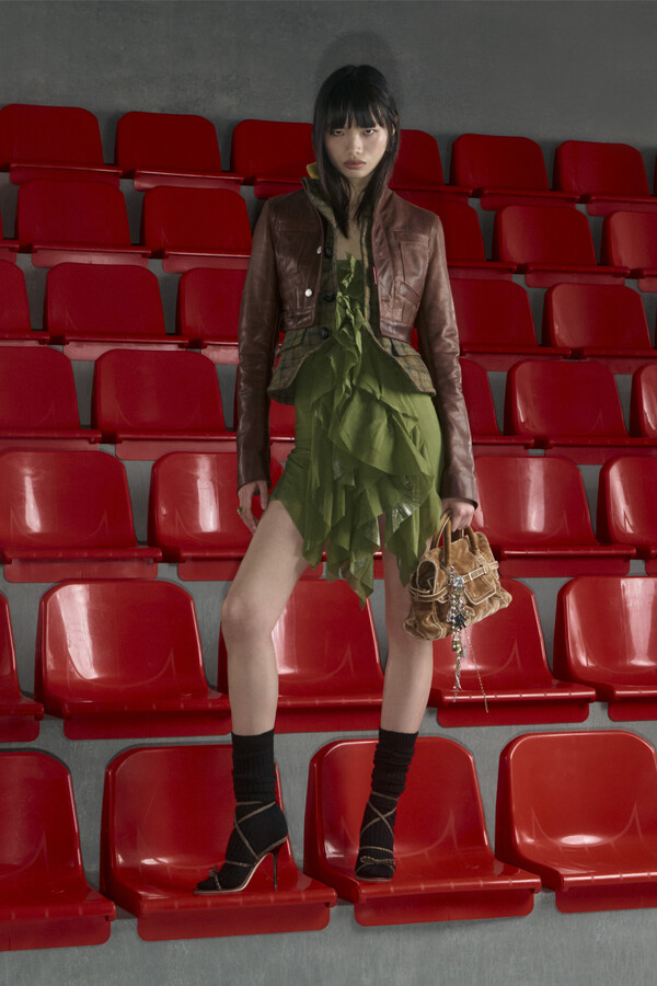 经历了扩张和结构调整的一年后,Dsquared2 回归其核心叙事。在 2026 早秋系列中,设计师们巧妙地运用了运动感与性感之间的张力,将重点放在模糊界限的混搭风格上。外套是重头戏,派克大衣的廓形常常与机车夹克的边缘或牛仔面料的结构融合在一起。诸多单品在下摆和接缝处都加入了金属丝,从而能够巧妙地调整服装的形状——这种看似微小却有效的设计手法,将功能性的廓形转化为雕塑般的立体造型。
