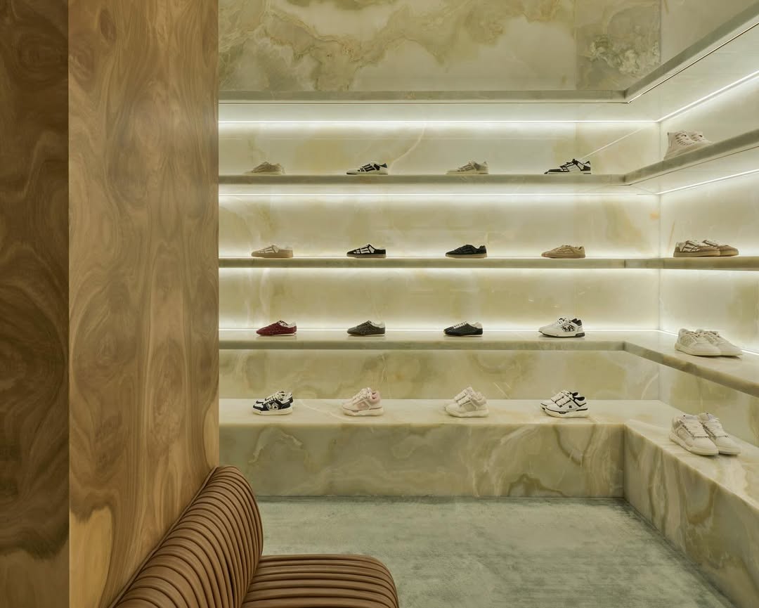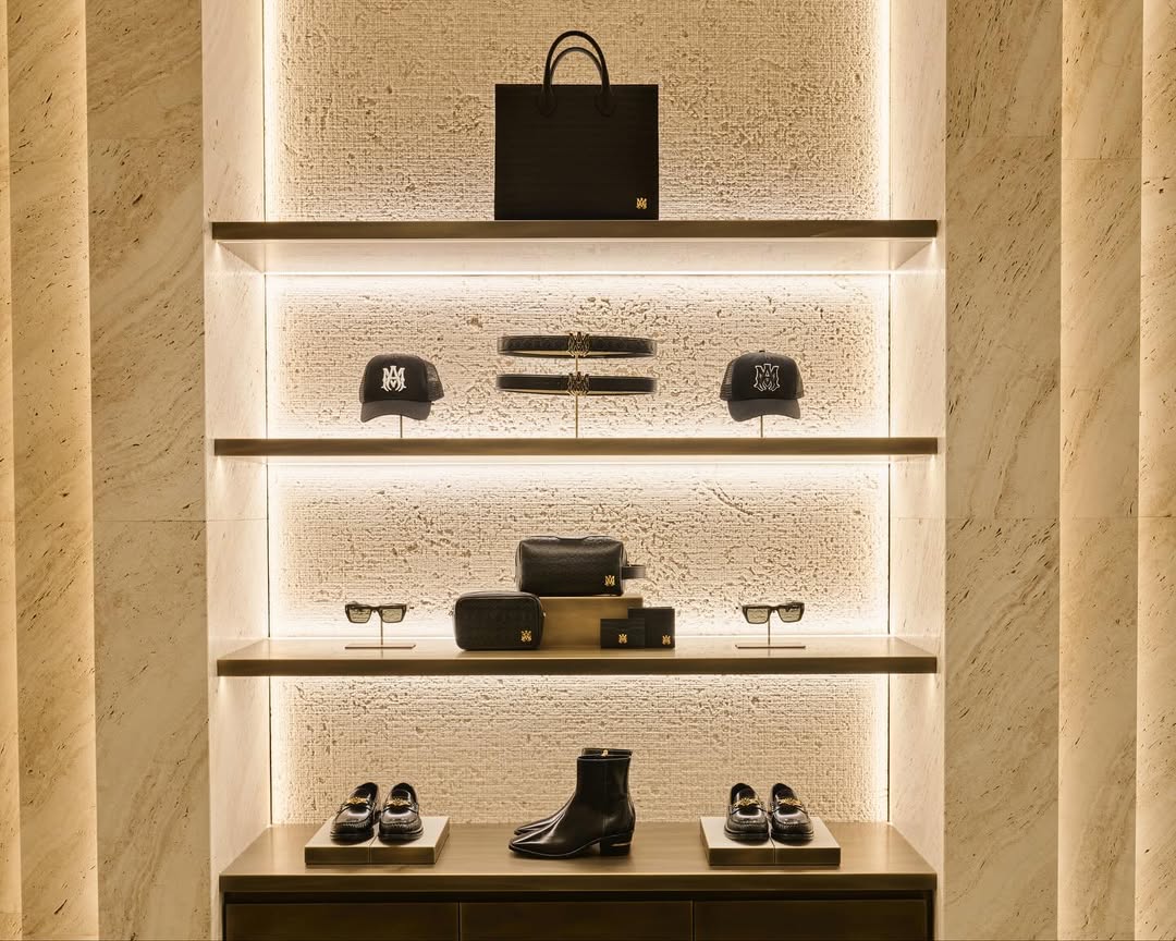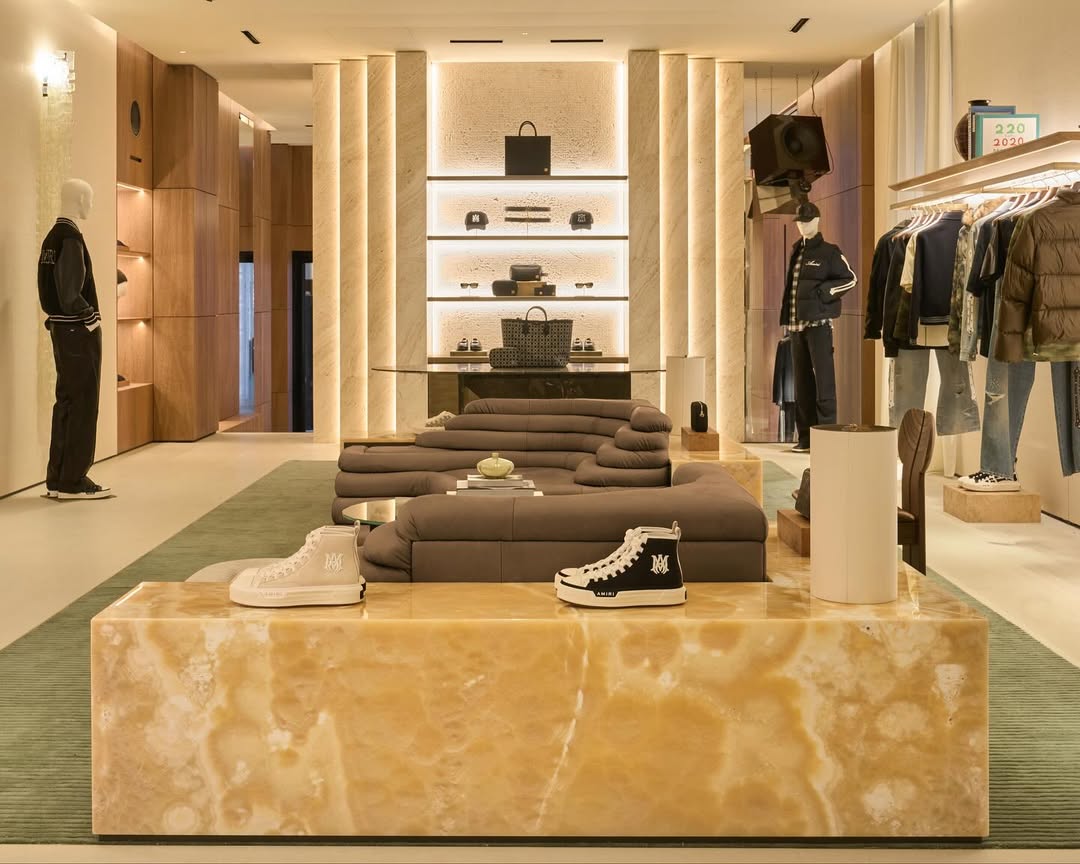 店铺被设计成一系列独立的空间——如同沉浸式的电影场景供顾客体验。映入眼帘的木材、石灰华和石灰石等天然纹理交相辉映,搭配以方格石英石地板,流畅的线条巧妙结合了 20 世纪 20 年代标志性建筑风格,同时兼具好莱坞和米兰的特色。整个空间体现了 AMIRI 的持续发展,及其今年早些时候在米兰开设欧洲总部后,构建全球零售网络的雄心。