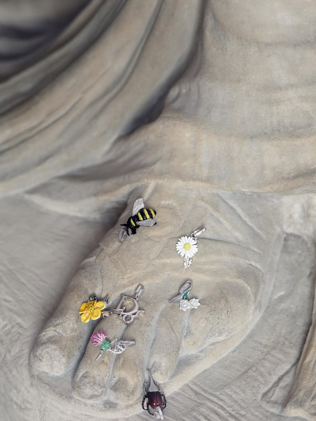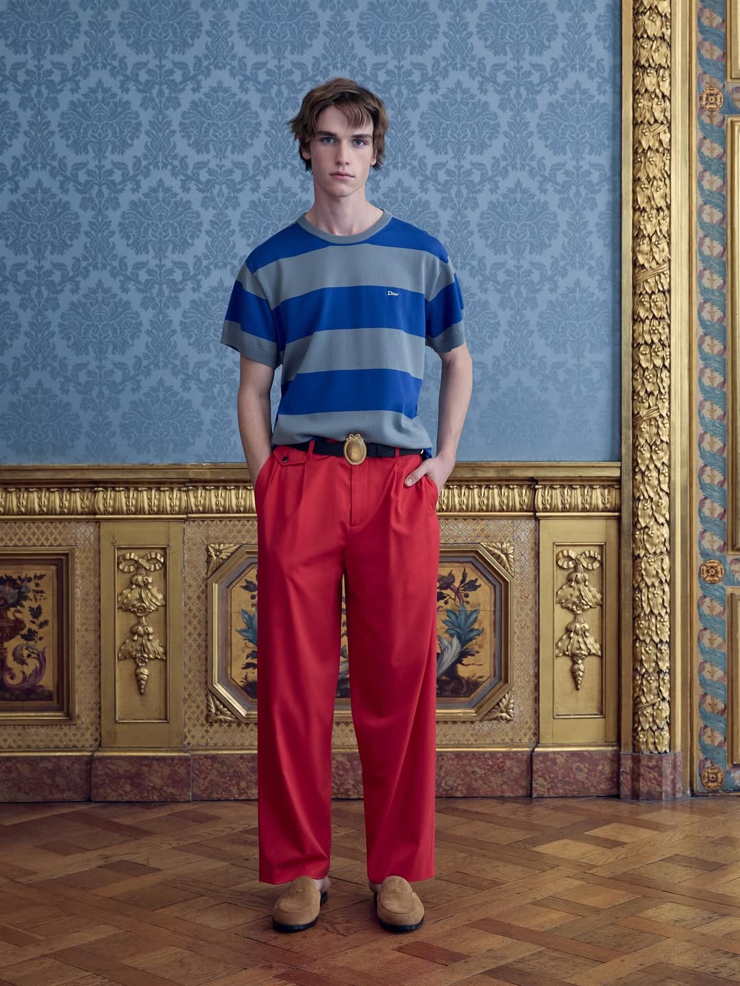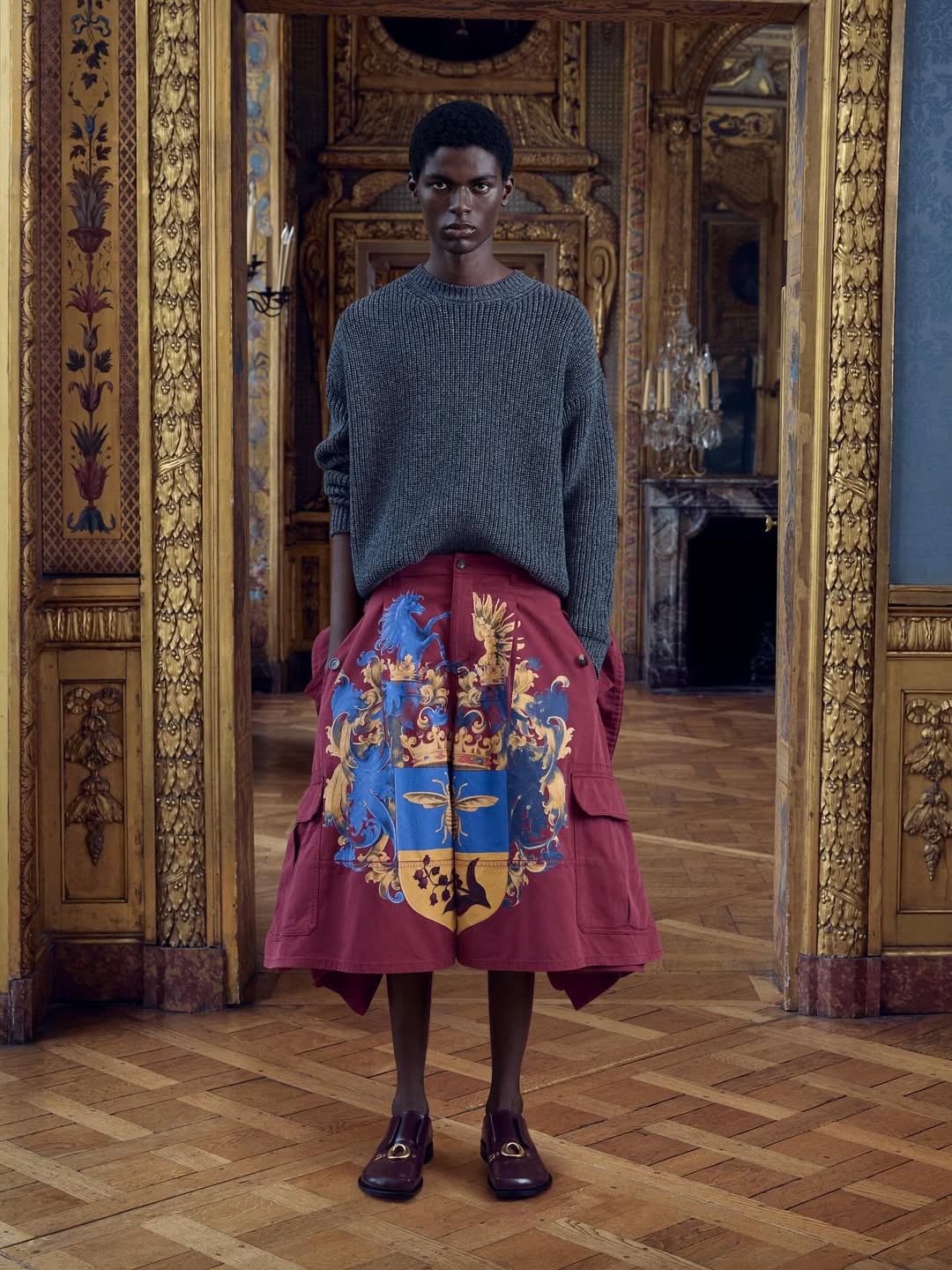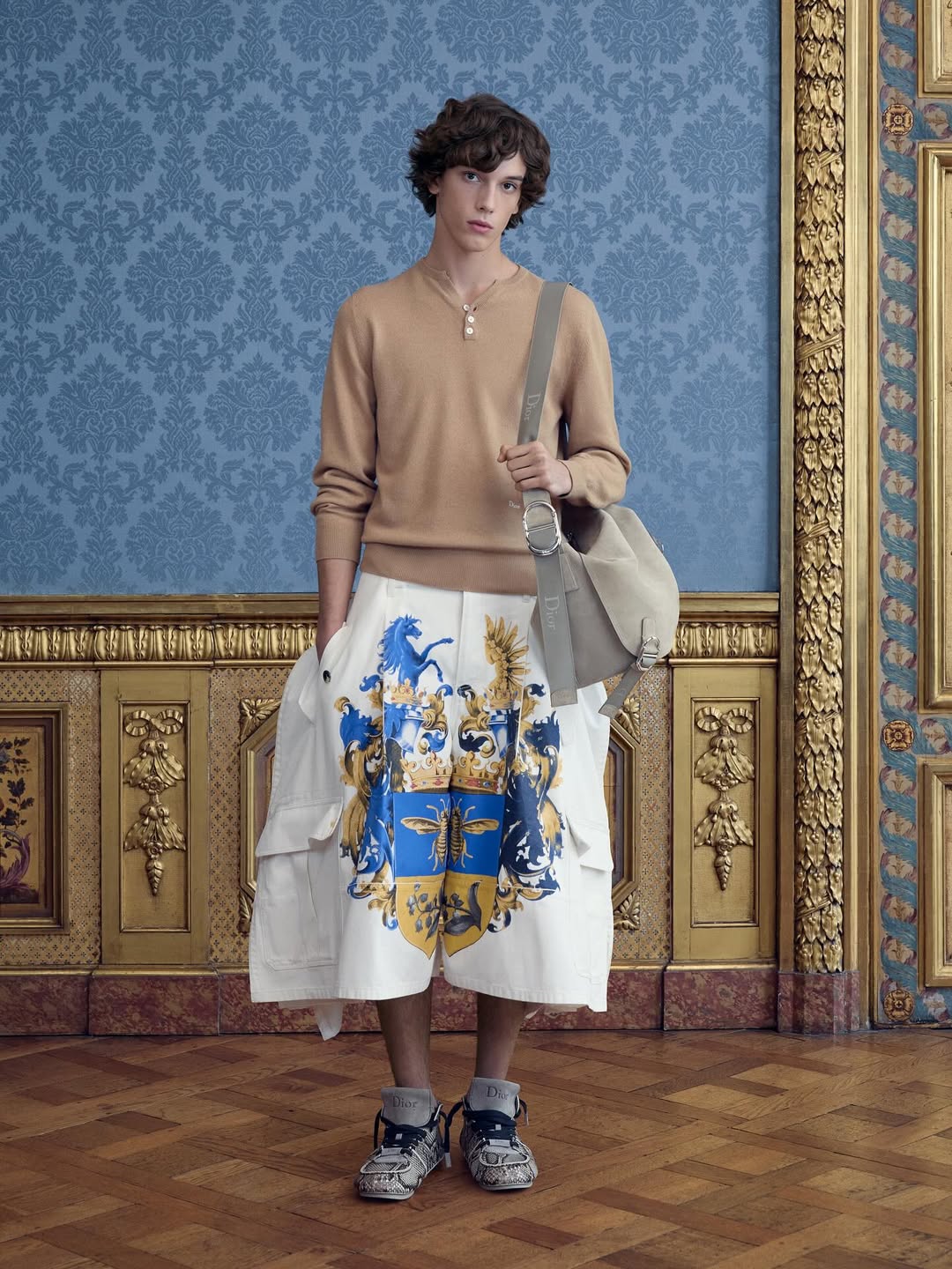 值得关注的是,本季在先锋与经典之间建立了更稳固的平衡。一方面为忠实 DIOR 男装客户提供灰色法兰绒西裤、红色卡其裤、法式衬衫、天鹅绒晚礼服等简洁单品;另一方面也延续其对档案符号的重构,例如源自 1948 年 Dior 高定礼服的 Delft 廓形短裤,或从罗马的卡拉瓦乔展览获得灵感的大型纹章印花。在配饰上,Anderson 保留了其对于「轻松幽默」设计语调的偏爱,推出以顶针、缝纫机零件等制成的兔子与虾造型别针,以及更具识别性的 DIOR 金属徽章腰带扣等。