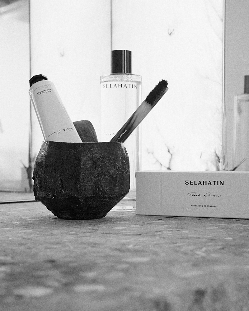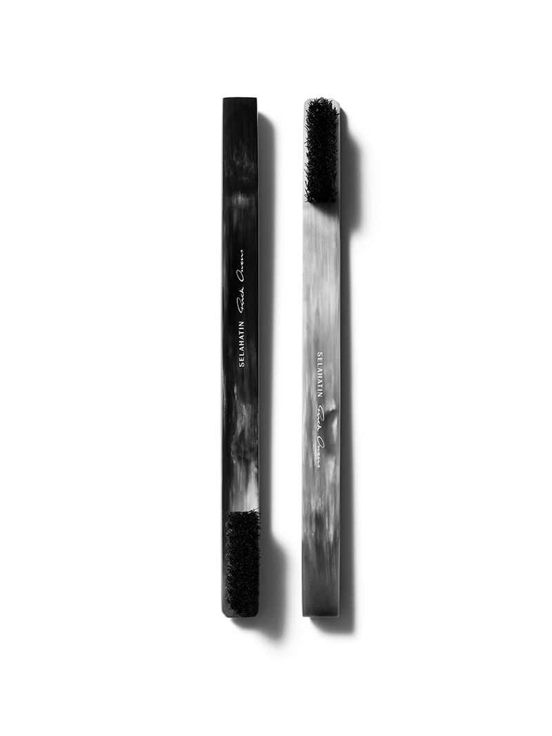 该系列包括四种产品:美白牙膏、漱口水、口腔喷雾剂和手工羊角牙刷。Selahatin 的创始人 Kristoffer Vural 为 Rick Owens 特别创造了一种代表性的香气,香味以马鞭草、马达加斯加香草和花椒为主,杜松、黑柑橘和迷迭香为核心,黑胡椒和薄荷为基底。牛角牙刷柄则由一种天然的可生物降解材料制成,该材料来自对于肉类工业废弃物的循环利用。