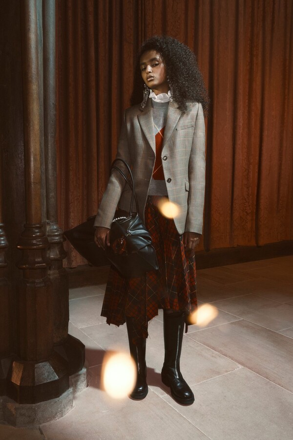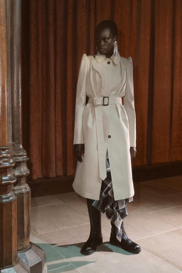 本季以巧妙解构的剪裁开篇。晚礼服外套或缩水、或以扭曲的翻领设计呈现,在经典廓形中营造出动感。腰封式的腰线贯穿于男女皆宜的西装系列,勾勒出利落的线条,同时又不失庄重典雅气质。Alexander McQueen 的标志性元素——格纹则以克制而巧妙的方式呈现:高领迷你裙、灯芯绒领大衣以及垂坠感十足的苏格兰短裙,都诠释了经典与不羁的融合。