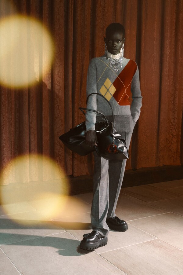 这种精致与叛逆的交织也延伸至针织衫和晚装。菱格纹毛衣搭配低腰裤,将经典元素融入更随性的风格之中。飘逸的雪纺连衣裙重新诠释了品牌过往的罂粟花印花图案,将历史的厚重感转化为轻盈灵动感。配饰则更添戏剧性的华丽感:珠宝的设计灵感源自水晶吊灯碎片;2010 年诞生的 Manta 手袋也焕然一新,以迎合新世代钟爱雕塑感十足、瞩目造型的个性审美。
