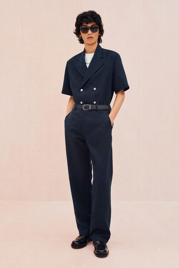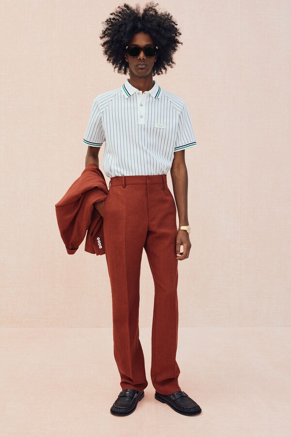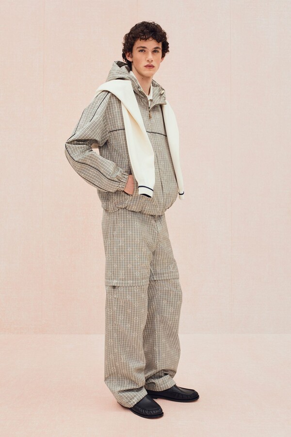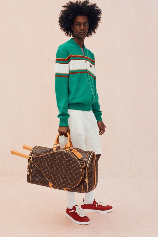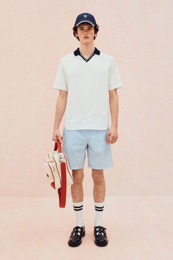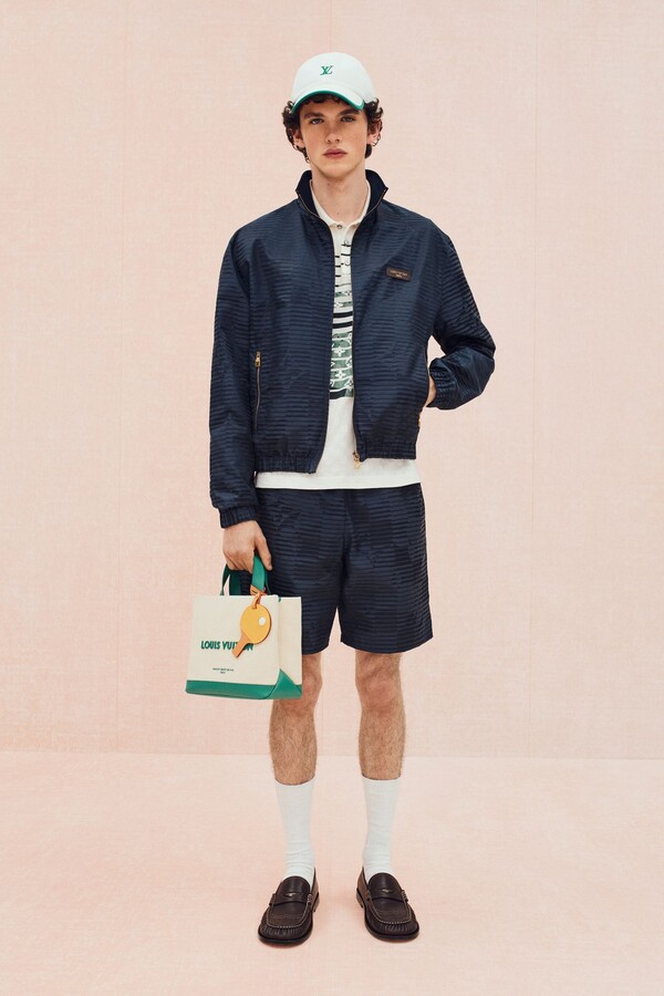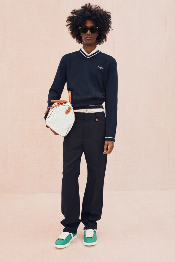 运动主题最直接展现了这一点。滚边拉链衫、柔软针织衫、镂空皮革运动夹克和 Polo 衫,以及以品牌标志性图案重新设计的球拍包等网球元素贯穿始终。常春藤风格的经典单品——卡其裤、乐福鞋、白 T 恤则通过外露品牌腰带和宽松版型等街头造型呈现,别具一格。Pharrell Williams 本人的风格也出现在精妙细节之中:粗花呢夹克上的珠光纽扣、深赭色长裤的随性优雅廓形让人想到美式复古风。