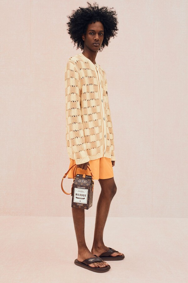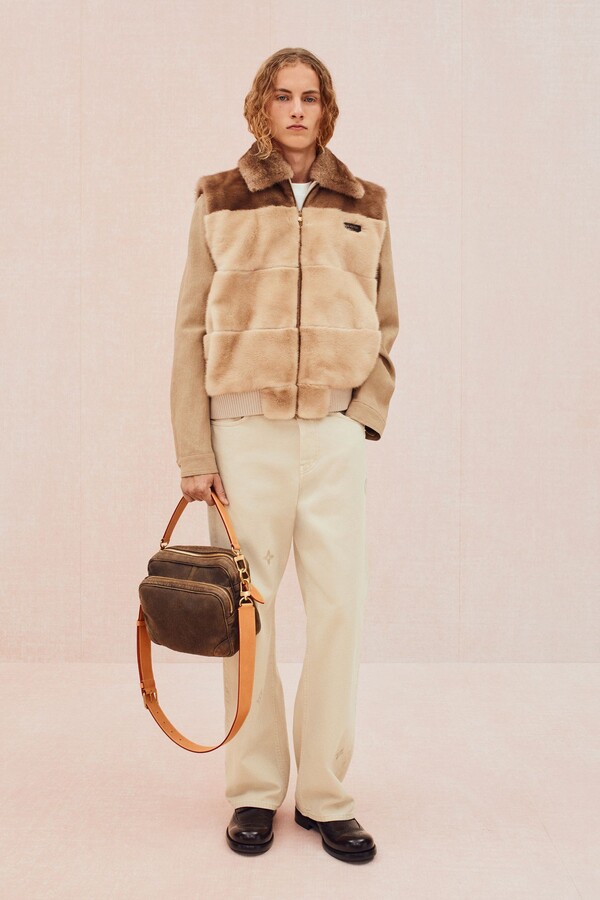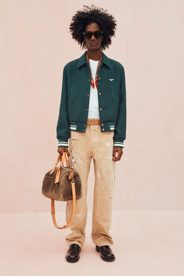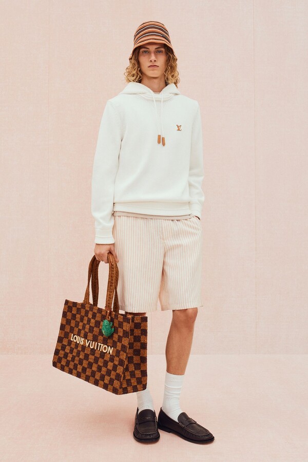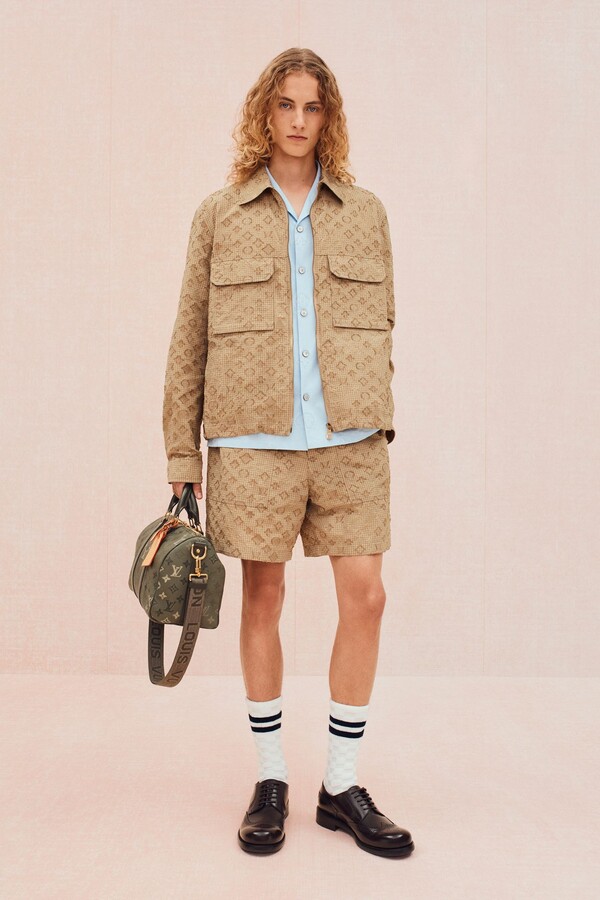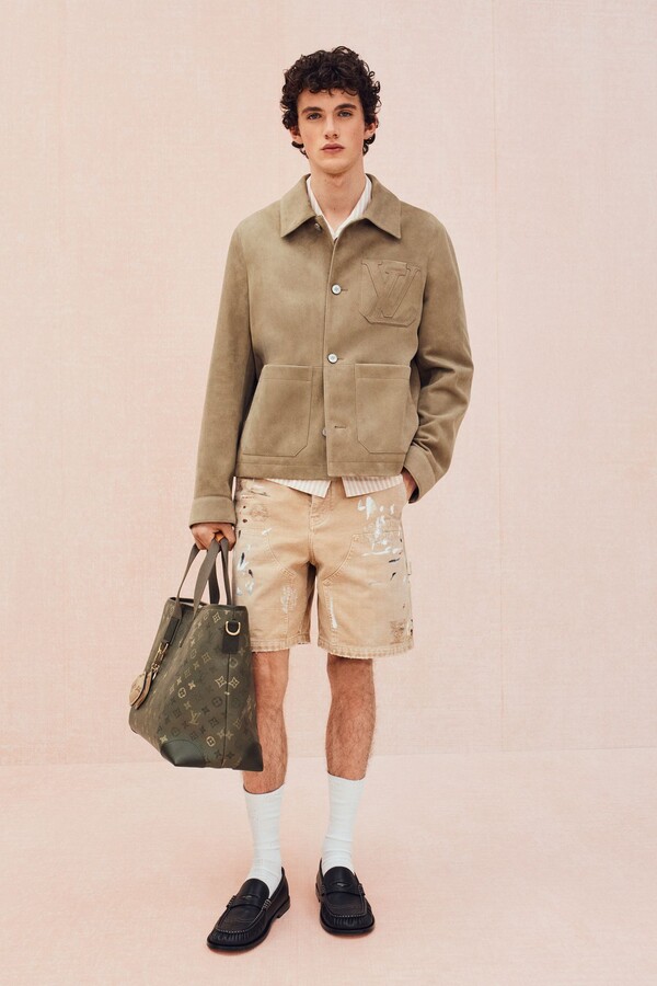工装风格被柔化,在保持实用功能性的同时更添精致感。修身麂皮工装夹克饰以字母组合缝线,搭配双层结构的泼墨帆布短裤。沙漠米色的「剩余」字母组合图案贯穿始终,大量出现在防撕裂面料套装和配饰上。针织衫款式也更加丰富:灵感源自 Damier 棋盘格的钩针衬衫、饰以奶油色绞花滚边的针织夹克,以及藤编材质演绎的 Damier 棋盘格图案点缀于外套和包袋之上,提升了整个系列的精致感。