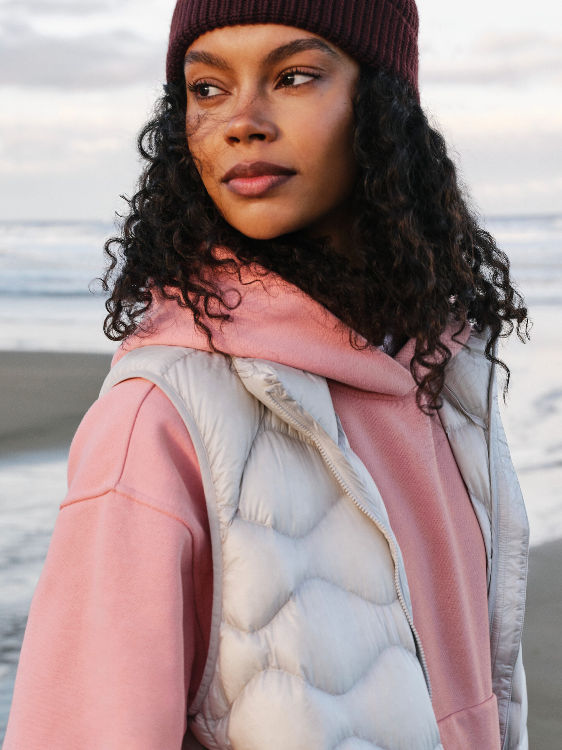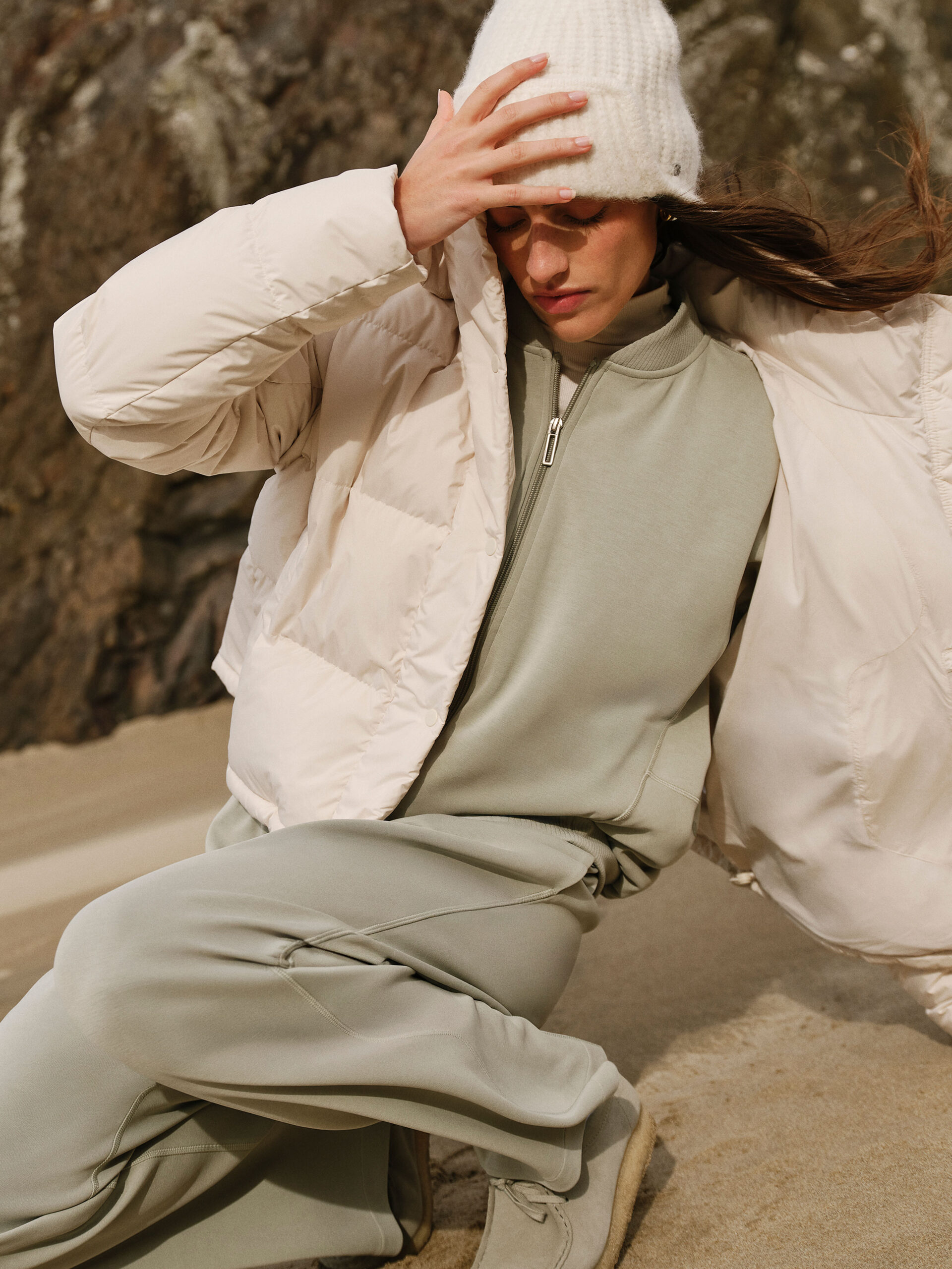 由内而外感受贴心温度,上身 Brushed Softstreme™ 拉绒超宽松剪裁飞行员夹克,内侧微绒亲肤,外侧垂坠顺滑,守护她全天候的暖意。裹入Wunder Puff™ 羽绒外套,SoftMatte 面料拒水防风,搭配 Wool-Blend 羊驼毛混纺护耳针织帽,为御寒加持,让温暖加倍。