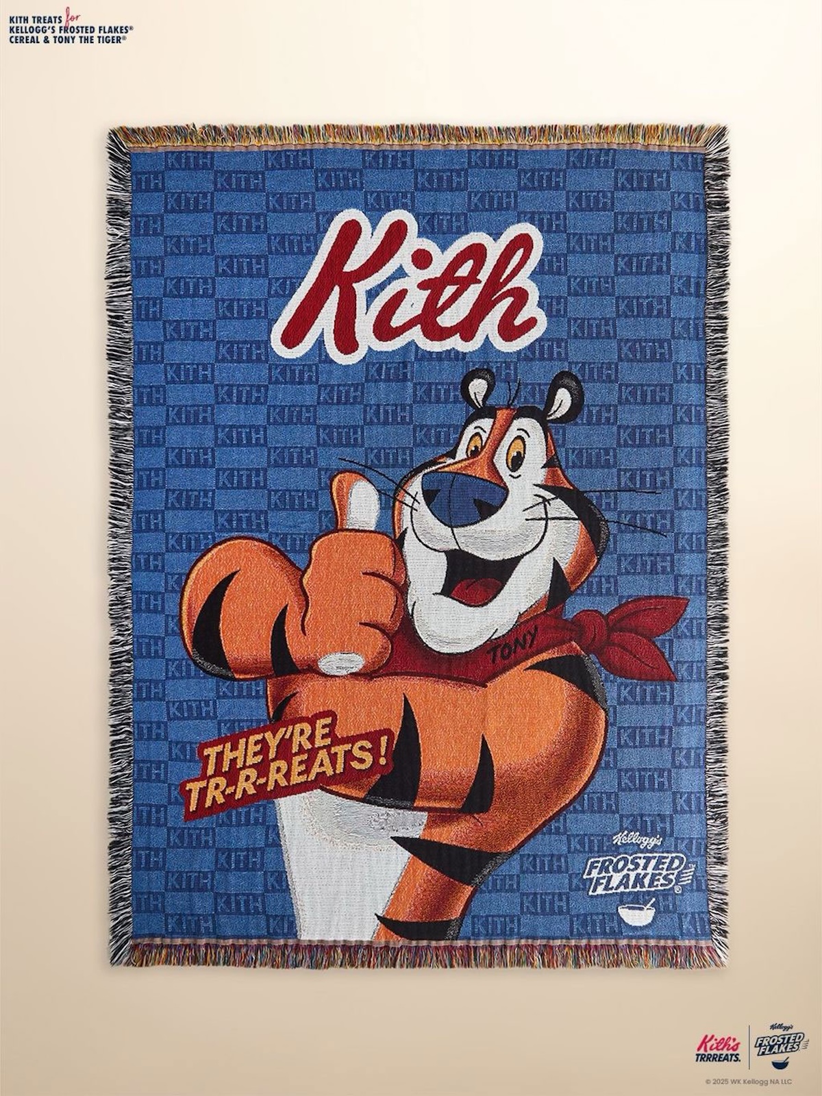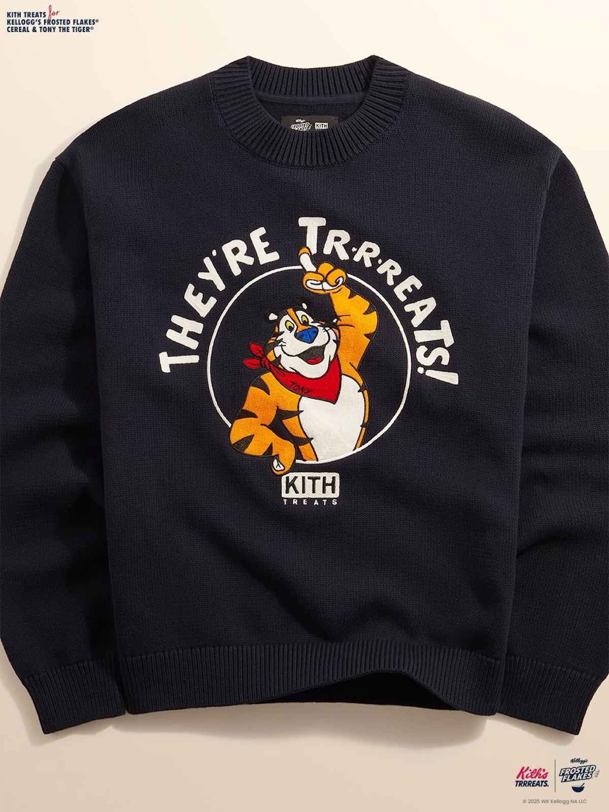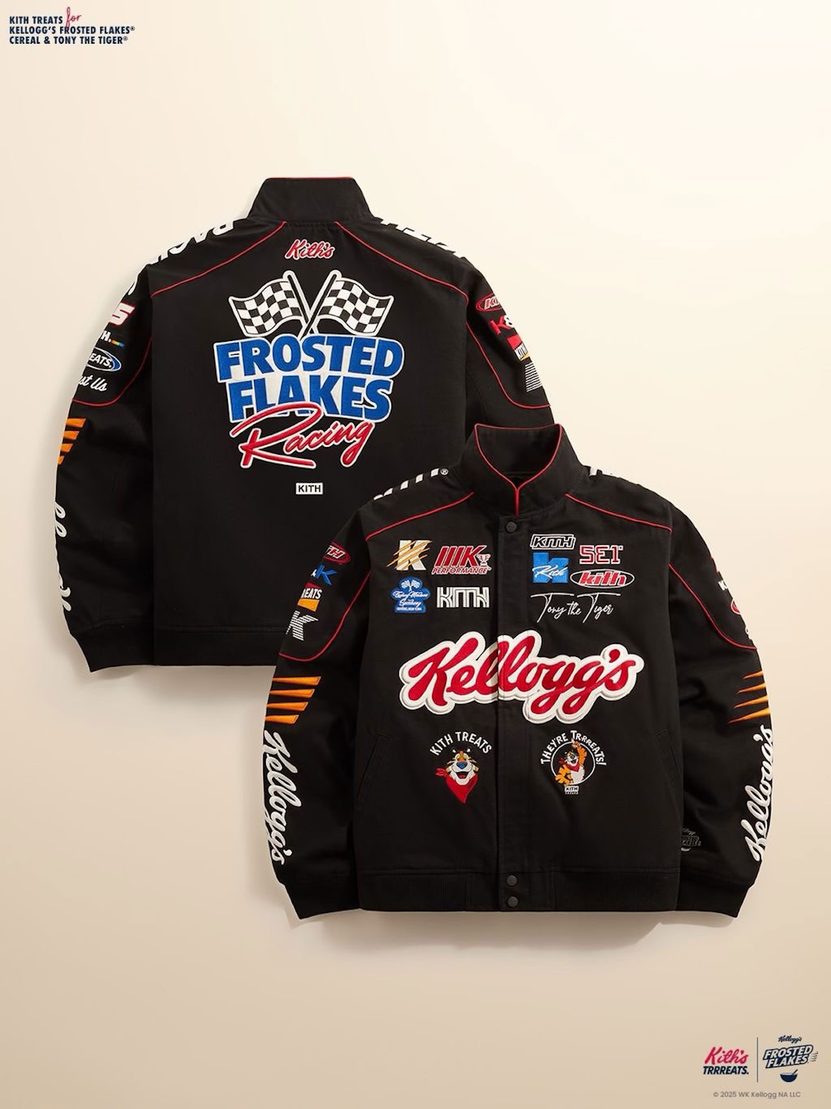 KITH Treats 携手经典麦片品牌 Frosted Flakes,于圣诞季推出充满童年回忆的联名系列。设计灵感源自标志性的麦片包装,将街头风格与复古情怀巧妙融合。系列中可见托尼虎图案以复古素描、刺绣标语及赛车徽章等形式呈现,KITH 标识亦调整为俏皮的麦片盒字体风格。单品涵盖个性十足的赛车夹克、厚重抓绒衫以及日常实穿的刺绣圆领衫,并包含延伸主题的家居配饰。该系列将于 12 月 12 日上午 11 点(美国东部时间)在 KITH 门店及线上同步发售。