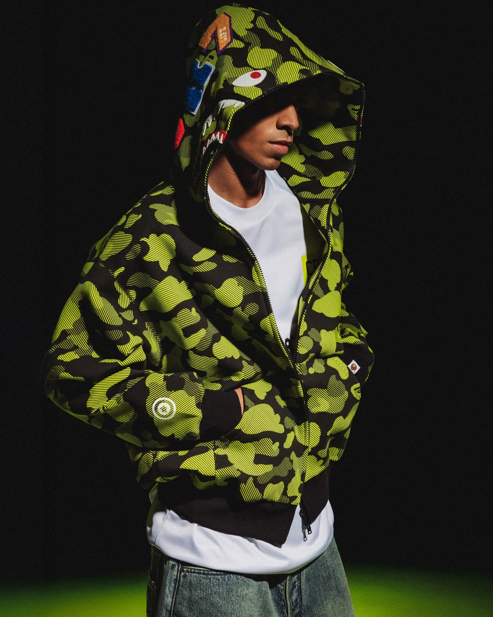 本次系列的焦点单品为 REFLECTION CAMO Shark 全拉链连帽衫,采用极具辨识度的绿色调演绎,灵感源自 CR7® LIFE 的品牌识别体系,在 BAPE® 标志性的迷彩图案与鲨鱼元素加持下,释放强烈的街头张力与运动气息。
