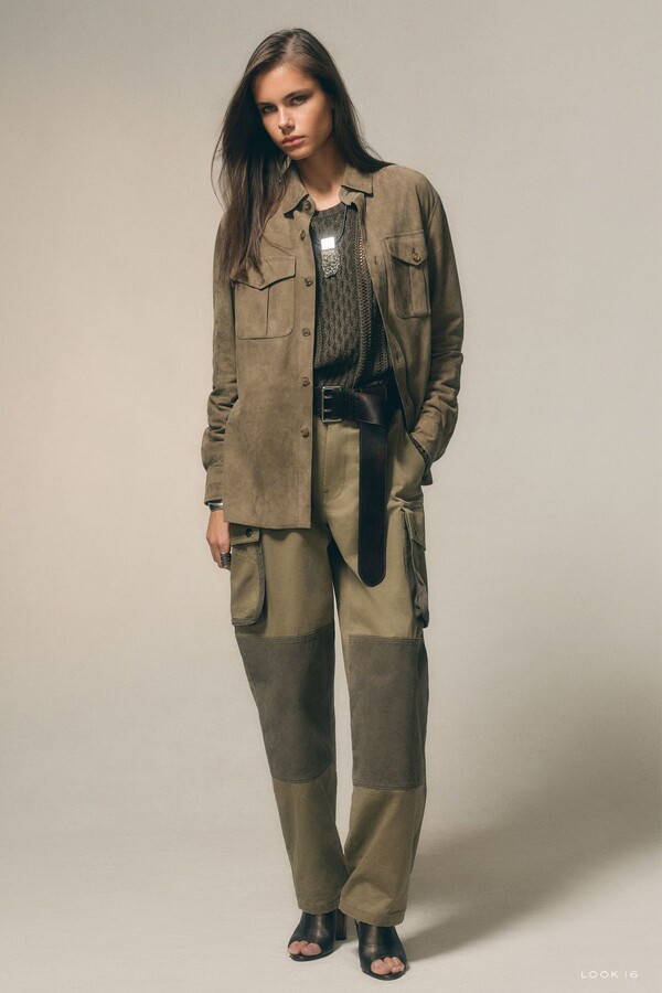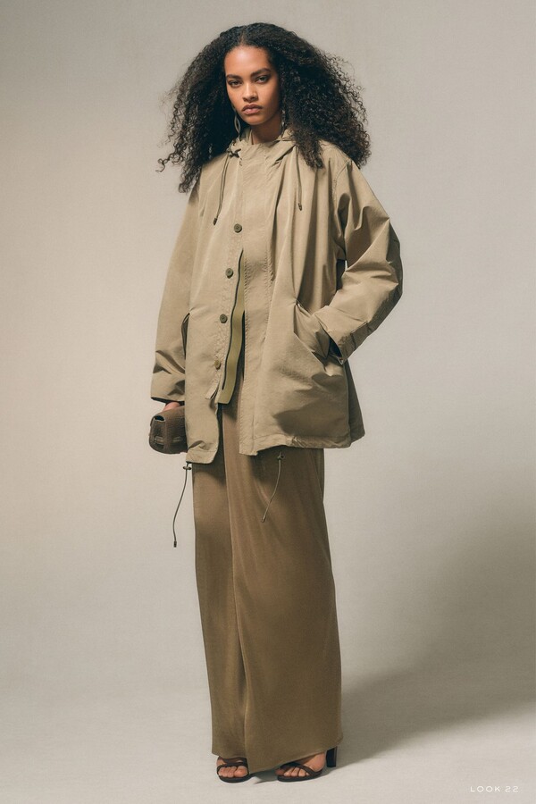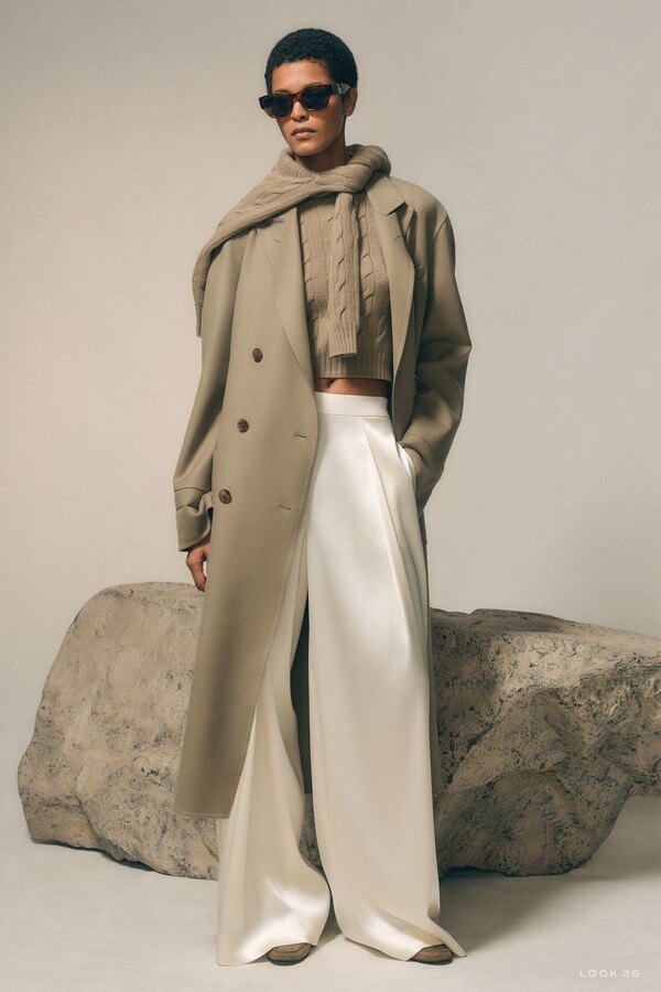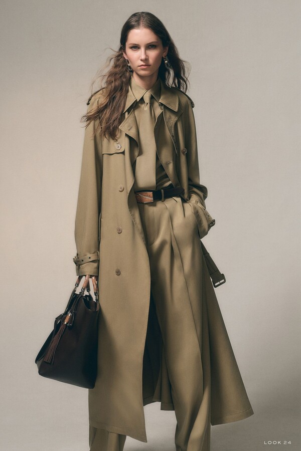 整体色调保持了大地色系,却不显厚重。丝绸经砂洗处理,呈现出类似麂皮的柔软质感。尽管注重工艺,本季保留了品牌一贯的实用性。以 Ralph Lauren 本人为原型设计的双排扣粗花呢外套搭配着裤脚收紧、以粗犷腰带束紧的棉质长裤,格外引人注目。外套延续了这种风格,并融入技术创新:羊毛织物的宽松插肩袖大衣以及超细丝绸拉链夹克引入了轻质薄膜内衬,防水性与优雅兼备。