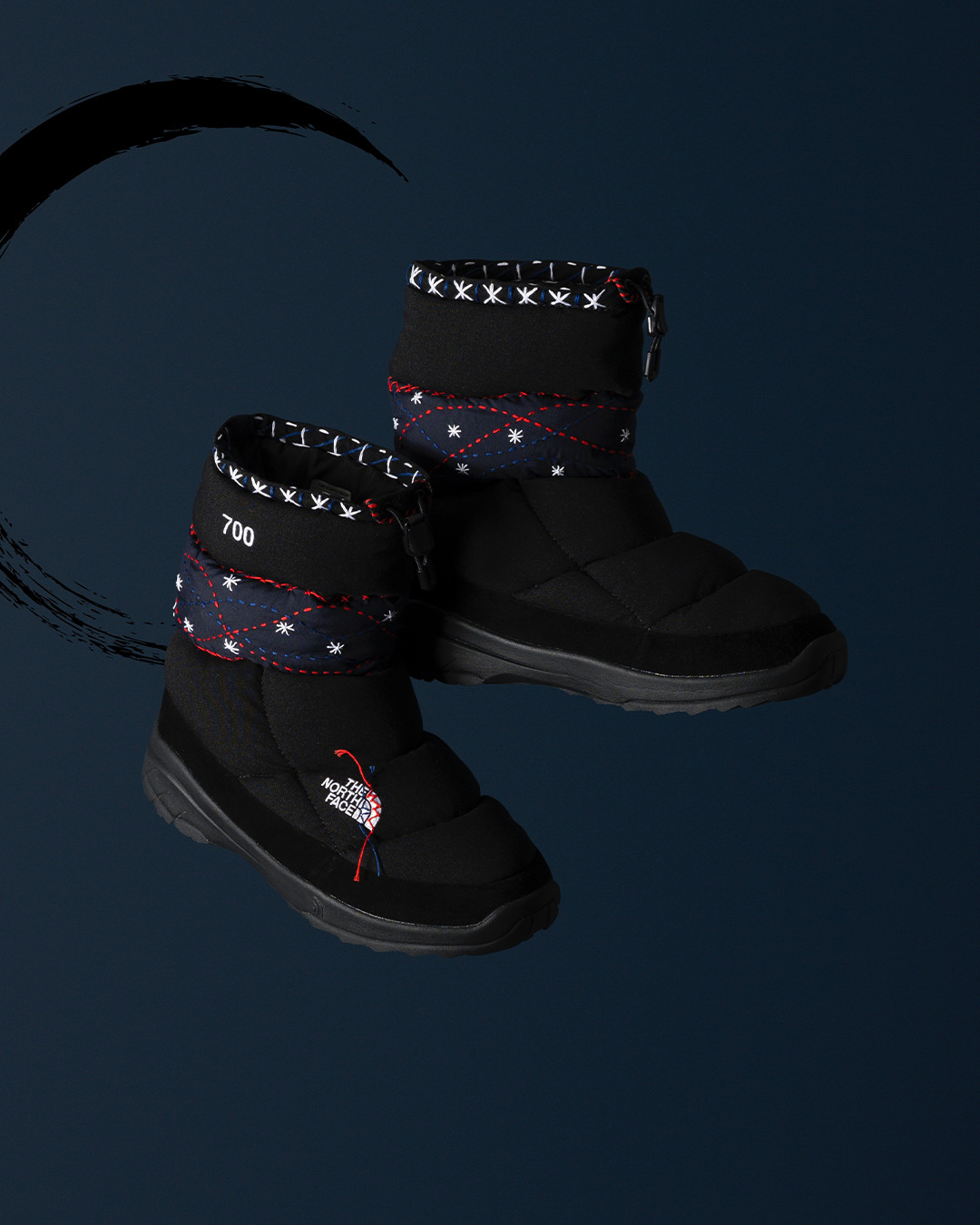 The North Face Japan 与刺子绣工匠团体 Sashiko Gals 合作,将户外装备的实用功能转化为收藏级别的「可穿戴艺术品」。该系列的标志性单品当属 Nuptse Hanten Sashiko 夹克,与日本传统冬衣 Hanten 相结合,采用宽松的无拉链结构,同时保留了 Nuptse 系列卓越的保暖性能,采用了 Brewed Protein™——一种由生物技术先驱 Spiber 公司研发的实验室培育的无石油纤维。