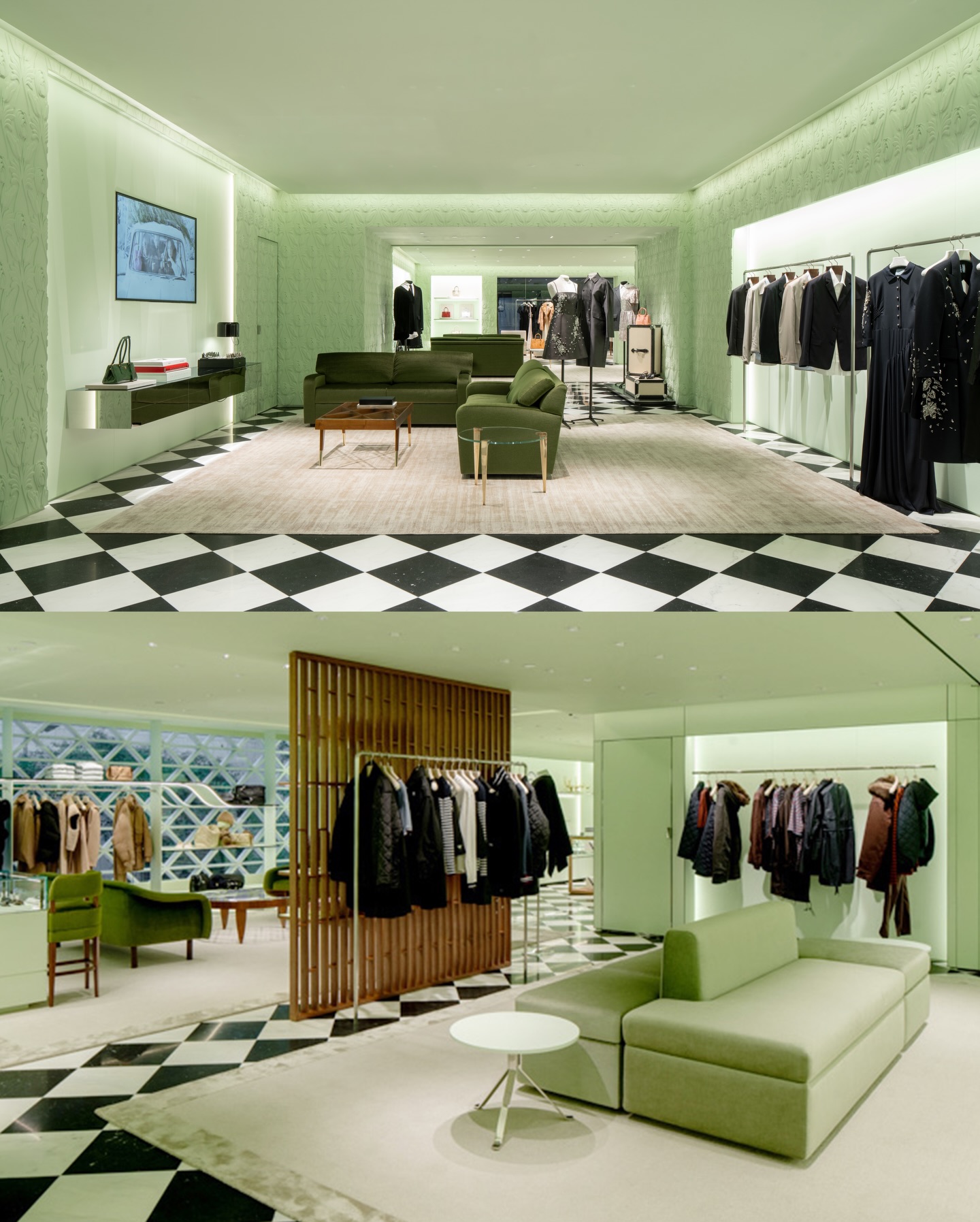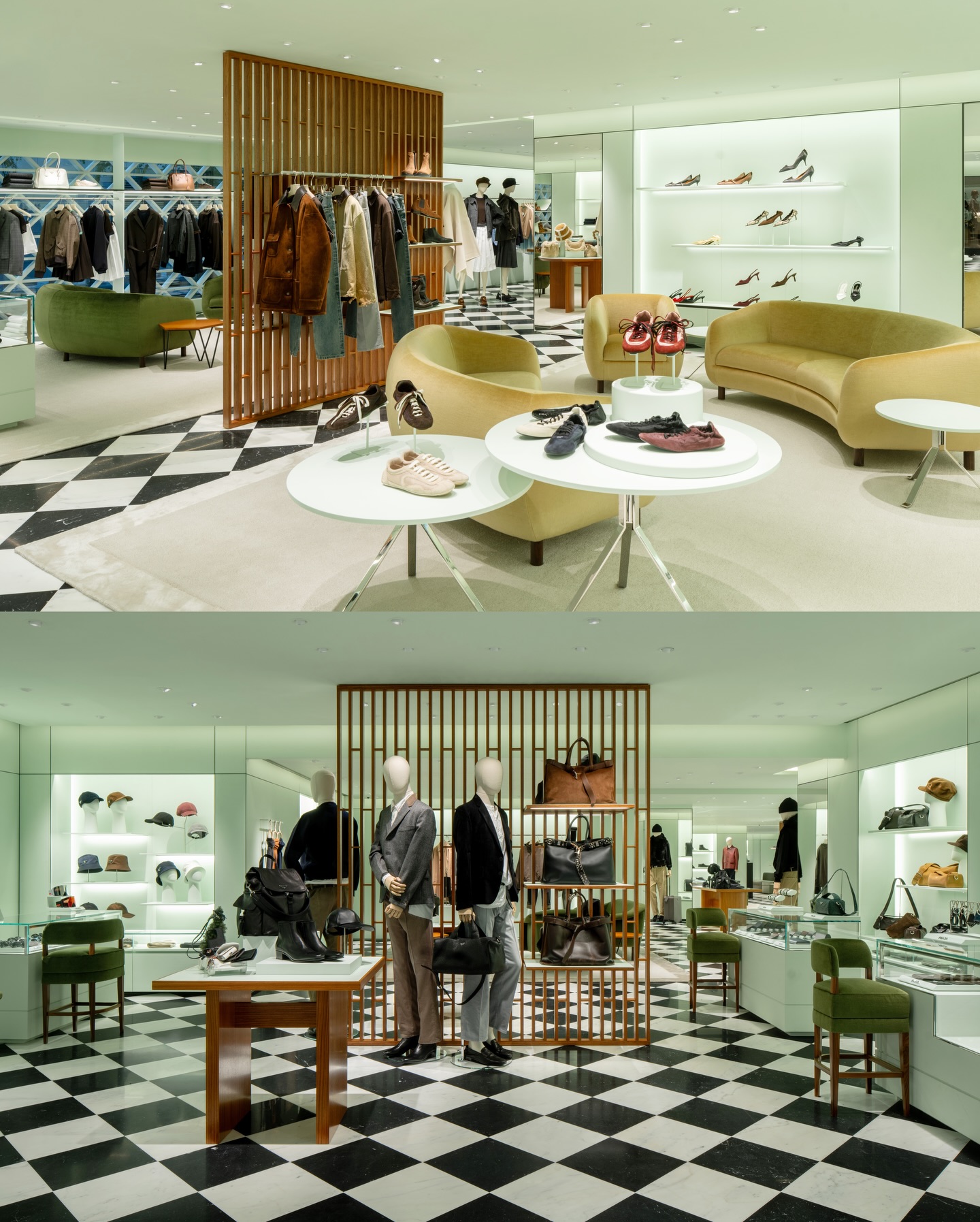 1950 年代意大利家具语汇成为主调,屏风、帆布玻璃陈列柜、黄檀木陈列台与丝绒座椅巧妙点缀其间,空间感既温润又分明。整体划分明确:地面层以贵宾室为主,墙身饰以立体花卉图腾,展示 PRADA Fine Jewelry Eternal Gold 高级珠宝系列,并提供专属的客制服务;一楼为女装成衣专区,展示当季系列;二楼则规划为男装专区,并设有女装精选臻品区域,呼应品牌对混合空间运用的灵活策略。
