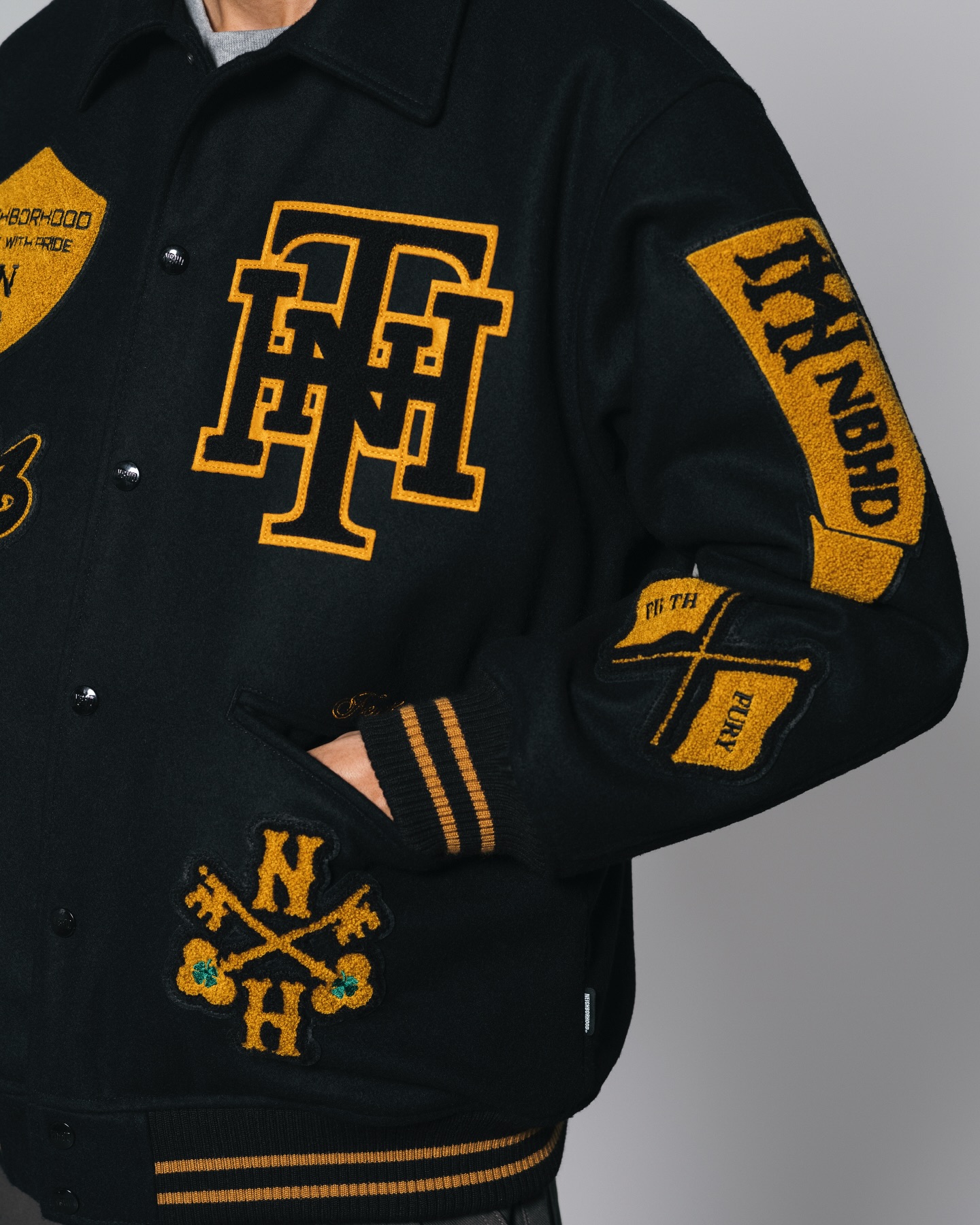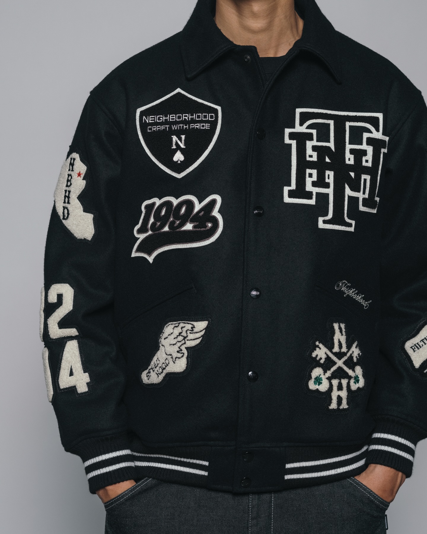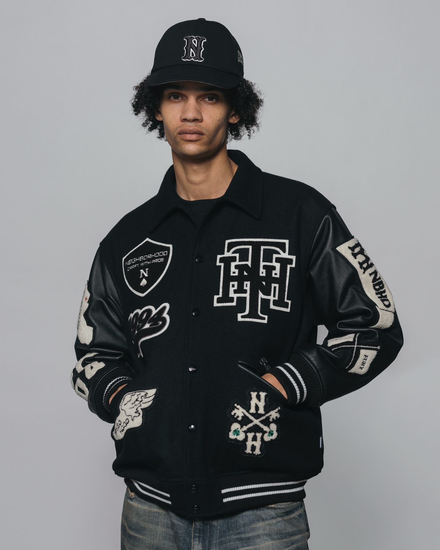 系列核心单品为一款大量运用刺绣与布章元素的棒球夹克。通过密集而富有层次的徽章配置,将品牌标识、文化符号与复古学院气息融为一体,在视觉上展现出强烈存在感,同时也呼应了 NEIGHBORHOOD 对工装与街头文化的持续探索。