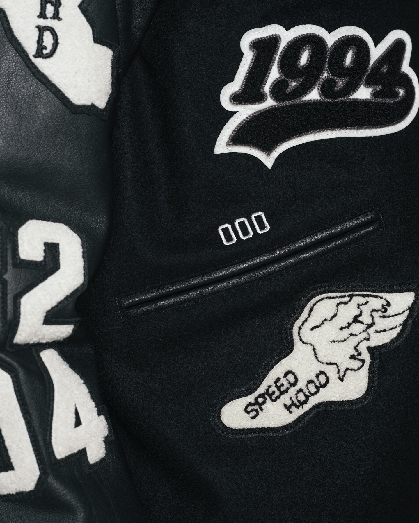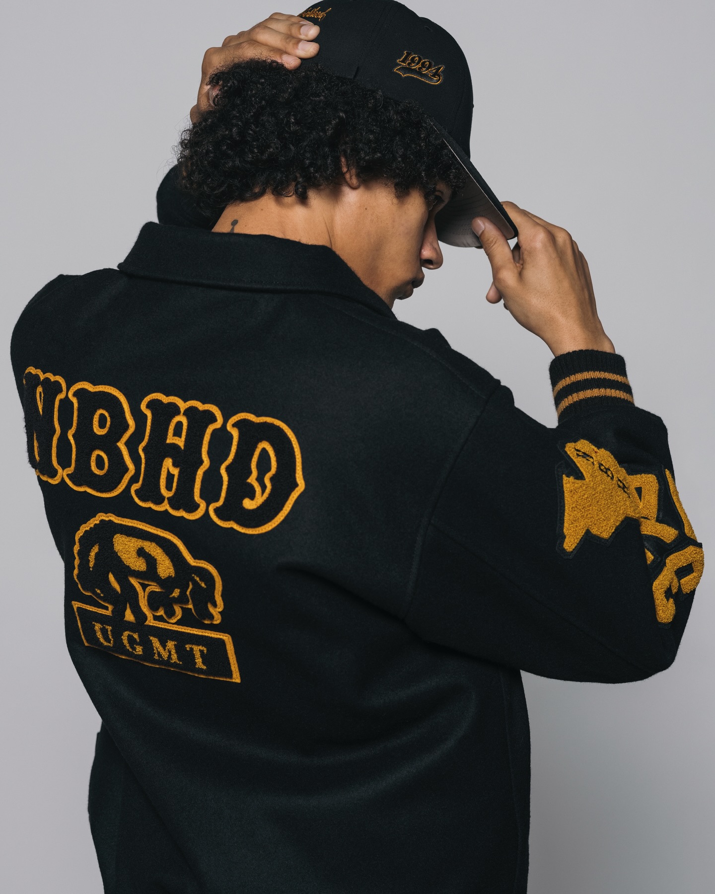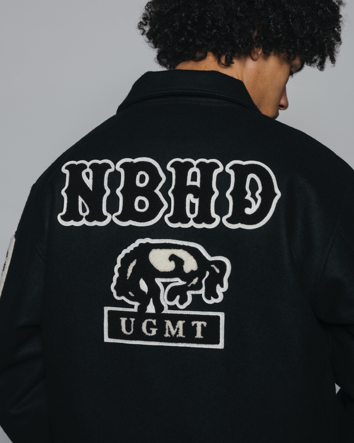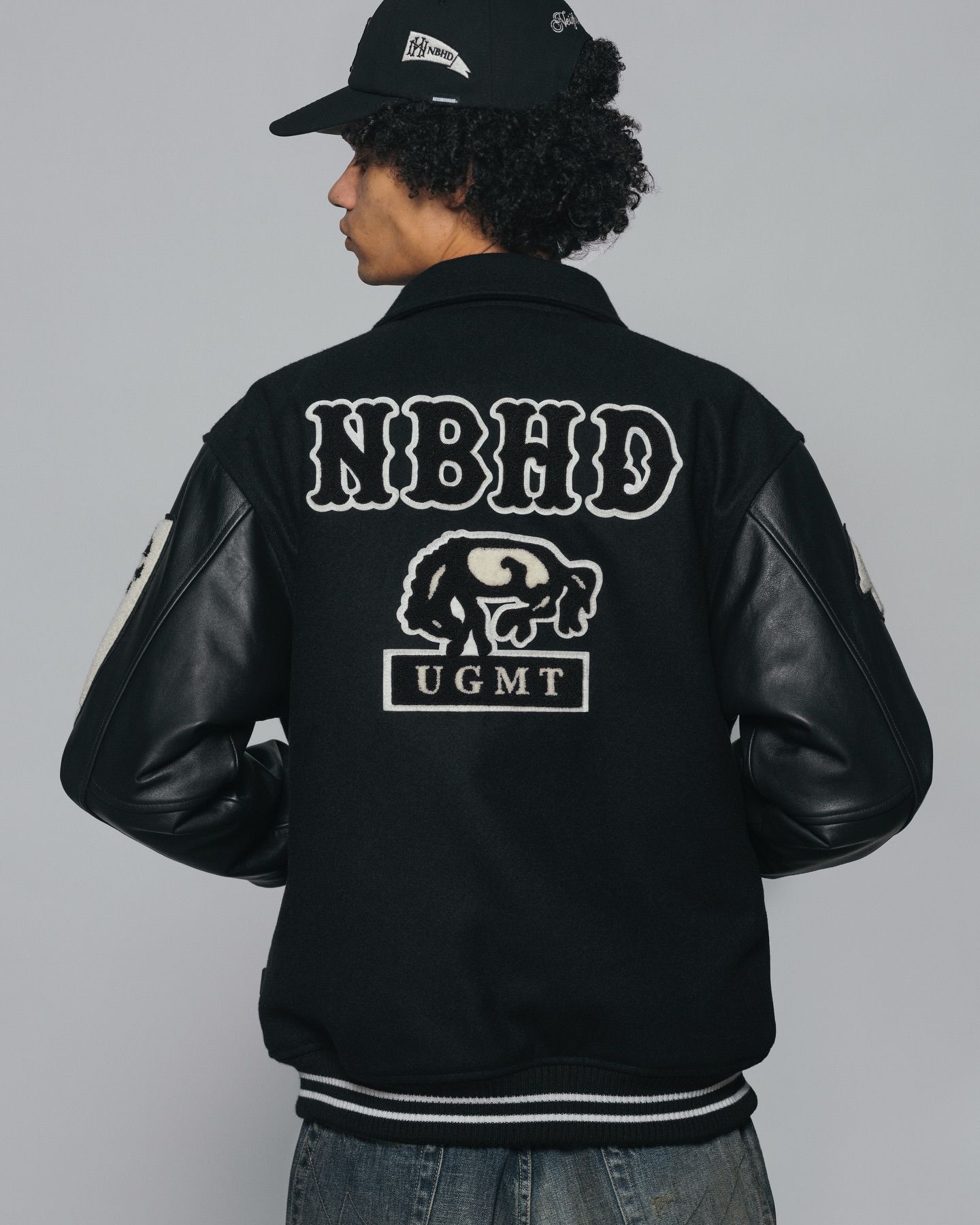 系列核心单品为一款大量运用刺绣与布章元素的棒球夹克。通过密集而富有层次的徽章配置,将品牌标识、文化符号与复古学院气息融为一体,在视觉上展现出强烈存在感,同时也呼应了 NEIGHBORHOOD 对工装与街头文化的持续探索。