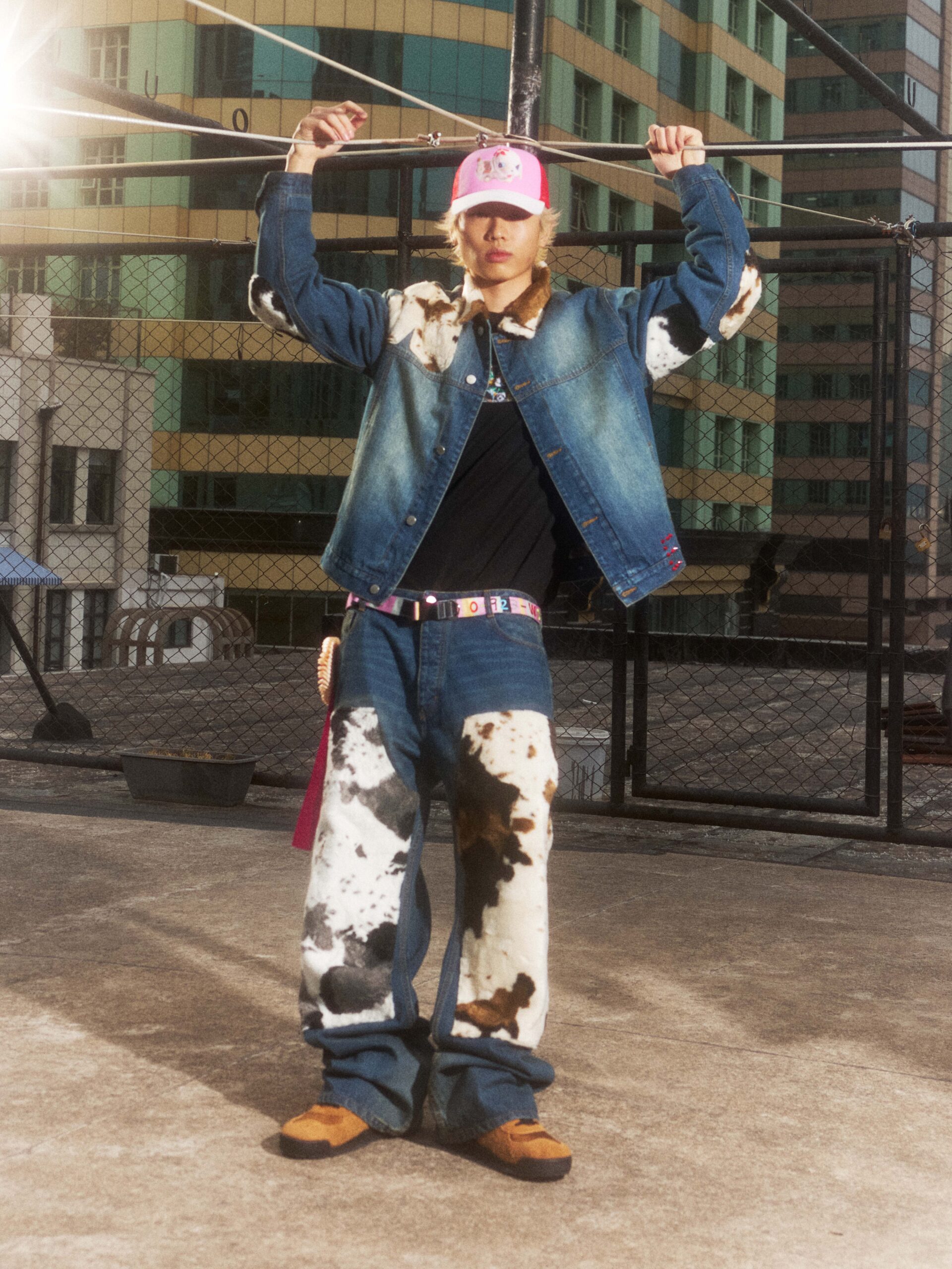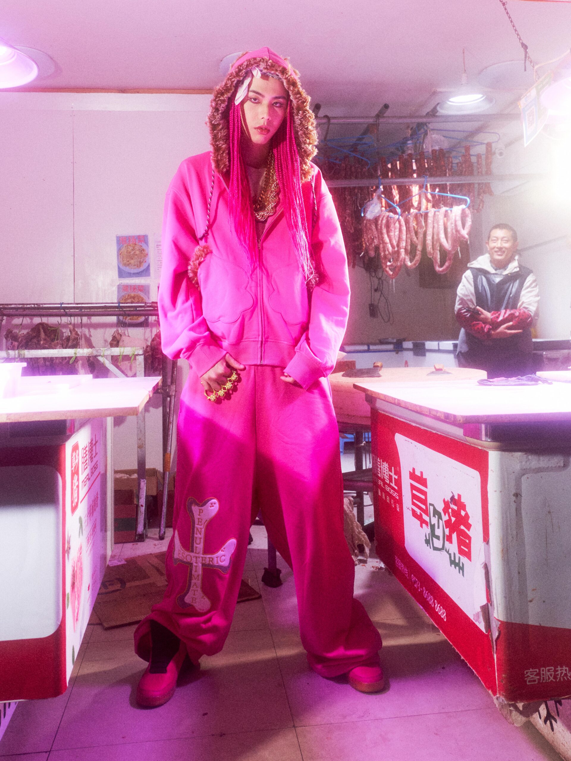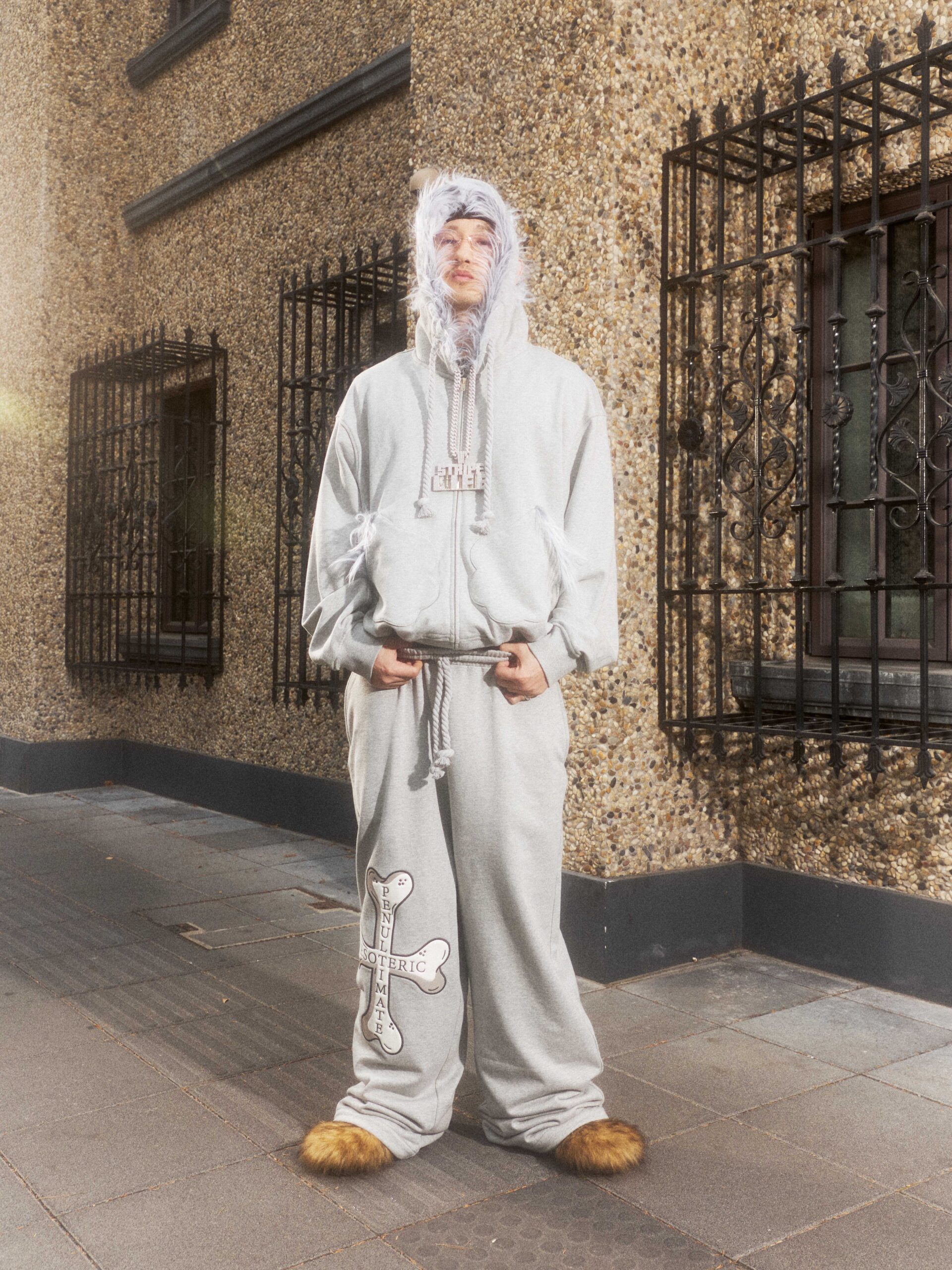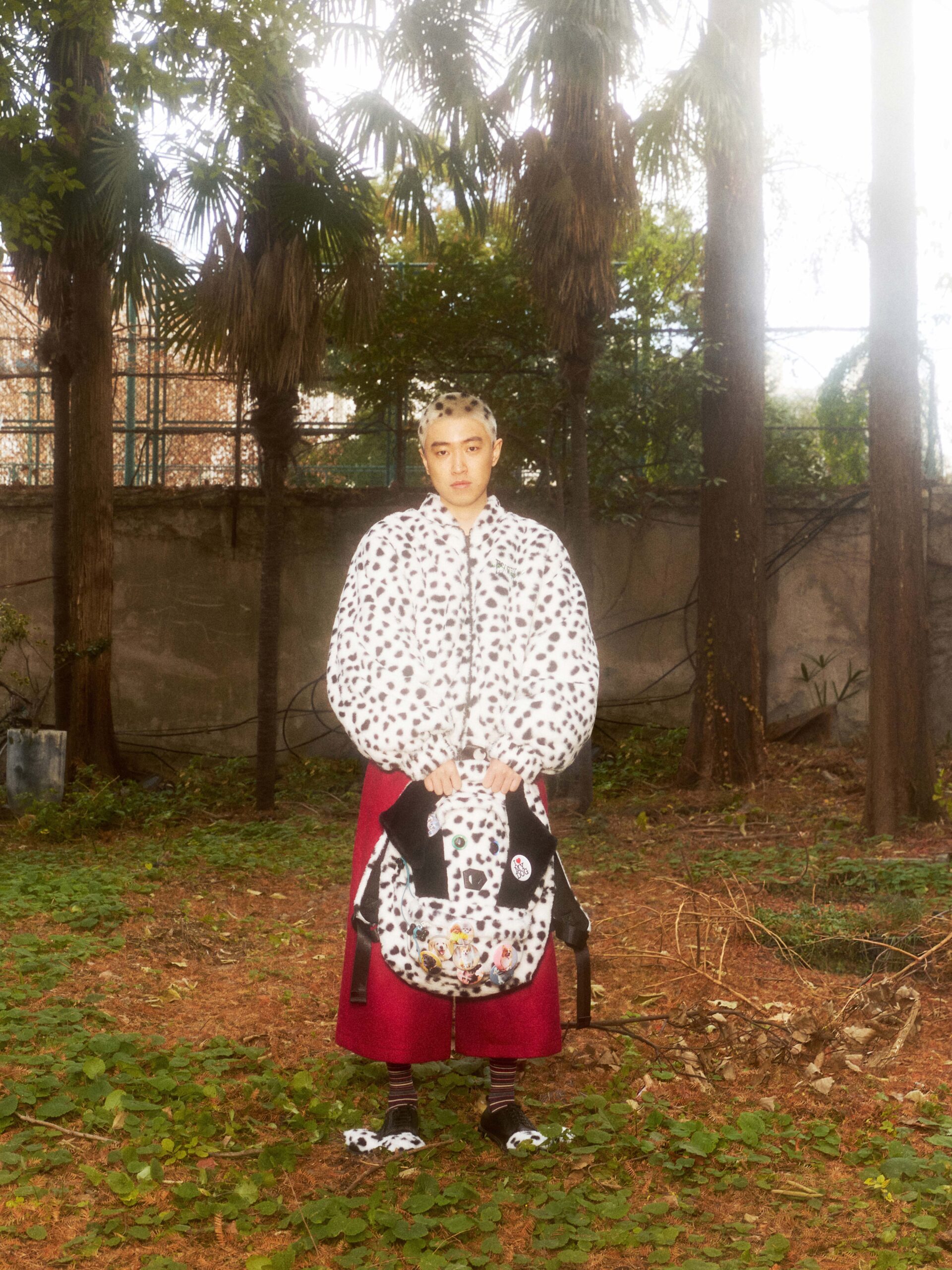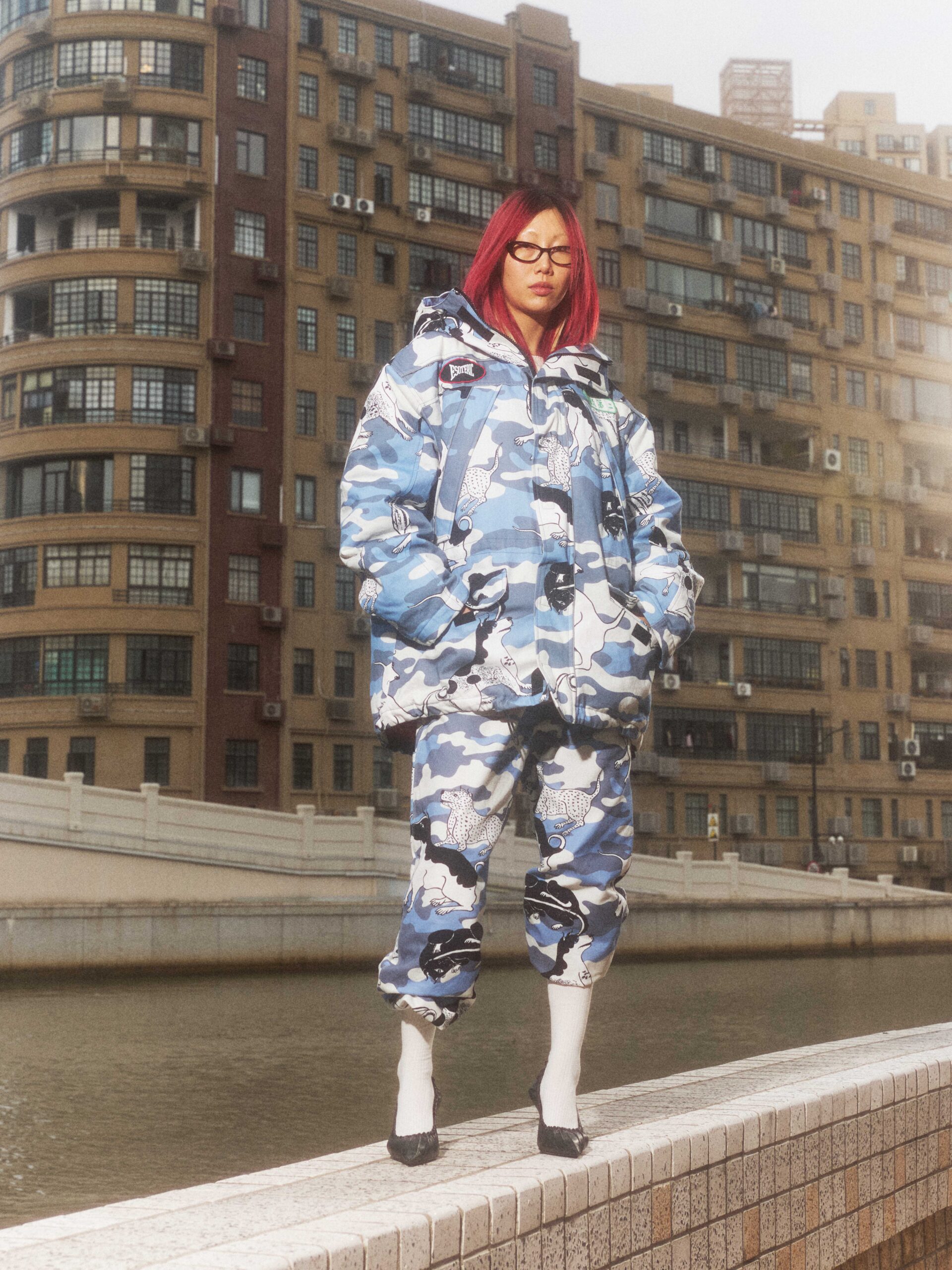 本次合作中,高翔以 ESOTERIC THING 的街头视觉语言将本土文化中「狗」的多重象征进行解构与再叙事:忠诚、警觉、野性、陪伴、灵性与边缘视角,被重新编码为青年个体的精神隐喻。系列单品涵盖迷彩工作套装(灵感源自古籍《相犬经》中的流浪犬意象)、双方 Logo 叠加的限定 Box & Logo Tee、以「陨石边牧」为灵感的双膝破洞牛仔夹克与双膝牛仔裤,以及犬形背包、记忆碎片项链、犬帽围等。