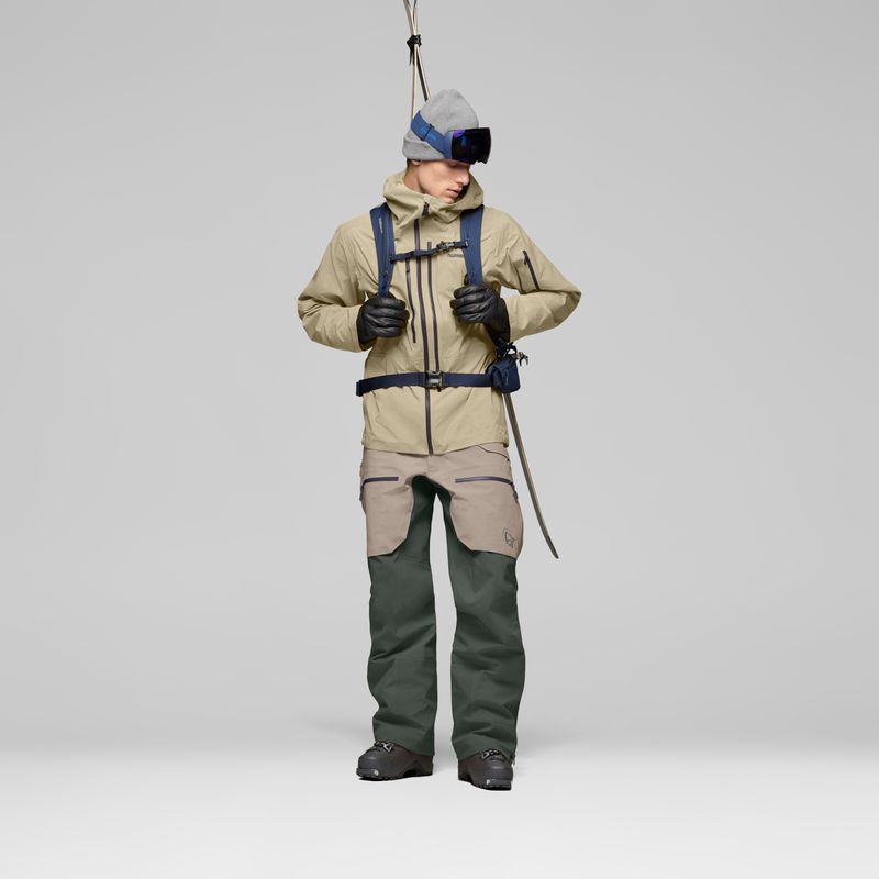 以 lofoten Gore-tex Pro Jacket 为例,这款夹克的诞生历经 6 个版本的迭代与 3 年的反复测试,其面料选用 70d x 160d GTX PRO 材质,实现了强韧防护、柔软度与轻量化的极致平衡,适配头盔的防护风暴帽,搭配单手调节系统,袖口内衬的拇指环,以及可用魔术贴调节的不对称袖口设计,配合层压弹性编织手部护套,全方位阻断风雪侵入;而胸前的拿破仑口袋配备快速取物功能;双向腋下拉链通风系统搭配前胸透气防雪网,让散热更加高效;胸袋内置的雪景擦拭布、以及网眼手套、无线电对讲机等功能性收纳。