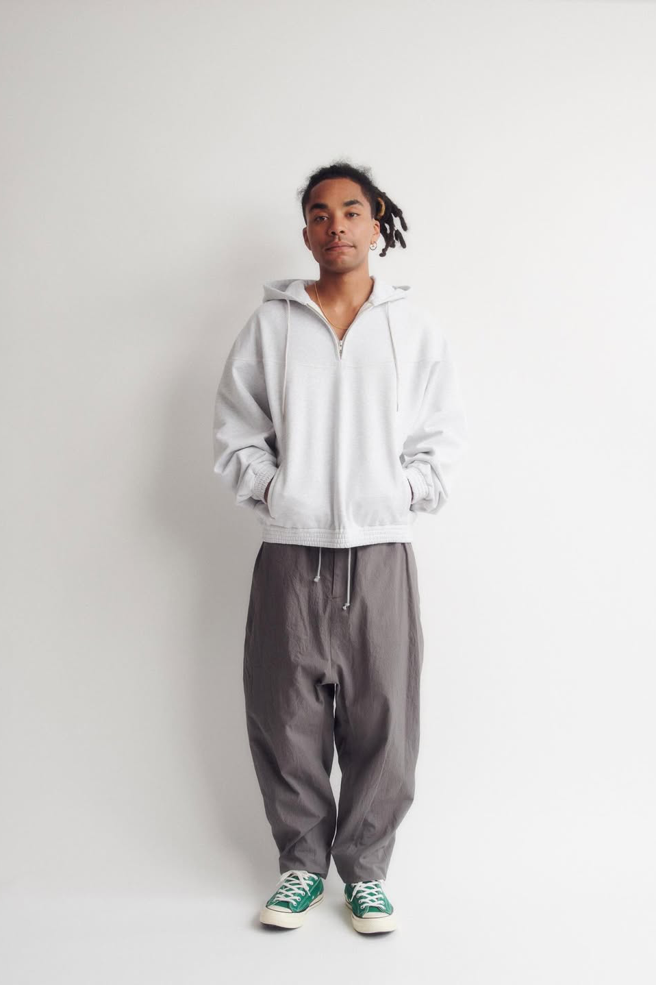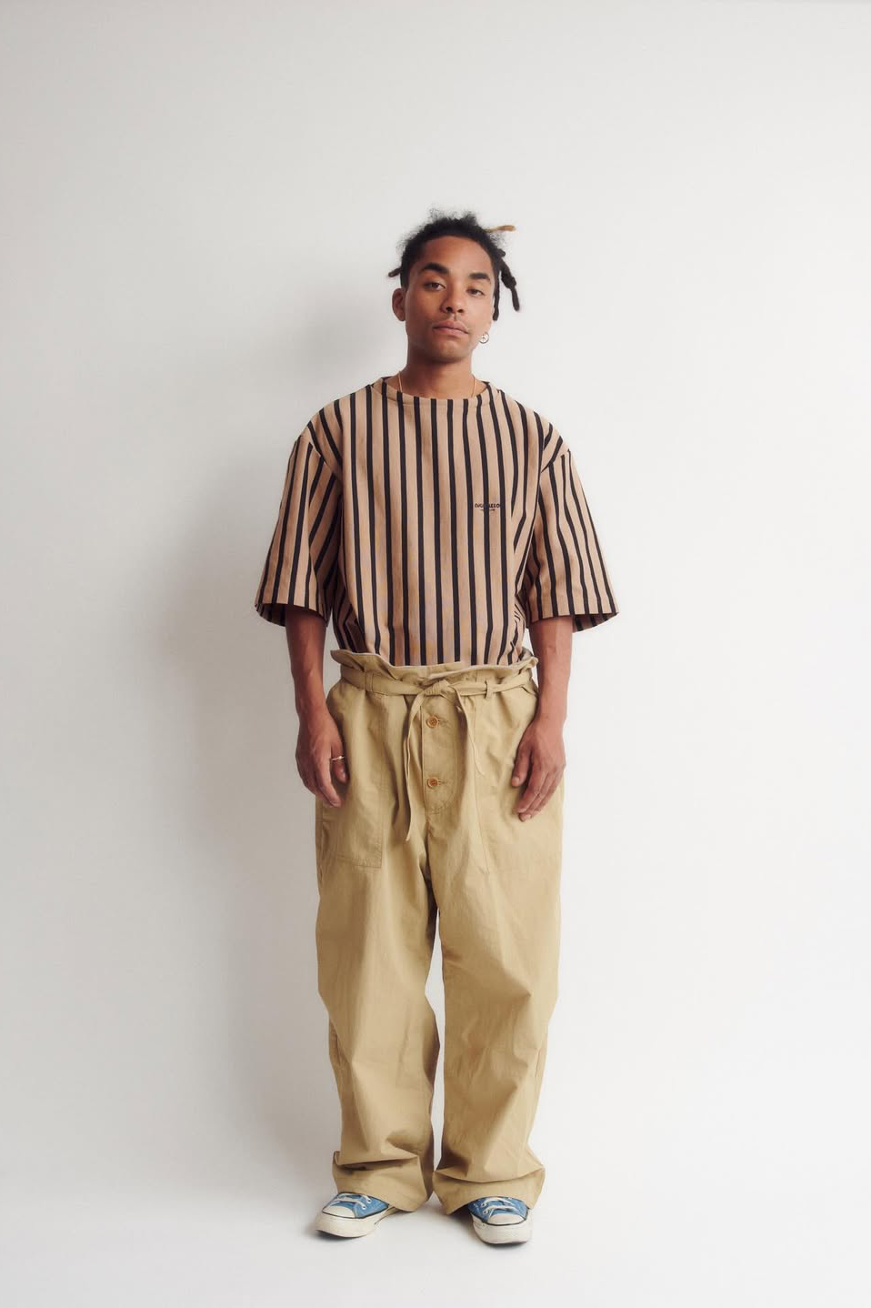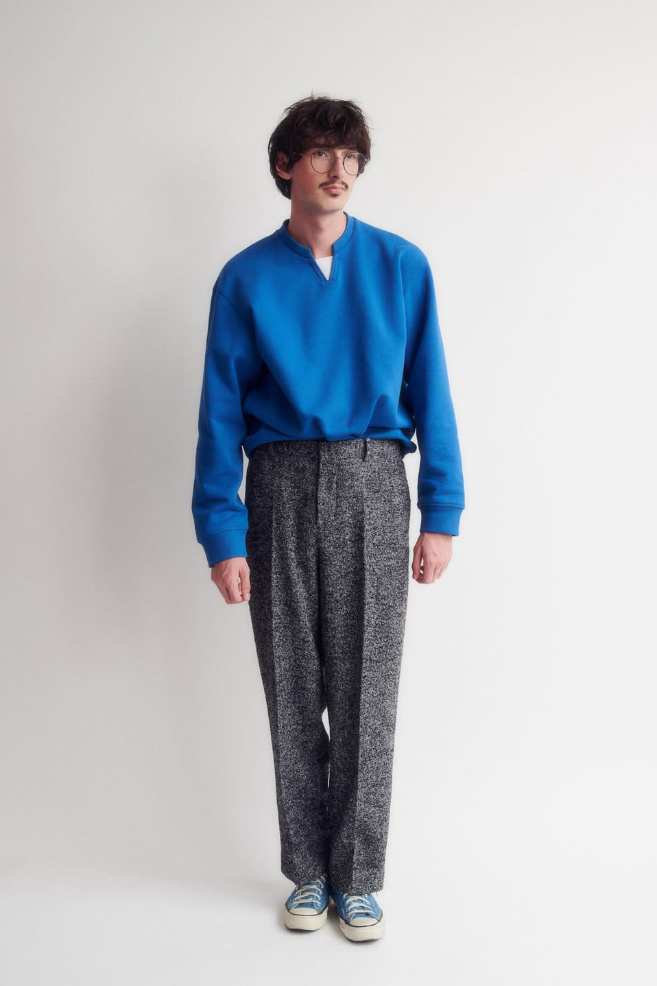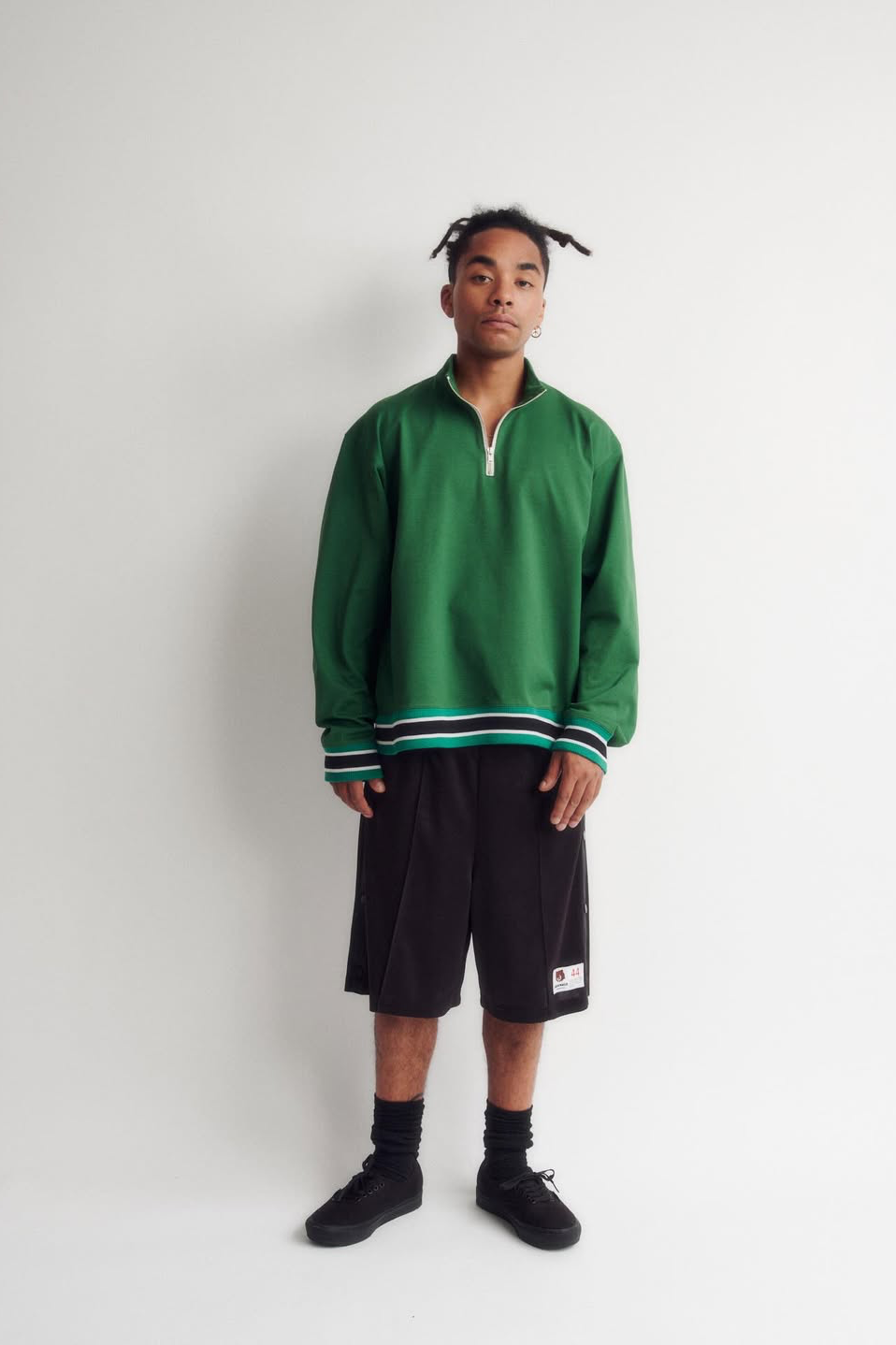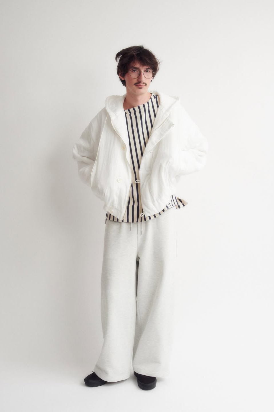 新系列的灵感源自 20 世纪 80 年代传入意大利的美国复古服装。美式学院风或运动装到了意大利后,衬衫或反织卫衣会被赋予夸张且略显多余的造型元素。一件普通的牛津布衬衫会被改造成一件极尽休闲的衬衫,与原本的风格大相径庭。这种精神贯穿了整个系列,但又略作调整以契合 DIGAWEL 的审美:半拉链卫衣的袖口和下摆饰以条纹;敞领衬衫采用了方正版型;篮球短裤的长度及膝,剪裁更加休闲、适合日常穿着;运动裤的裤型也比通常款更宽松。