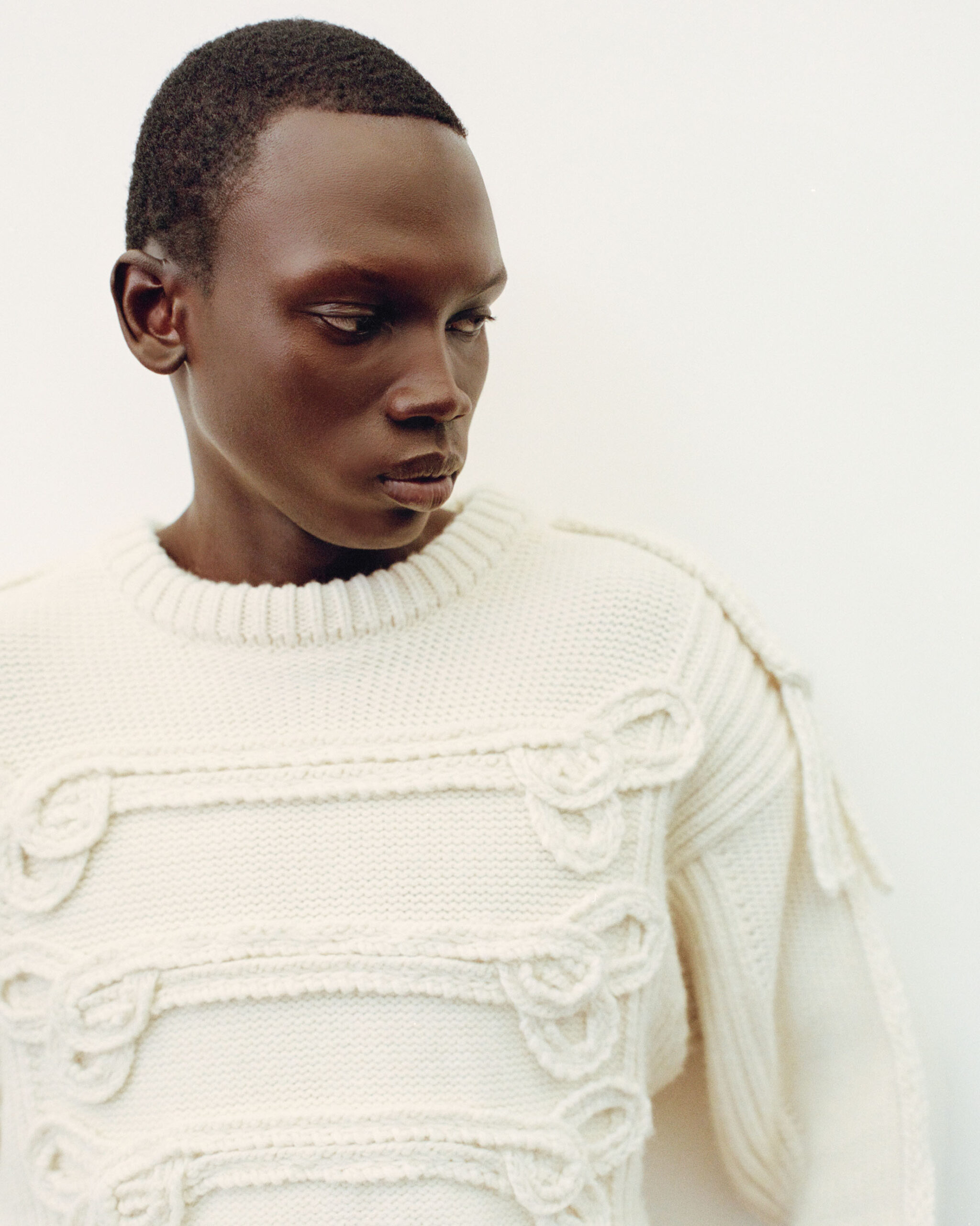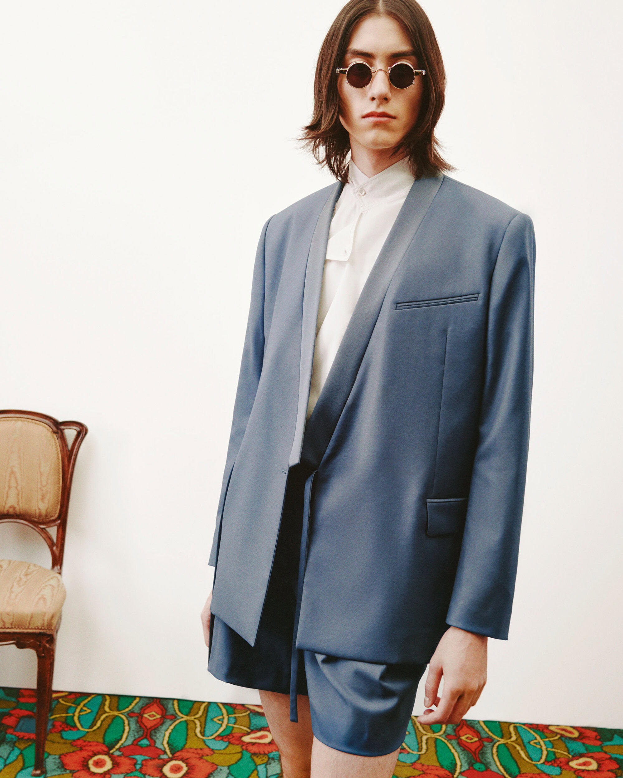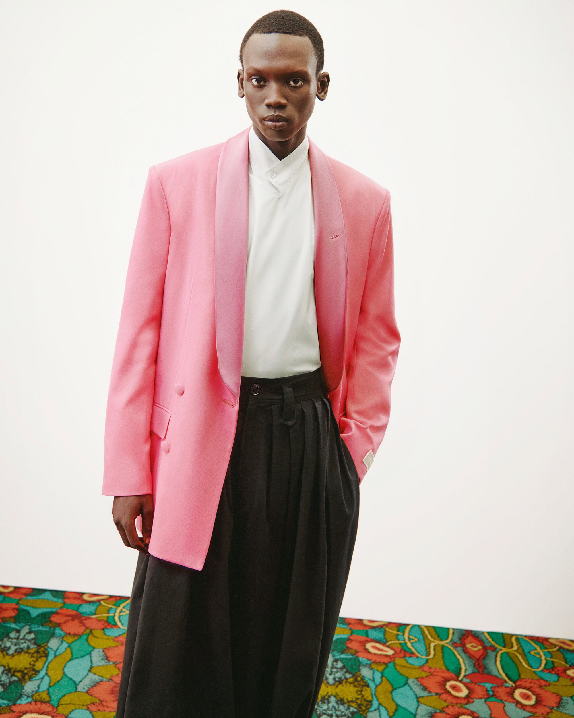Brun 的影像风格偏向清晰且具构图感,将模特的动作简化为蓄意而简单的姿态,在白色背景墙的映衬下突显了剪裁的厚重感。镜面、装饰与历史等奢华元素退居边缘,而服饰以自信且克制的姿态占据前景。在这种设定下,NIGO® 对高田贤三和服式剪裁的重新诠释显得既是致敬也是进化,尤其是横跨男装与女装轮廓的绸缎与天鹅绒青果领设计。整体氛围严谨且具电影感,仿佛置身摄影棚,但夜生活的暗流依然涌动,让人感觉到城市就在镜头之外等待。