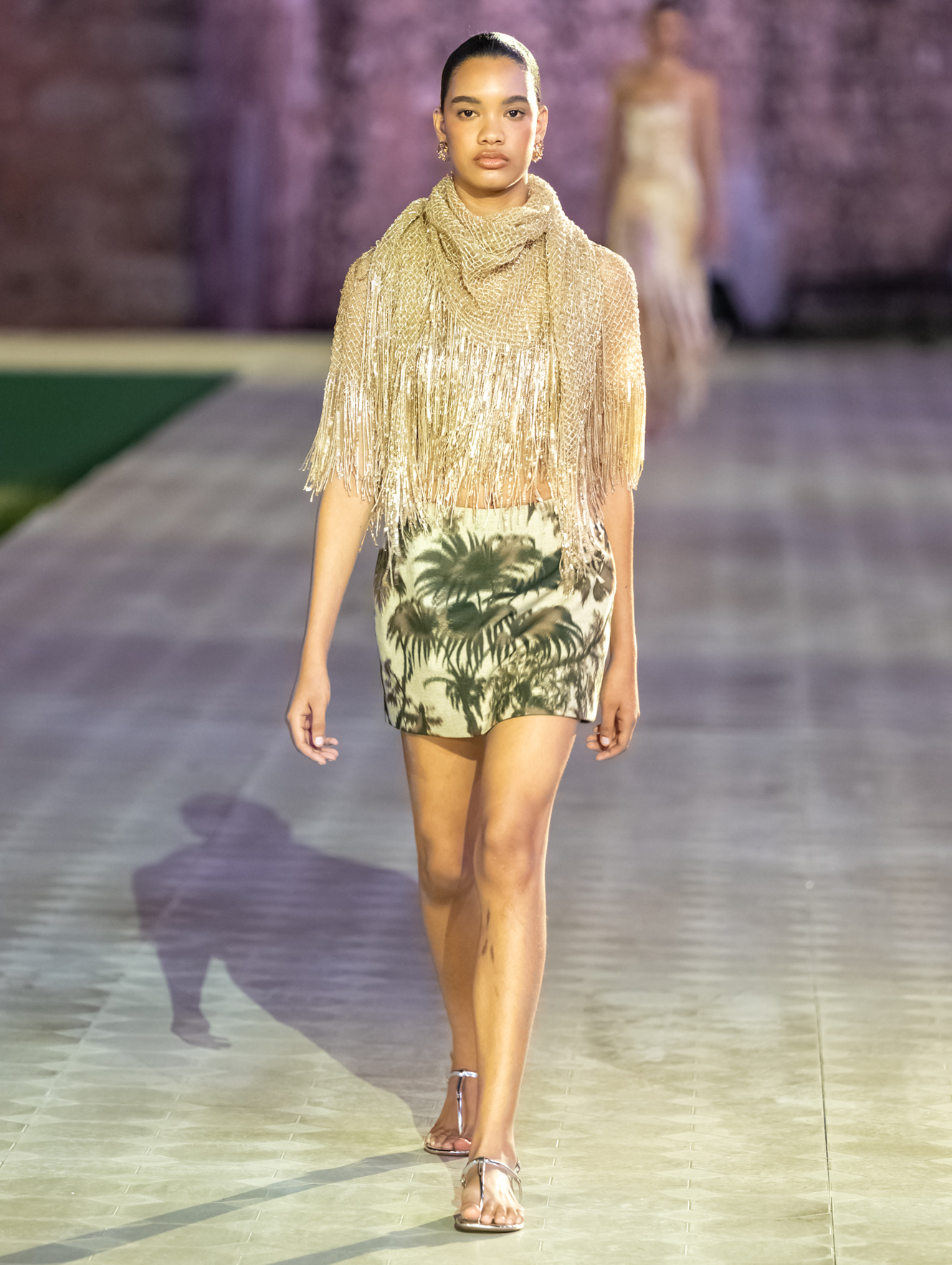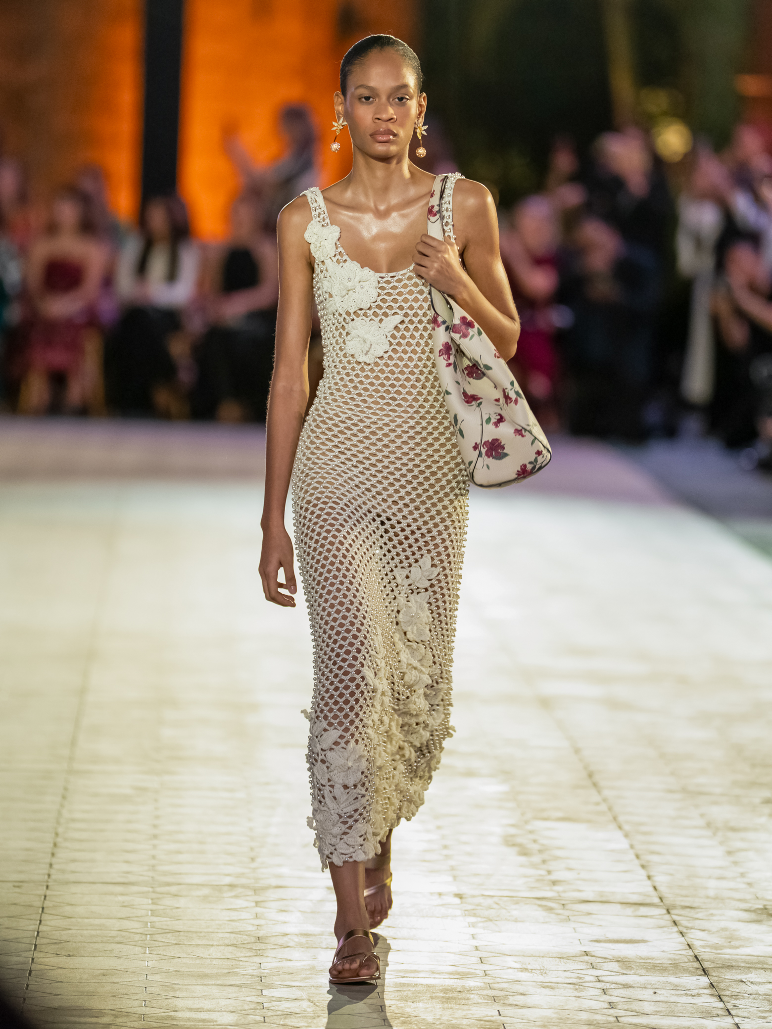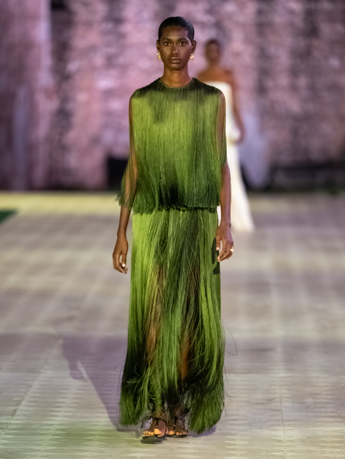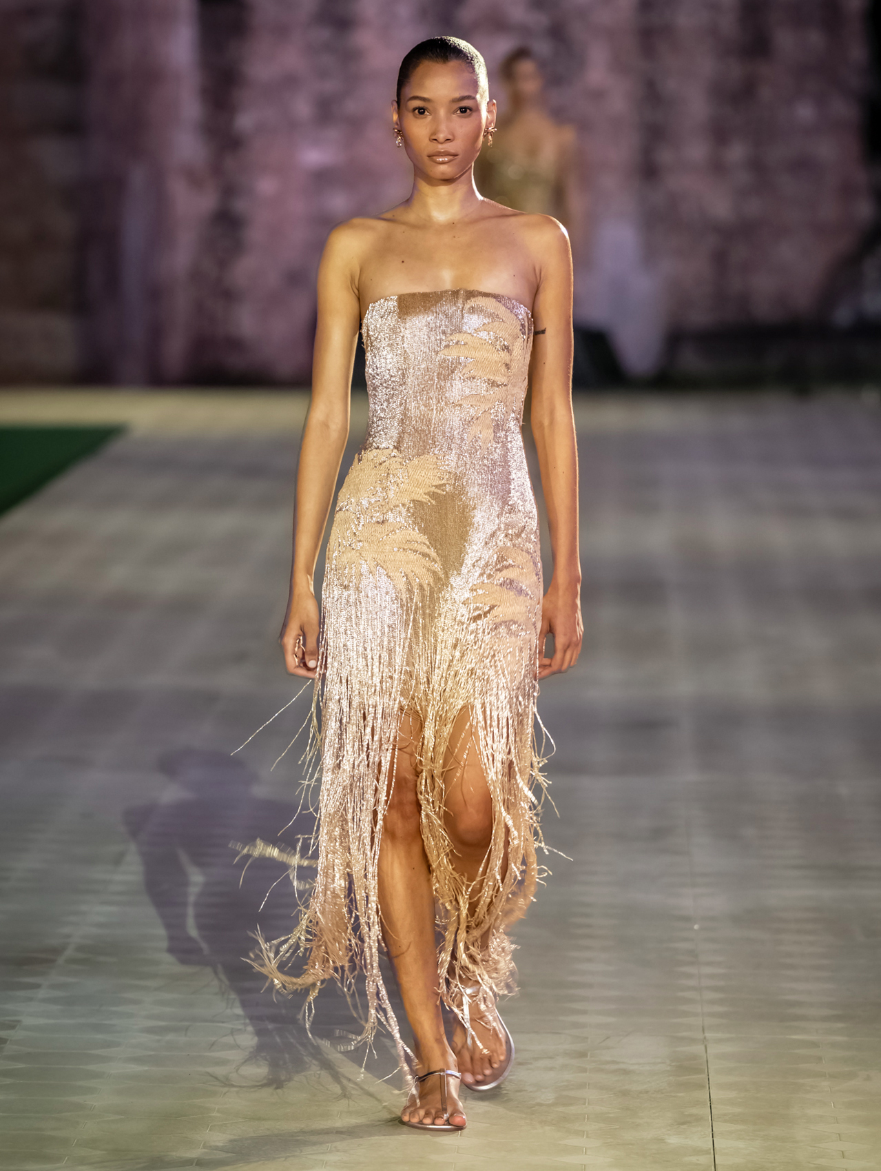 两款繁复华丽的金色马赛克造型,由手工剪裁并接的独立方形贴片打造而成,与数款丝绸流苏廓形单品形成鲜明对比后者线条灵动飘逸,极富动态美感,呈现甜椒红,橄榄绿与牡蛎灰等雅致色调。多米尼加本土花卉纹样被运用于绗缝真丝日装,晕染府绸与镂空蕾丝连衣裙,以及金属质感提花流苏围巾款式之中。精细的刺绣花卉同样呈现于一袭拖地长袍,两款迷你连衣裙,并延伸至闭秀礼服长裙造型,为整个系列呈现出完整而统一的视觉表达。