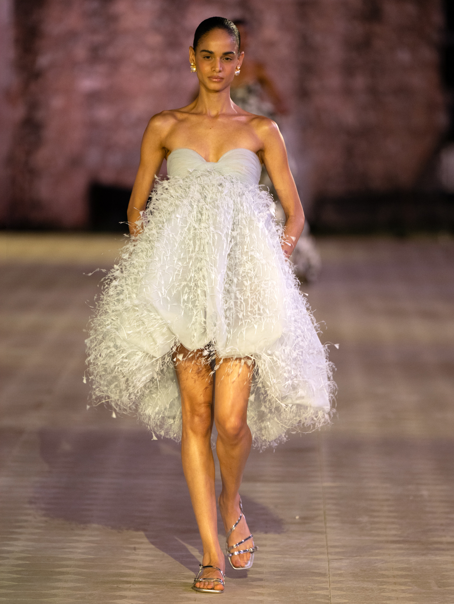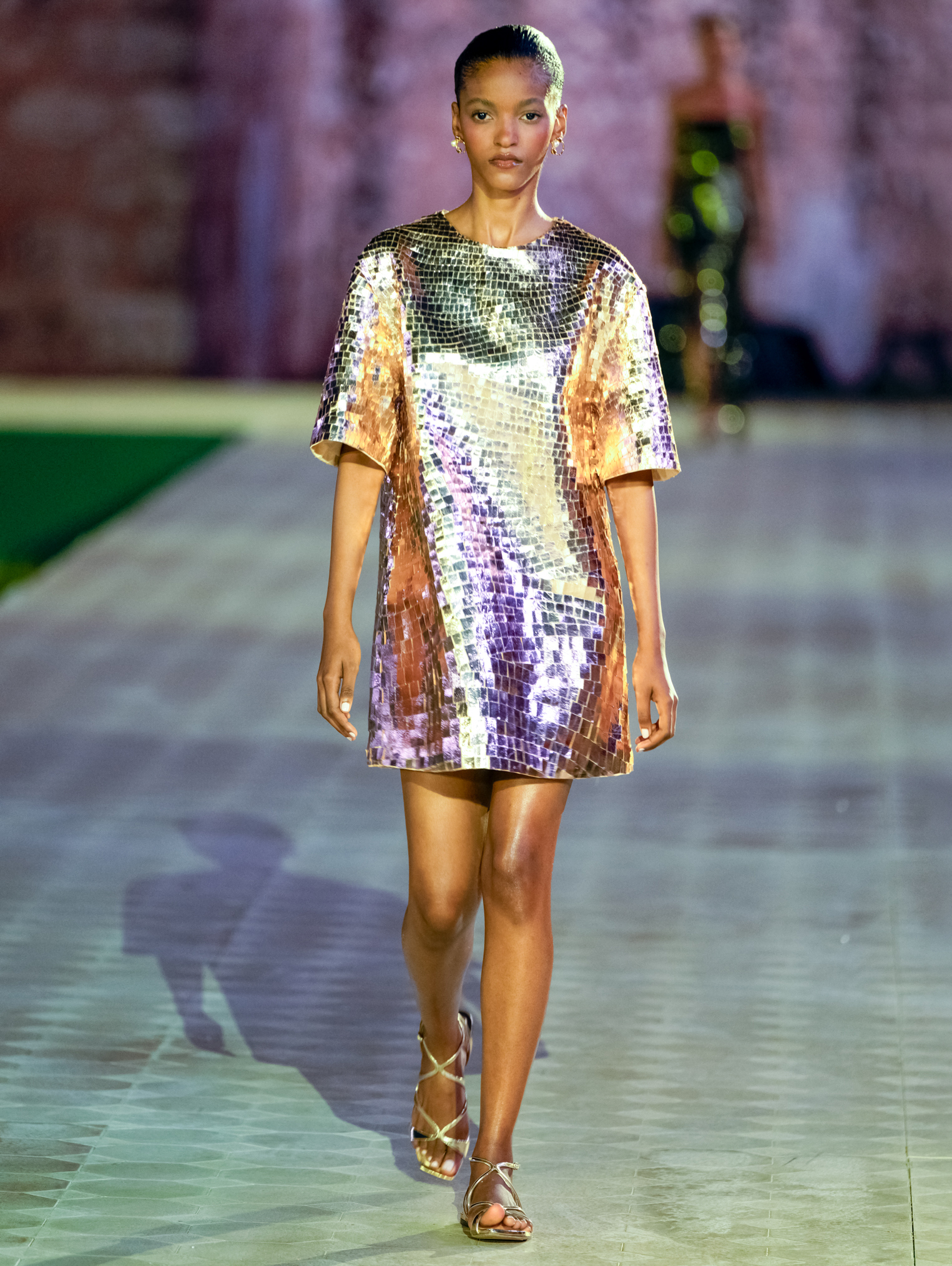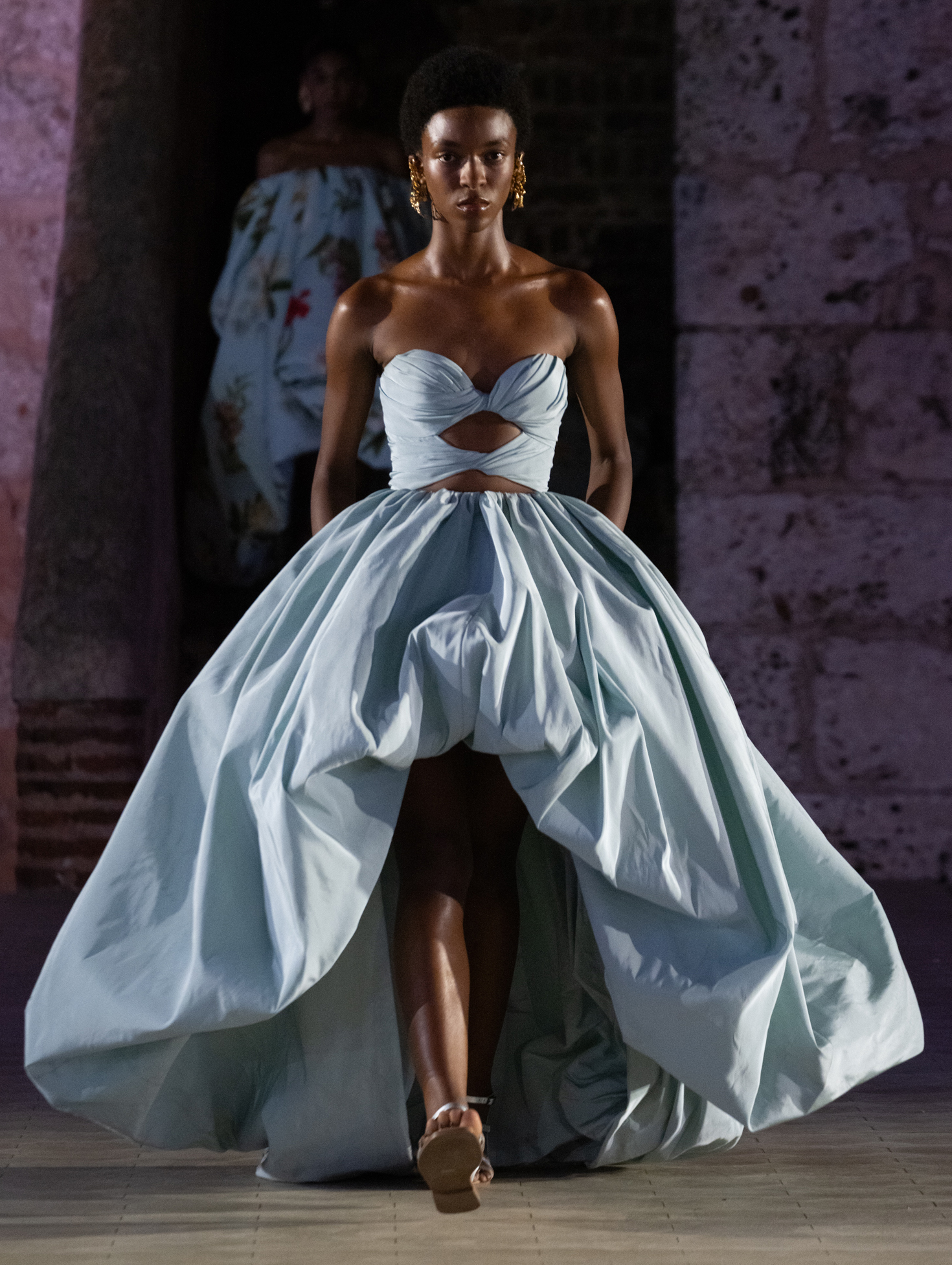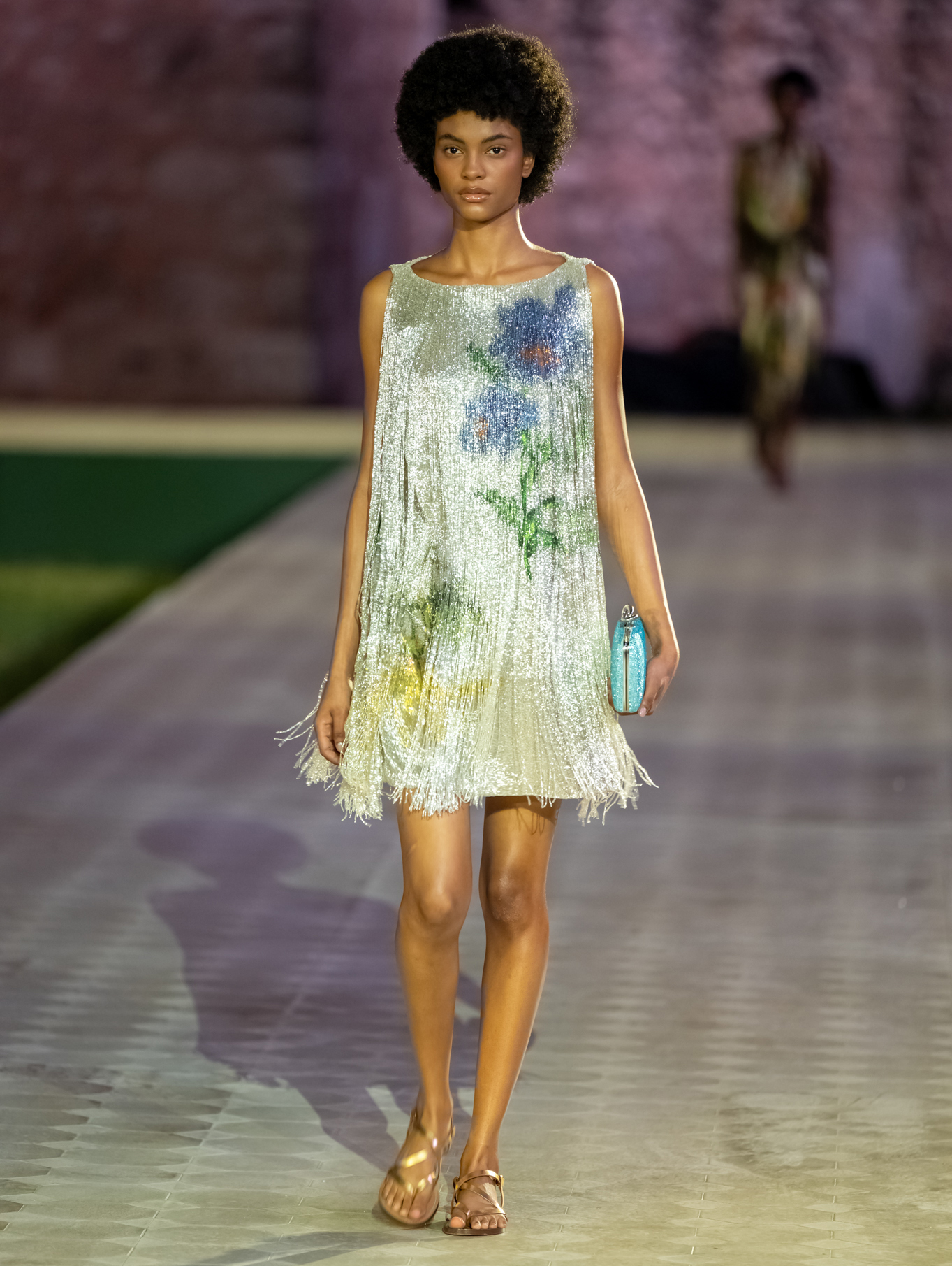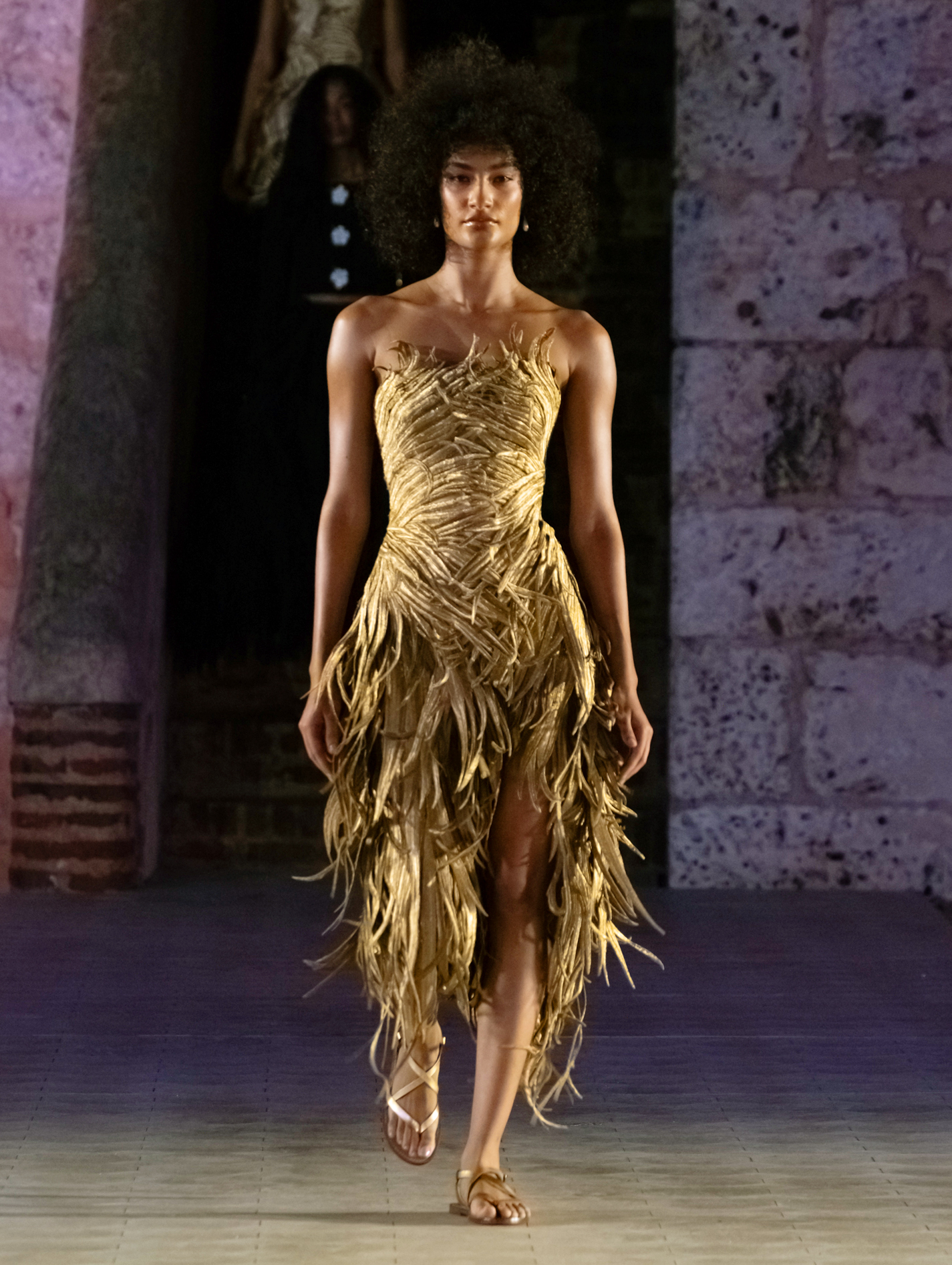 两款繁复华丽的金色马赛克造型,由手工剪裁并接的独立方形贴片打造而成,与数款丝绸流苏廓形单品形成鲜明对比后者线条灵动飘逸,极富动态美感,呈现甜椒红,橄榄绿与牡蛎灰等雅致色调。多米尼加本土花卉纹样被运用于绗缝真丝日装,晕染府绸与镂空蕾丝连衣裙,以及金属质感提花流苏围巾款式之中。精细的刺绣花卉同样呈现于一袭拖地长袍,两款迷你连衣裙,并延伸至闭秀礼服长裙造型,为整个系列呈现出完整而统一的视觉表达。