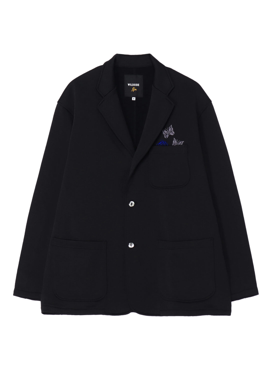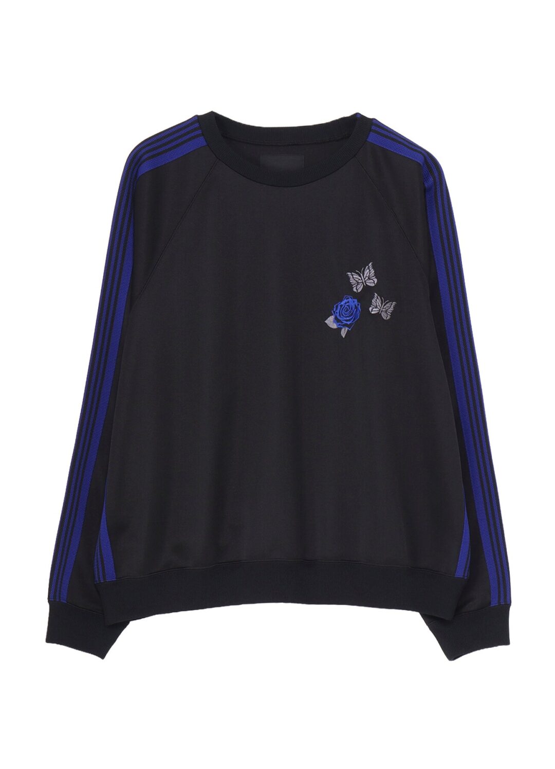 本次合作以 WILDSIDE 标志性的「薔薇」与 NEEDLES 象征性的「蝴蝶」为核心视觉元素,通过刺绣形式大胆呈现,并以鲜明的蓝色作为点睛配色。值得注意的是 NEEDLES 经典蝴蝶的刺绣位置被重新编排,仿佛两只蝴蝶环绕薔薇飞舞,强化了联名叙事与视觉层次,使图案本身成为两大品牌精神交汇的象征。